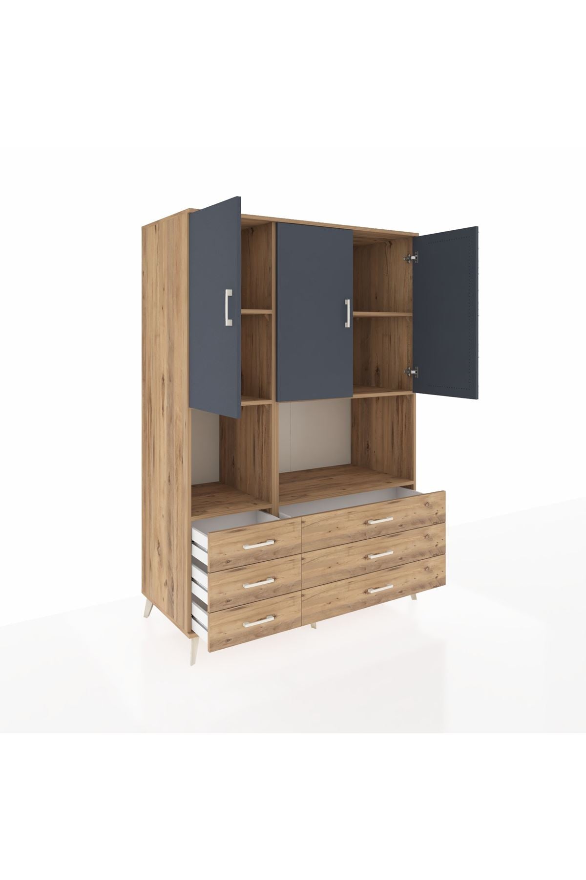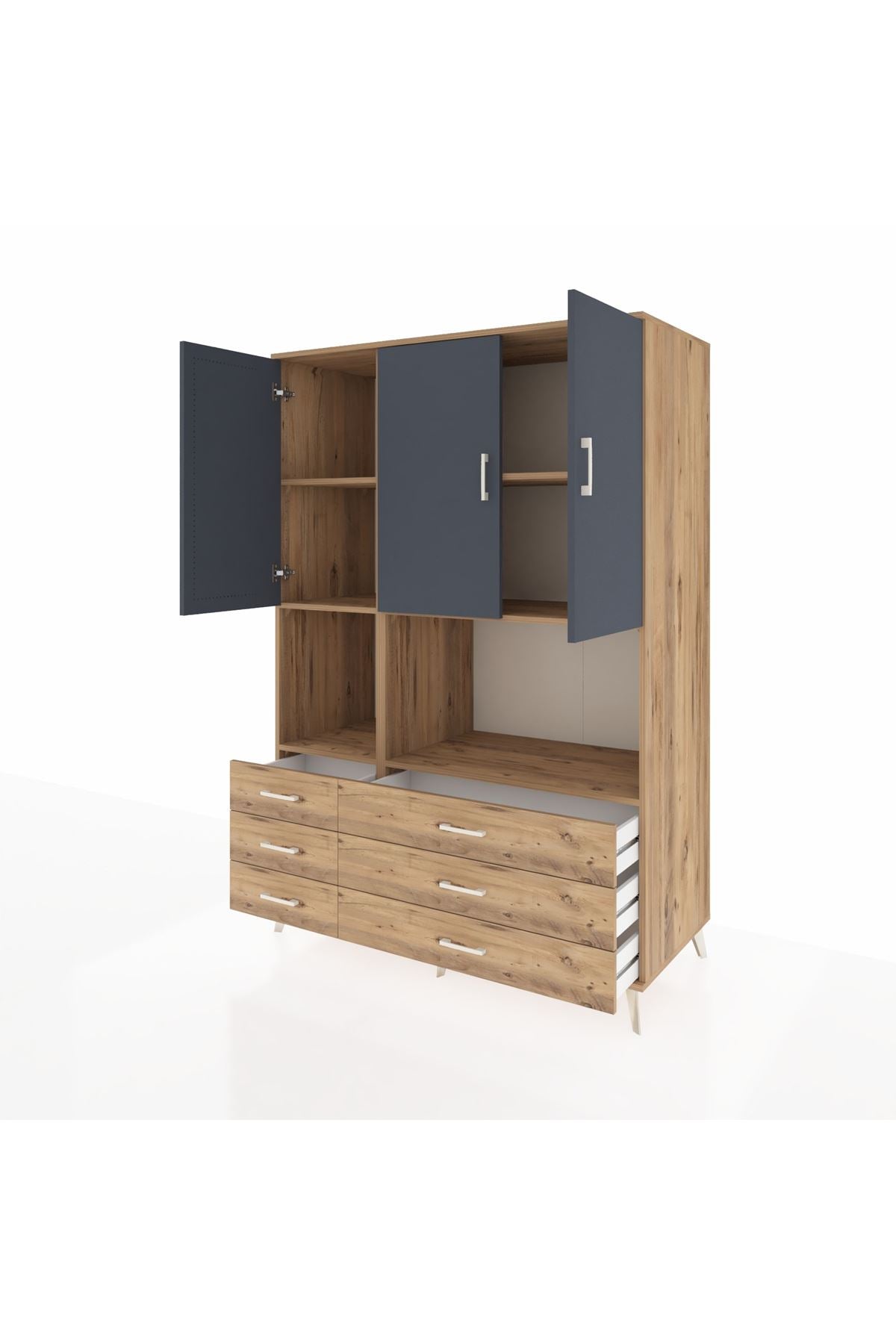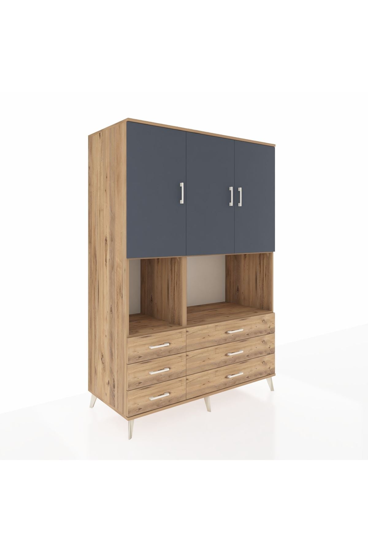 Üç kapaklı yapısı, dolabın içerisine kolay erişim sunarken; çam ve antrasit renk uyumu ile dekorasyonunuza sıcaklık ve modernlik katar.