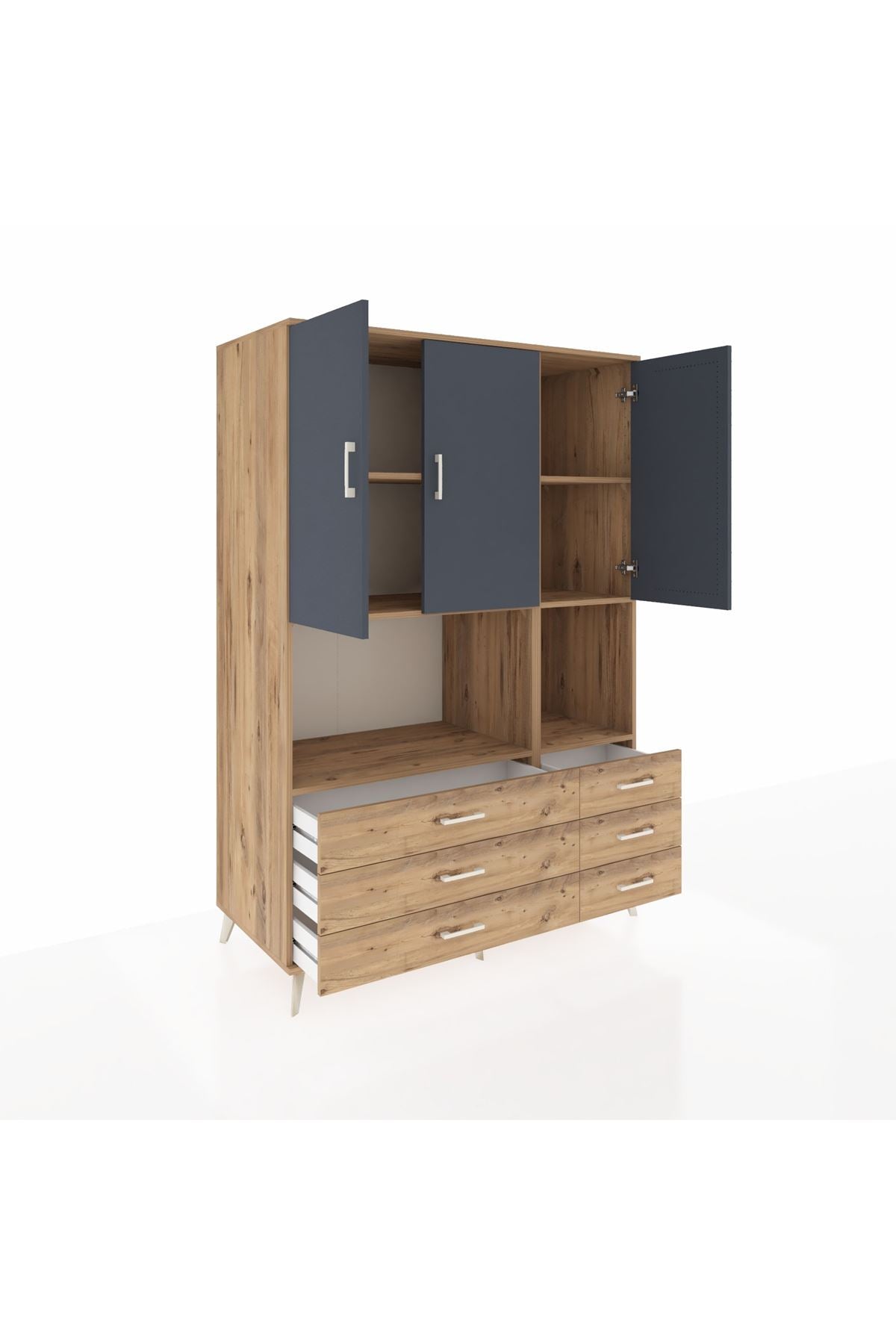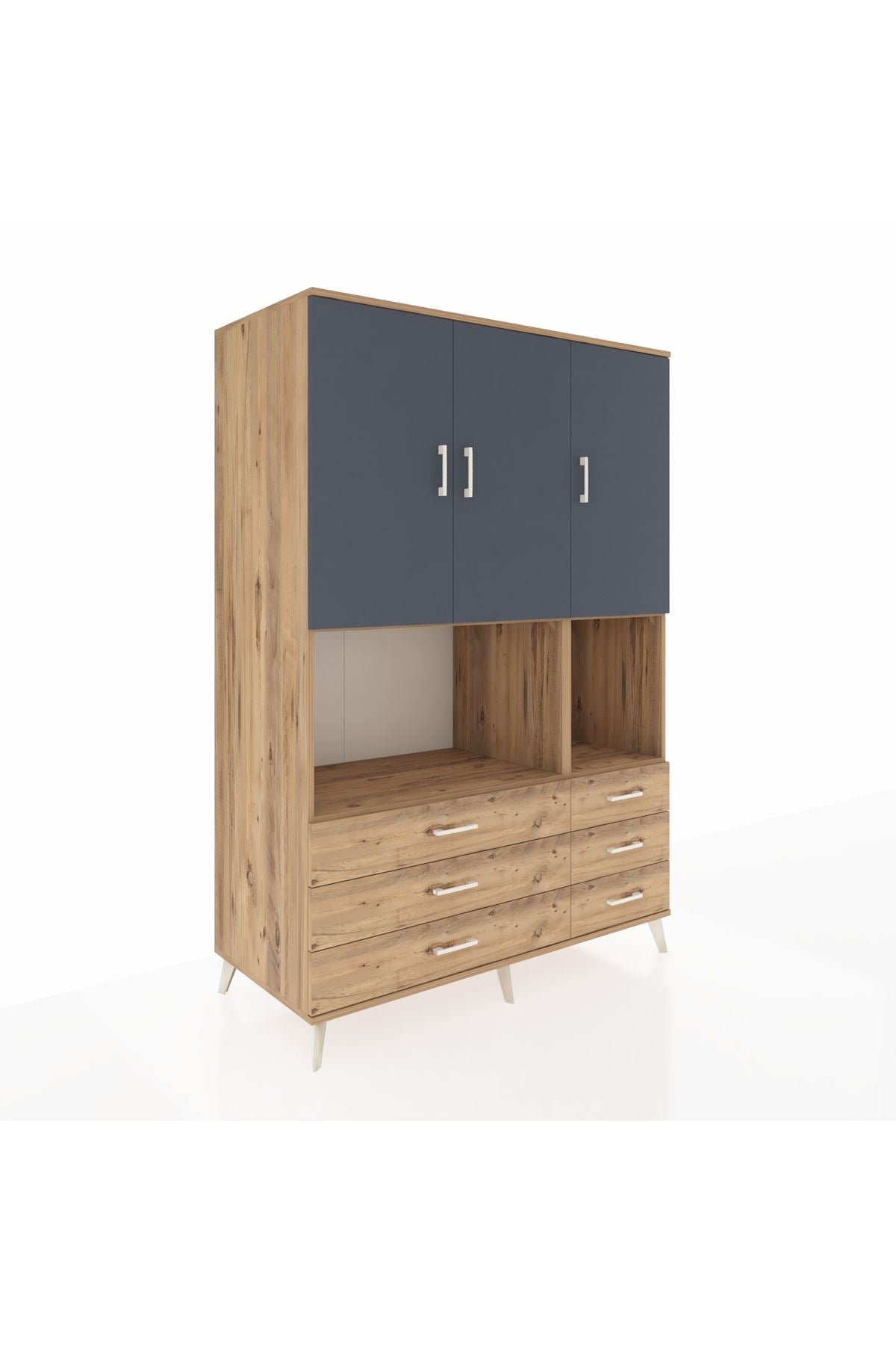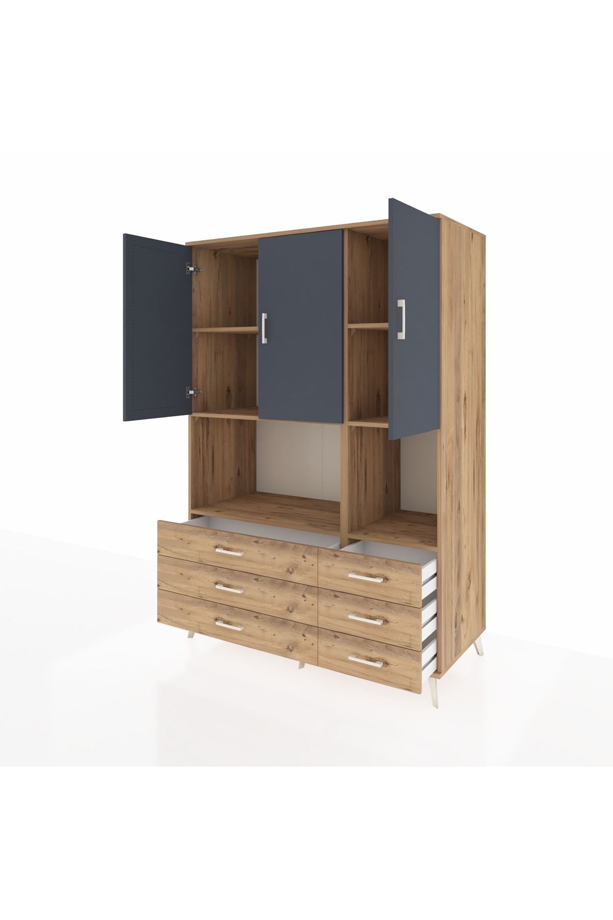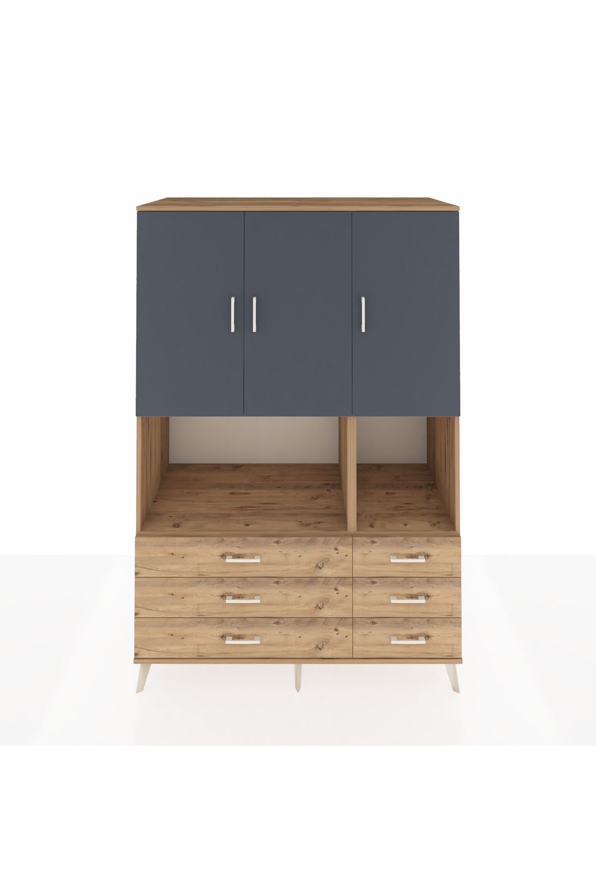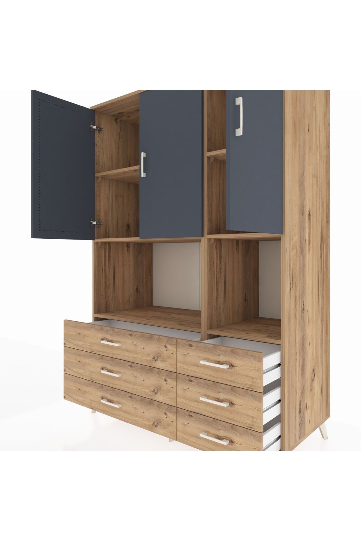 🪐 Kronos Dolap 6 Raflı 6 Çekmeceli 3 Kapaklı 132x59x195 Çam-Antrasit/Çam ile Düzen Sanatı!