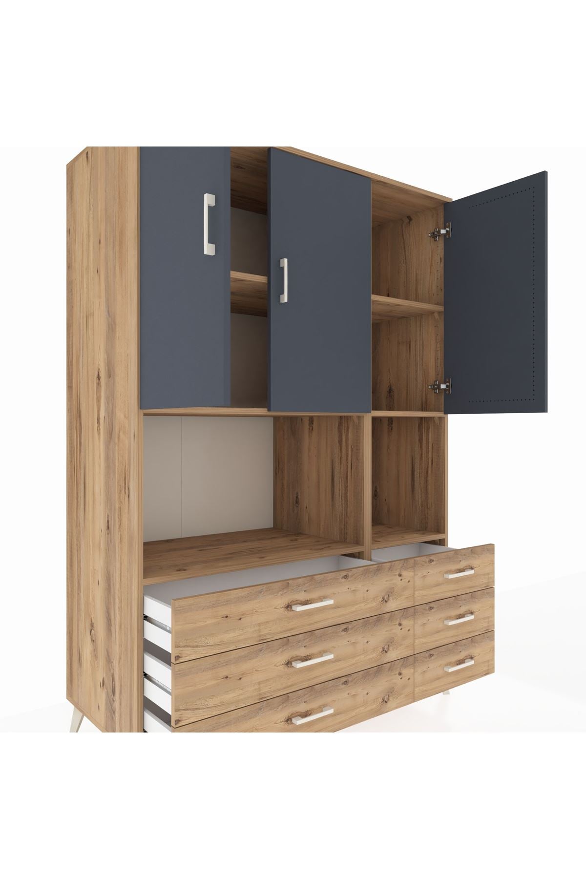 Kronos Dolap 6 Raflı 6 Çekmeceli 3 Kapaklı 132x59x195 Çam-Antrasit/Çam