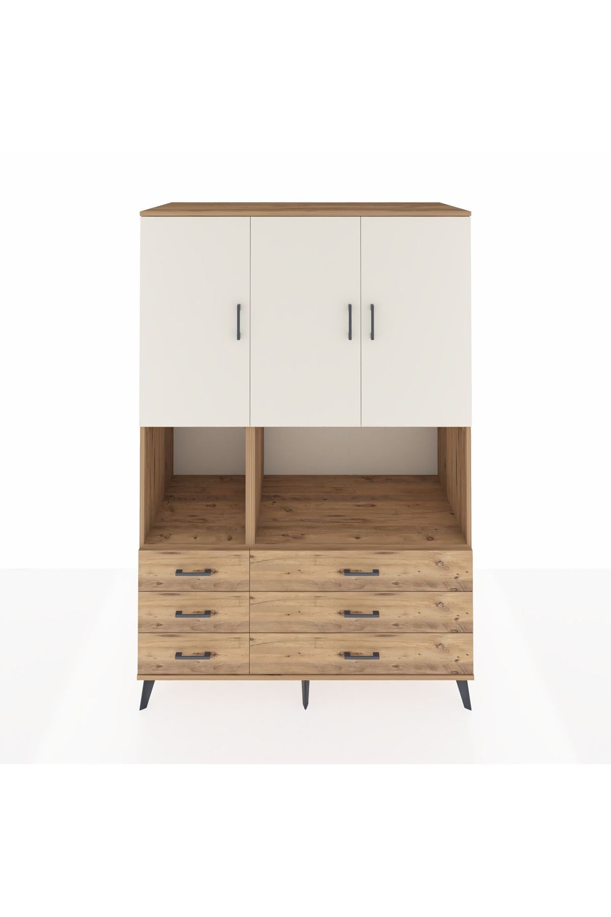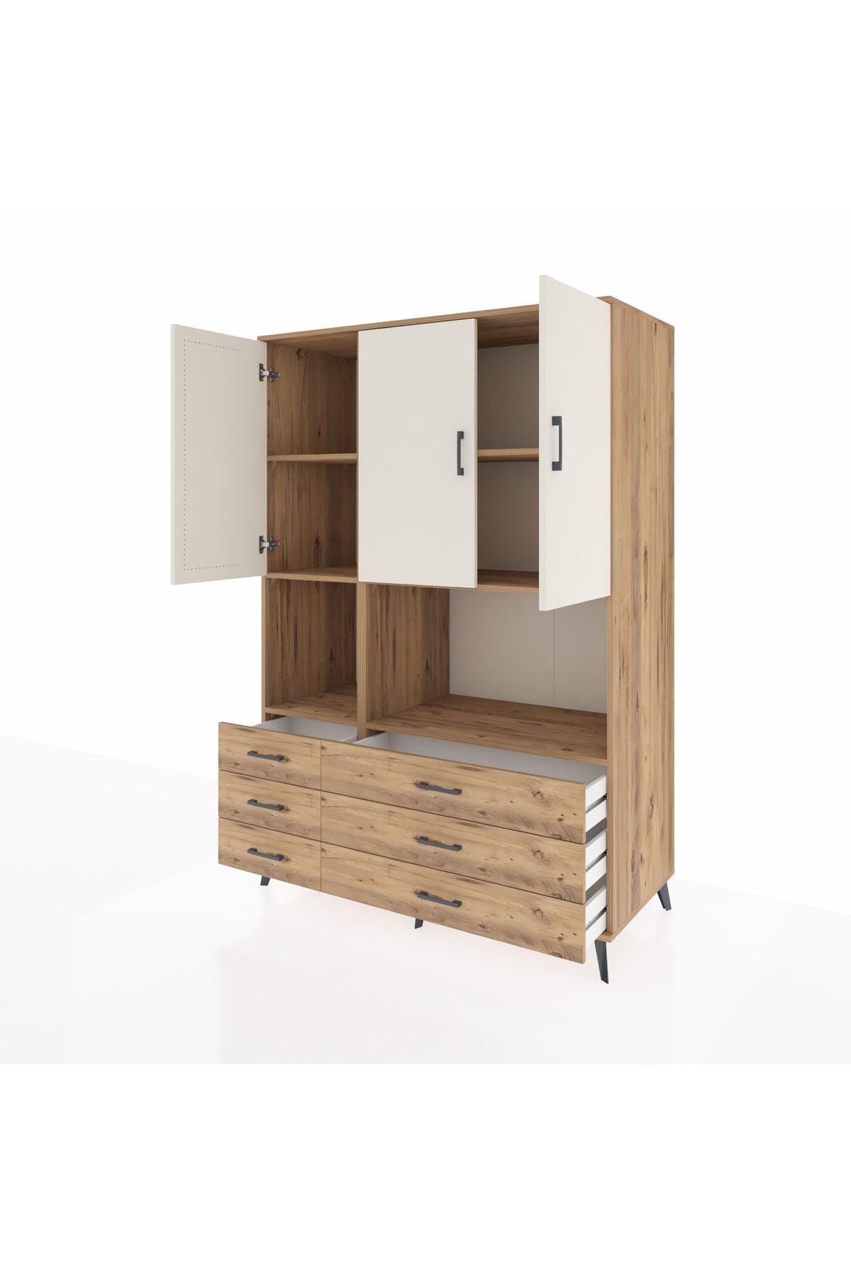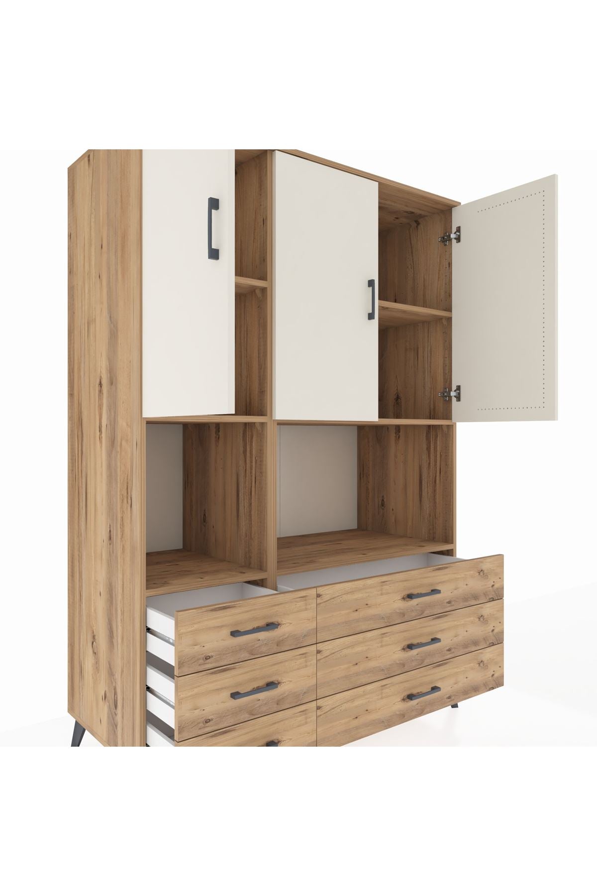 🪵 Kronos Dolap 6 Raflı 6 Çekmeceli 3 Kapaklı 132x59x195 Çam-Aytaşı/Çam