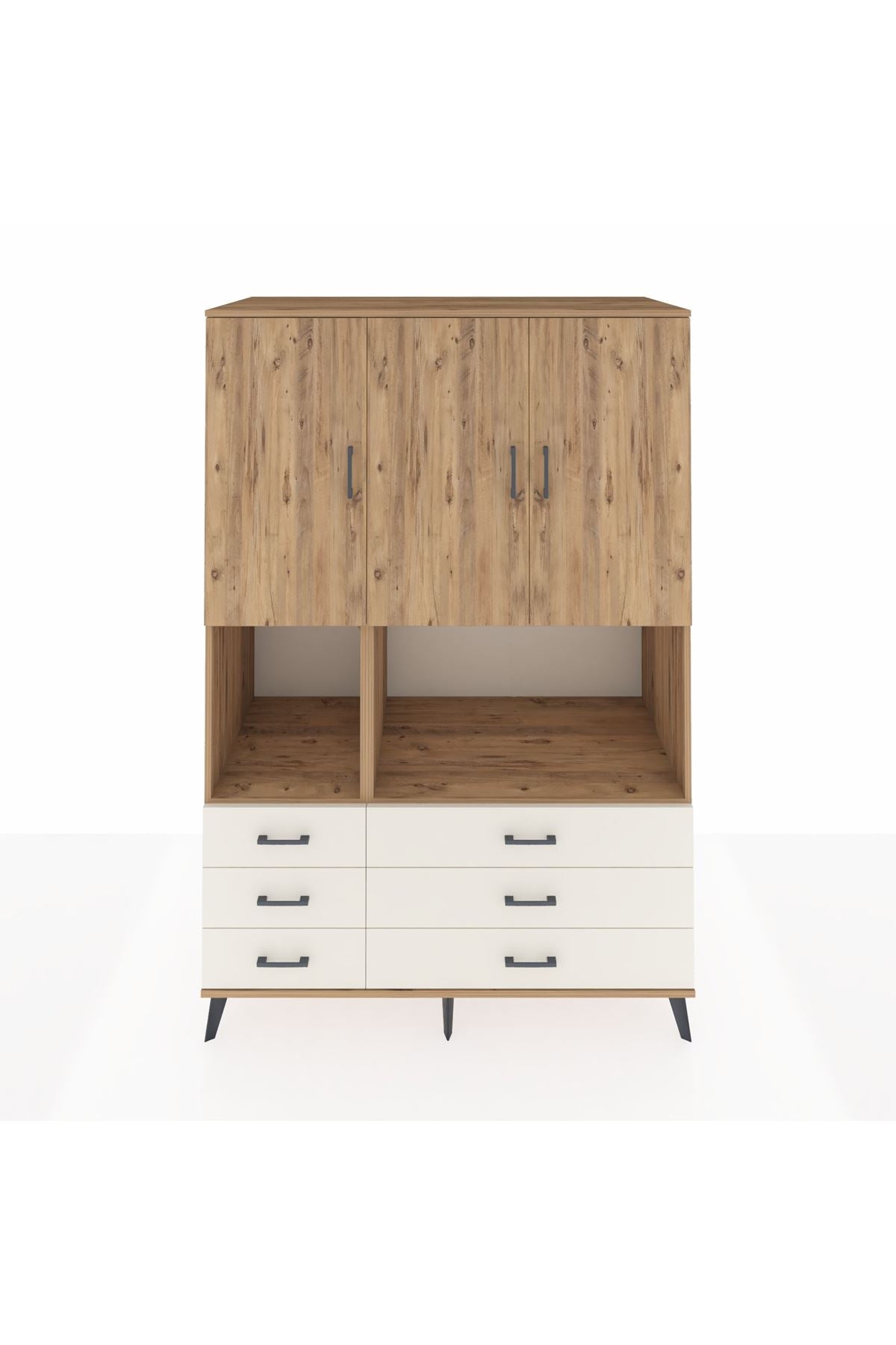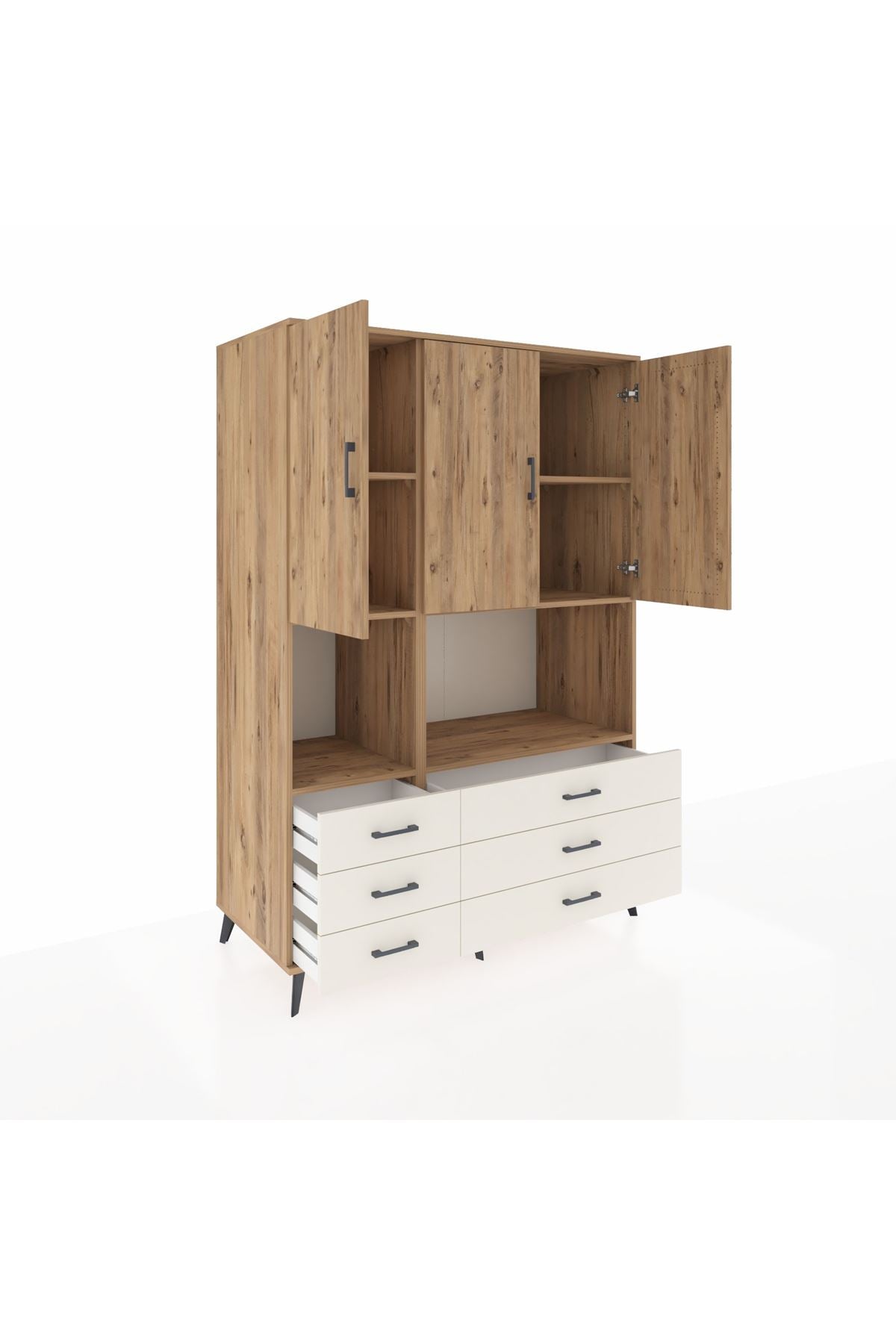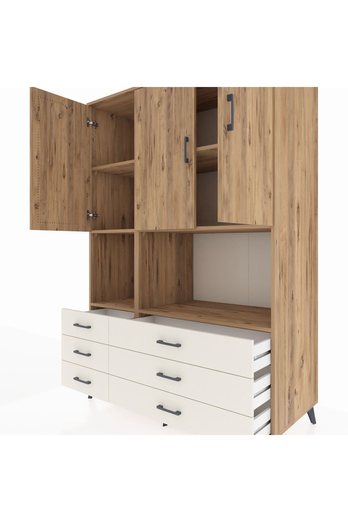 🌟 Kronos Dolap 6 Raflı 6 Çekmeceli 3 Kapaklı 132x59x195 Çam-Çam/Aytaşı