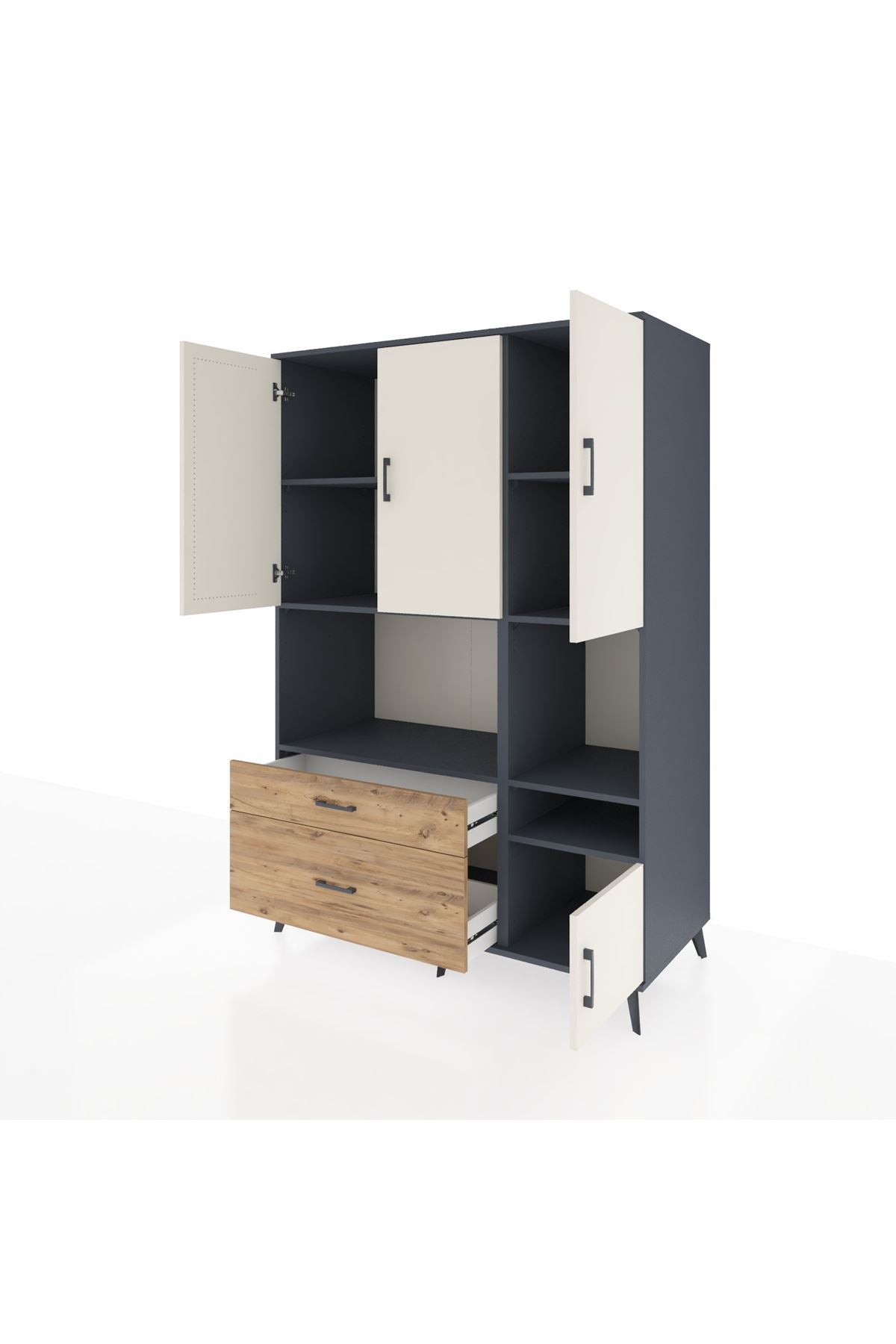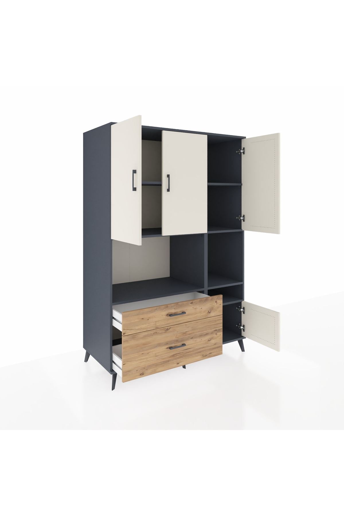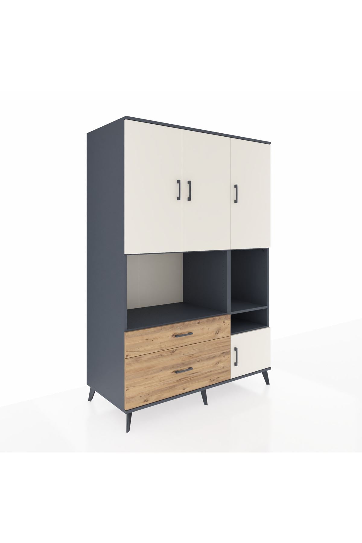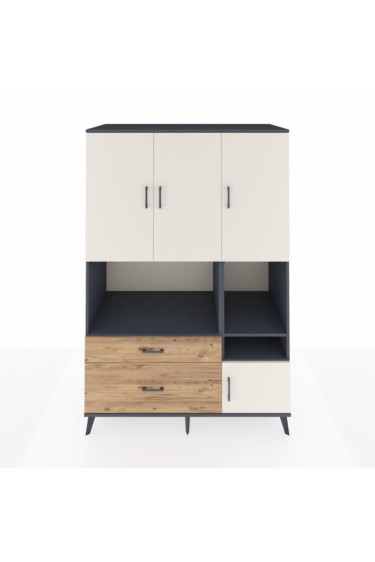 Eviniz veya ofisiniz için maksimum depolama gücü arıyorsanız, 132x59x195 cm ölçülerindeki Kronos Dolap tam size göre! 👏 Antrasit ve aytaşı/çam renk kombinasyonu, her alana modern bir hava katıyor; fonksiyonelliğiyle hem göze hem ihtiyaca hitap ediyor.