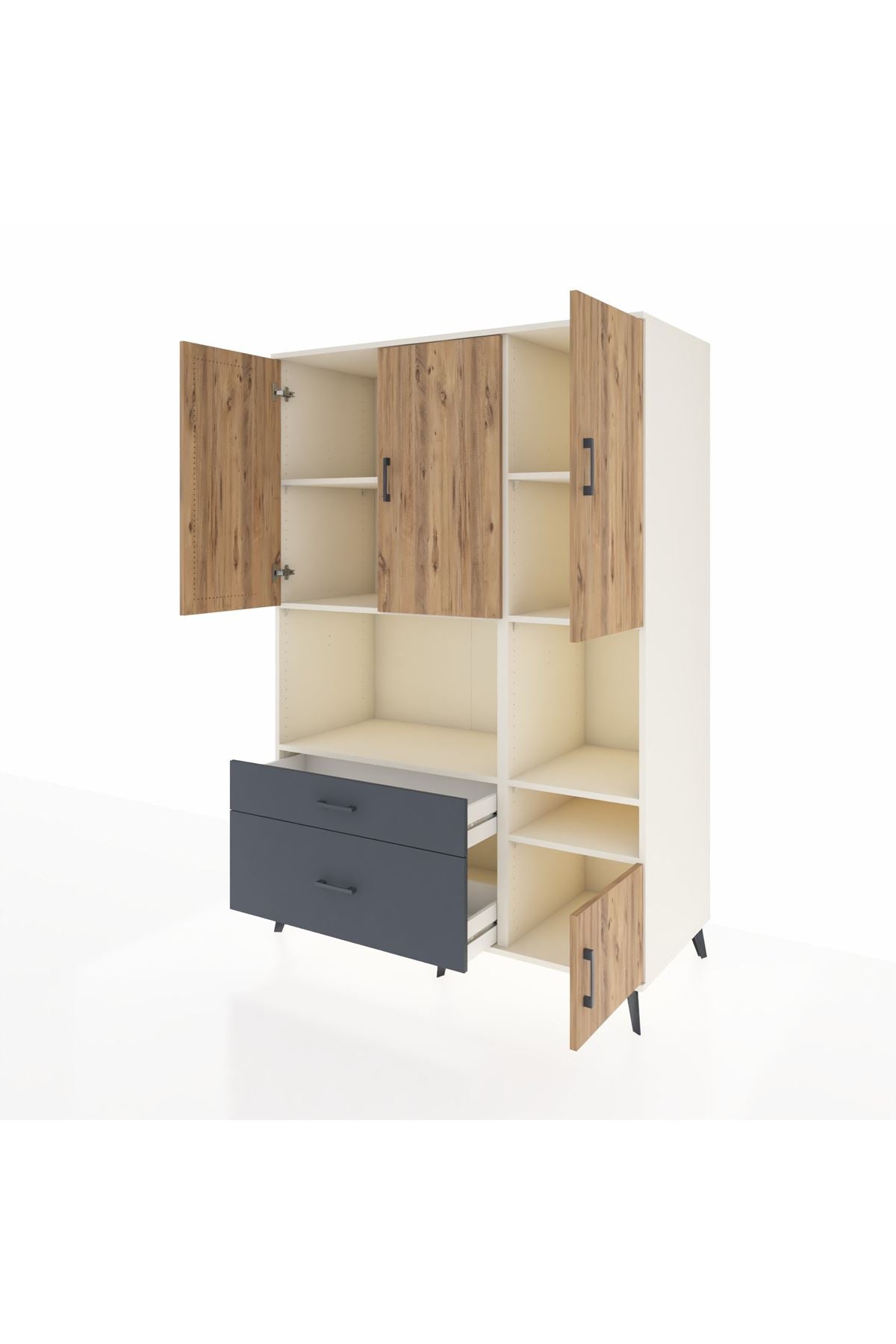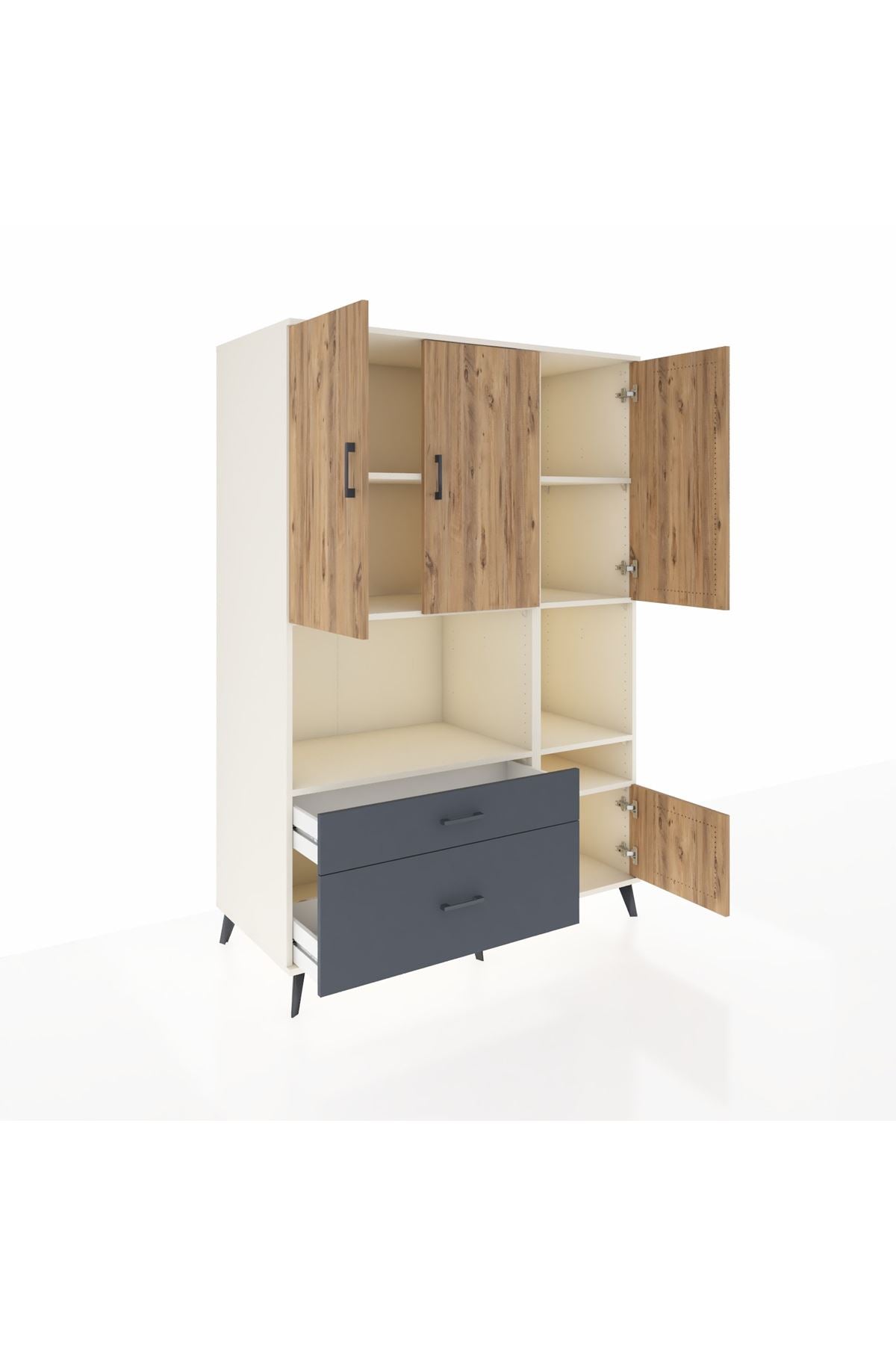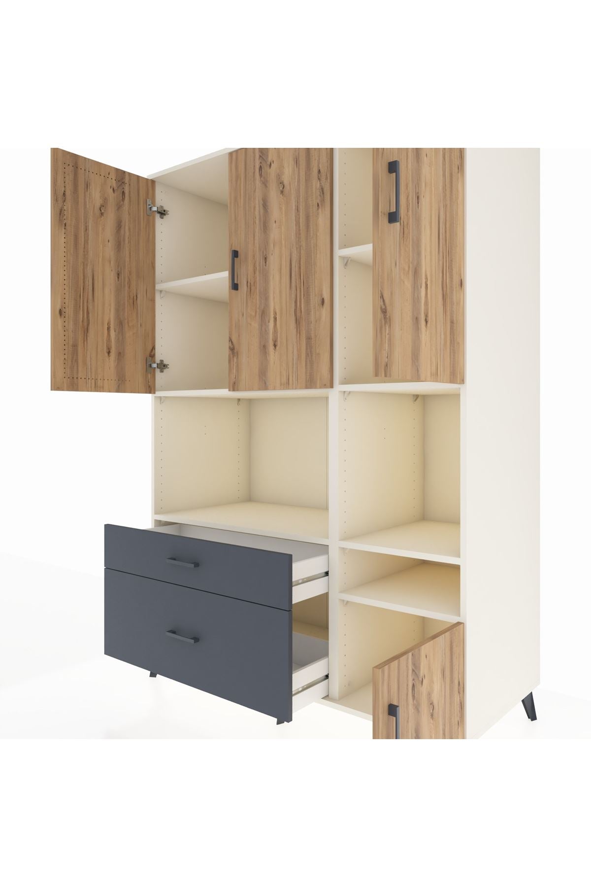 🪐 Kronos Dolap 7 Raflı 2 Çekmeceli 4 Kapaklı 132x59x195 Aytaşı-Çam/Antrasit ile yaşam alanınıza düzenin ve zarafetin en yeni yüzünü getirin!