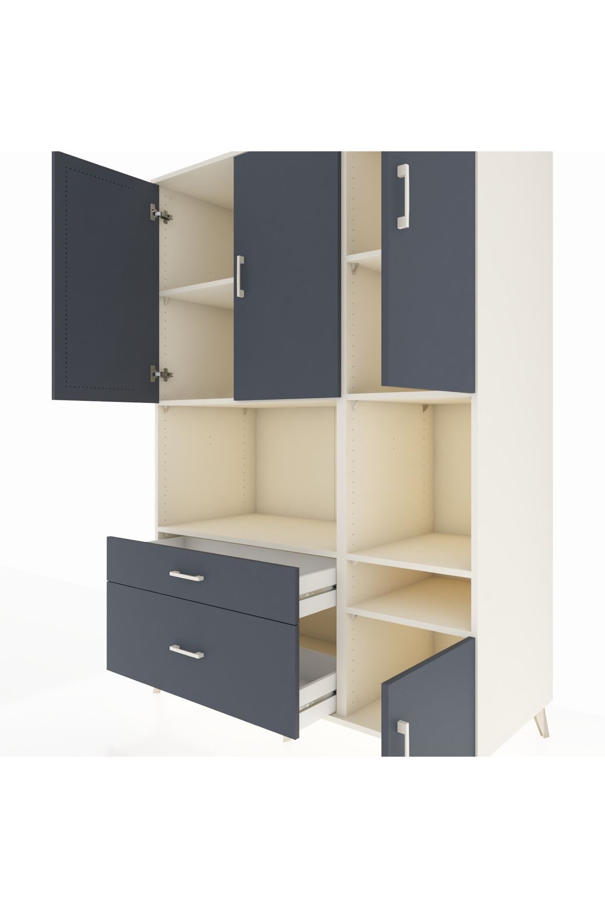 Kronos modeli, Artemis Koleksiyonu’nun “Zaman” serisinden ilham alarak hem zamansız bir estetik hem de üstün işlevsellik sunar. 7 rafı, 2 çekmecesi ve 4 kapaklı yapısı ile her eşyanıza yer açar; pratik kullanım kolaylığı sağlar.