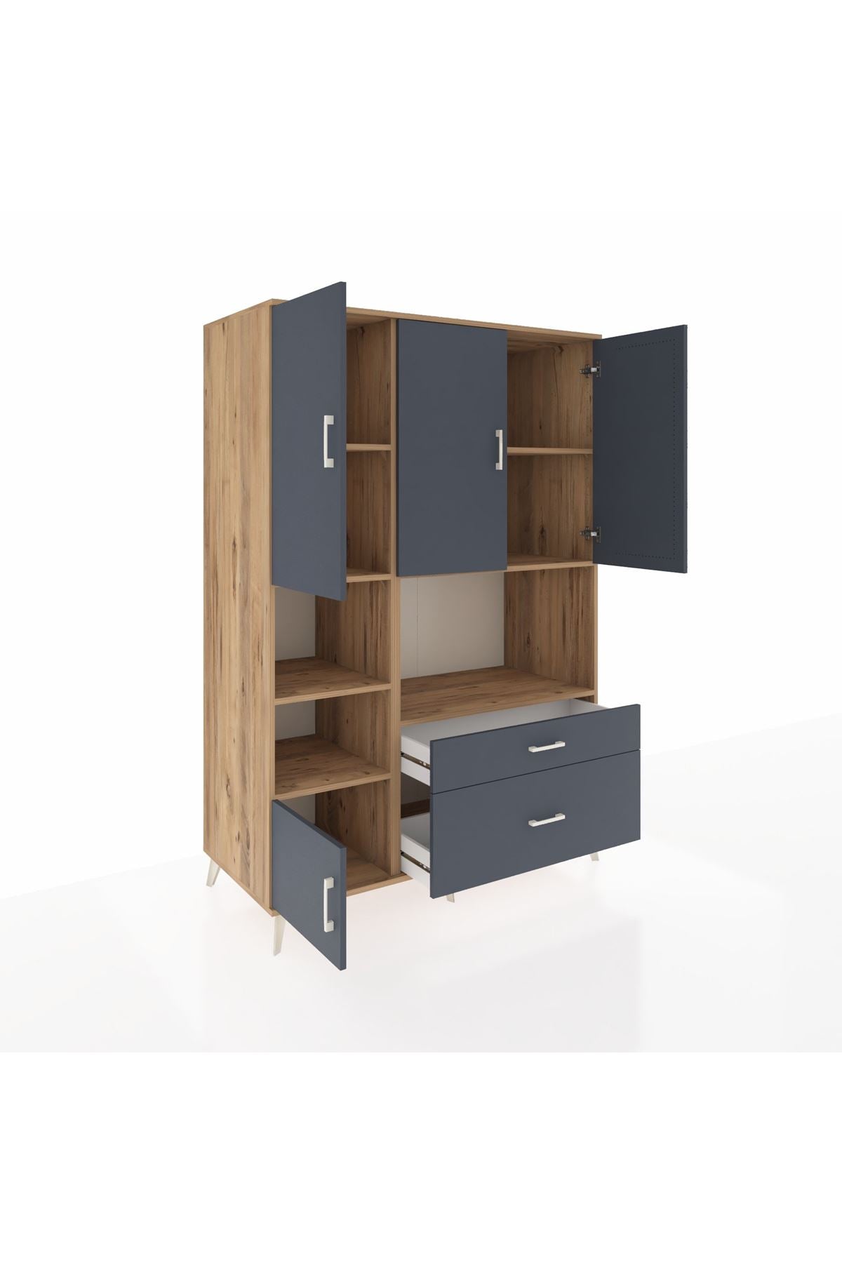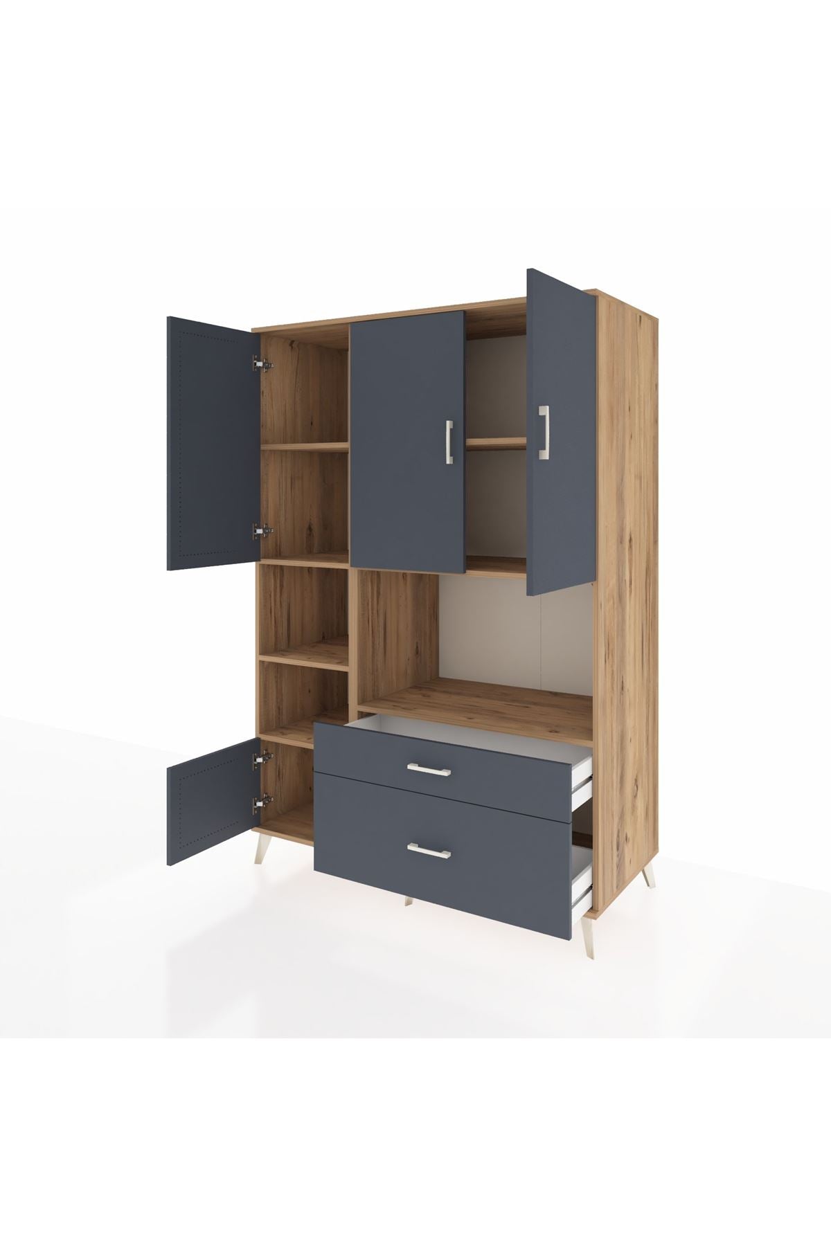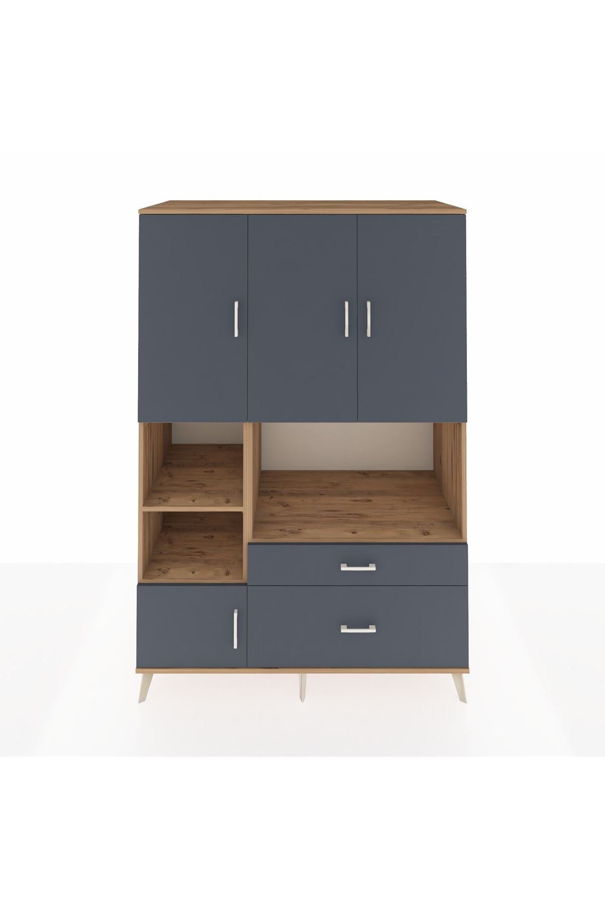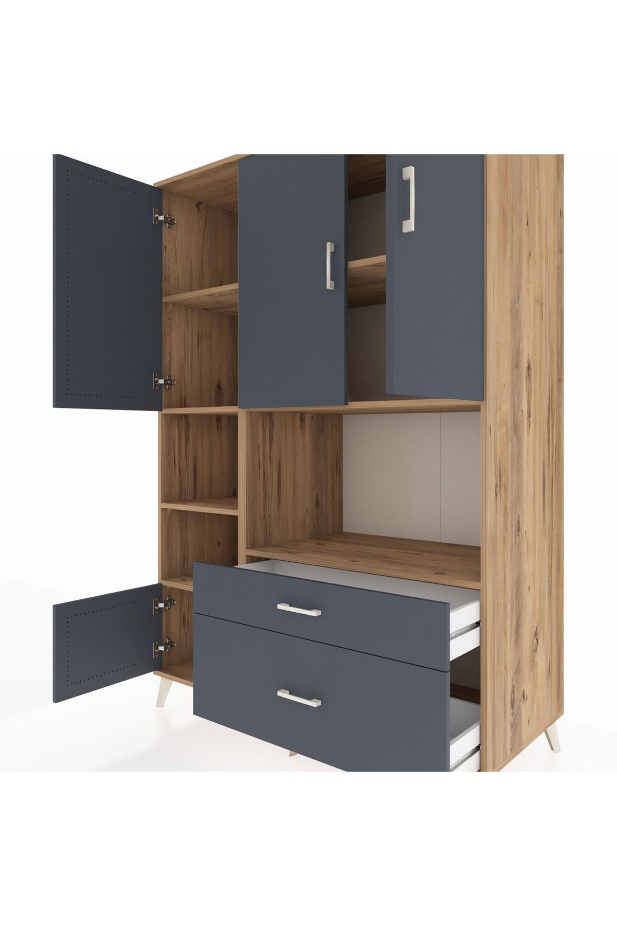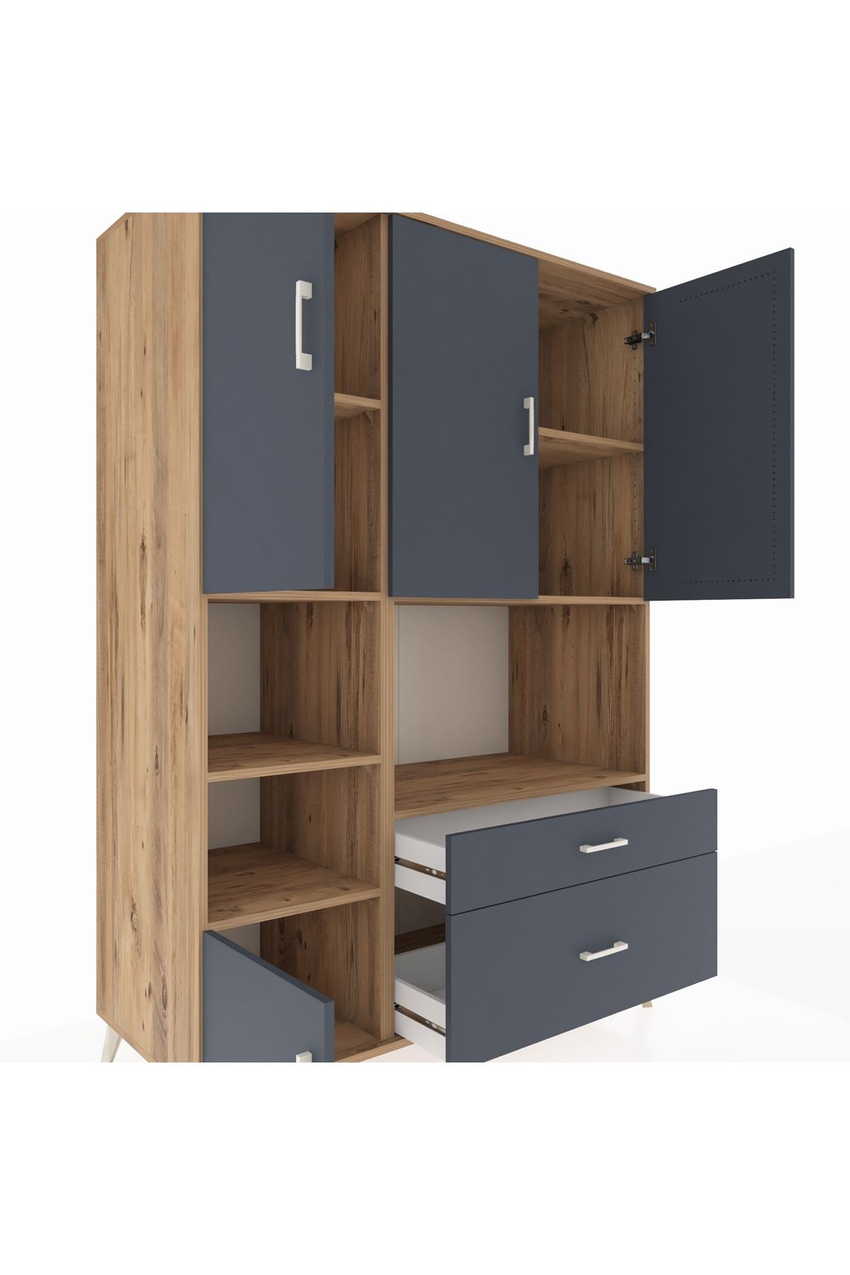 Dolabımızda 7 adet geniş raf, 2 kullanışlı çekmece ve 5 sağlam kapak bulunur 📚🗄️ Her modülde metal ayaklar ve metal kulplar ile yüksek dayanıklılık ve uzun ömürlü kullanım garanti edilir 🛠️