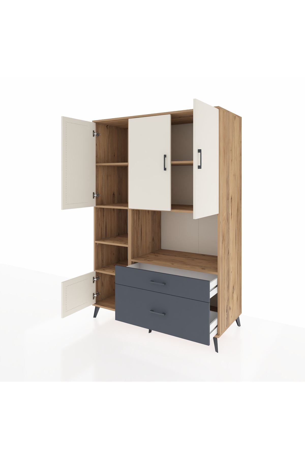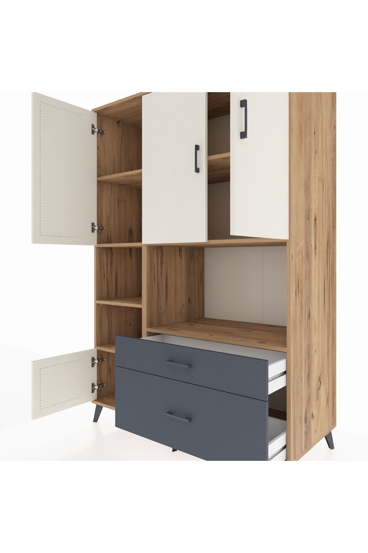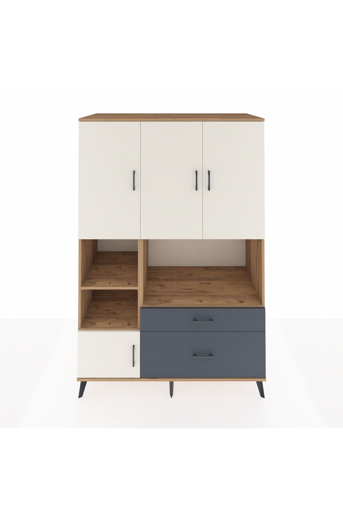 Geniş iç hacmiyle 7 adet raf, 2 çekmece ve 5 kapaklı depolama alanı sunuyor. Metal ayaklar ve modern metal kulplar sayesinde dayanıklılığı ve zarafeti bir arada yaşayın. Kastamonu Entegre 1. sınıf suntalam gövdesi, çizilmelere ve darbelere karşı ekstra dirençli. Rakiplerinden farklı olarak 1.2 mm kalınlığında kenar bandı ile uzun ömürlü kullanım sağlar.
