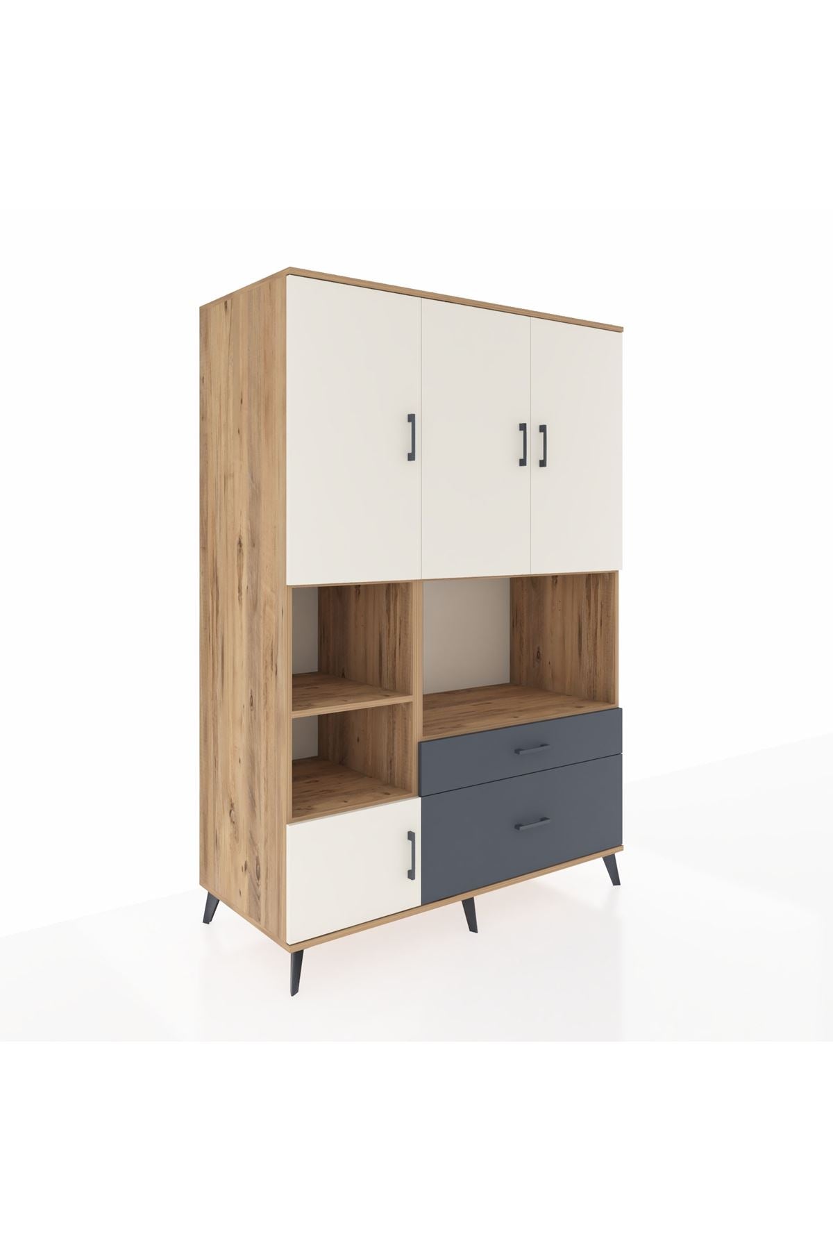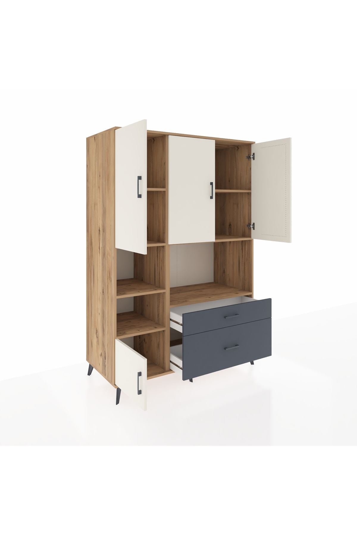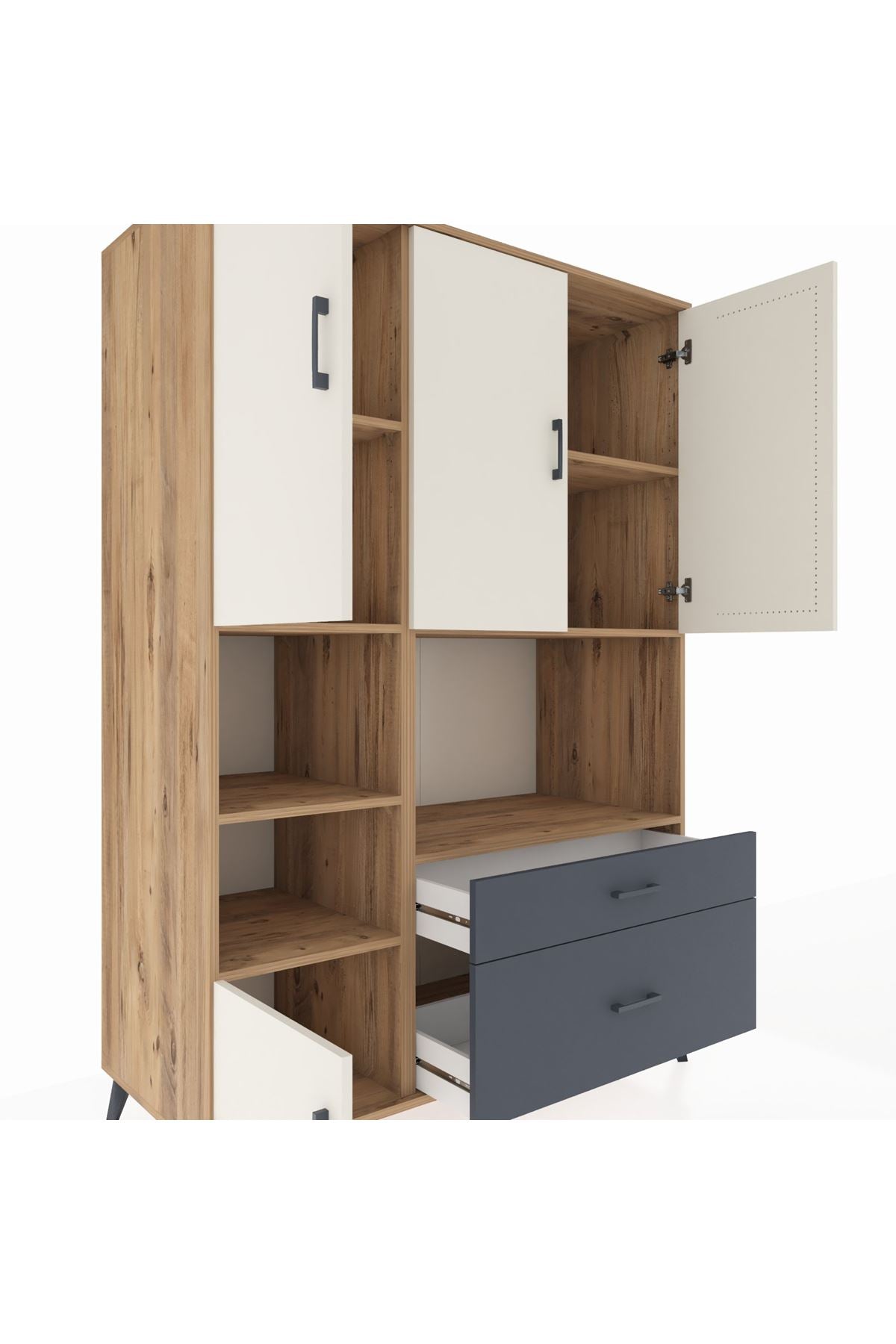 Geniş iç hacmiyle 7 adet raf, 2 çekmece ve 5 kapaklı depolama alanı sunuyor. Metal ayaklar ve modern metal kulplar sayesinde dayanıklılığı ve zarafeti bir arada yaşayın. Kastamonu Entegre 1. sınıf suntalam gövdesi, çizilmelere ve darbelere karşı ekstra dirençli. Rakiplerinden farklı olarak 1.2 mm kalınlığında kenar bandı ile uzun ömürlü kullanım sağlar.