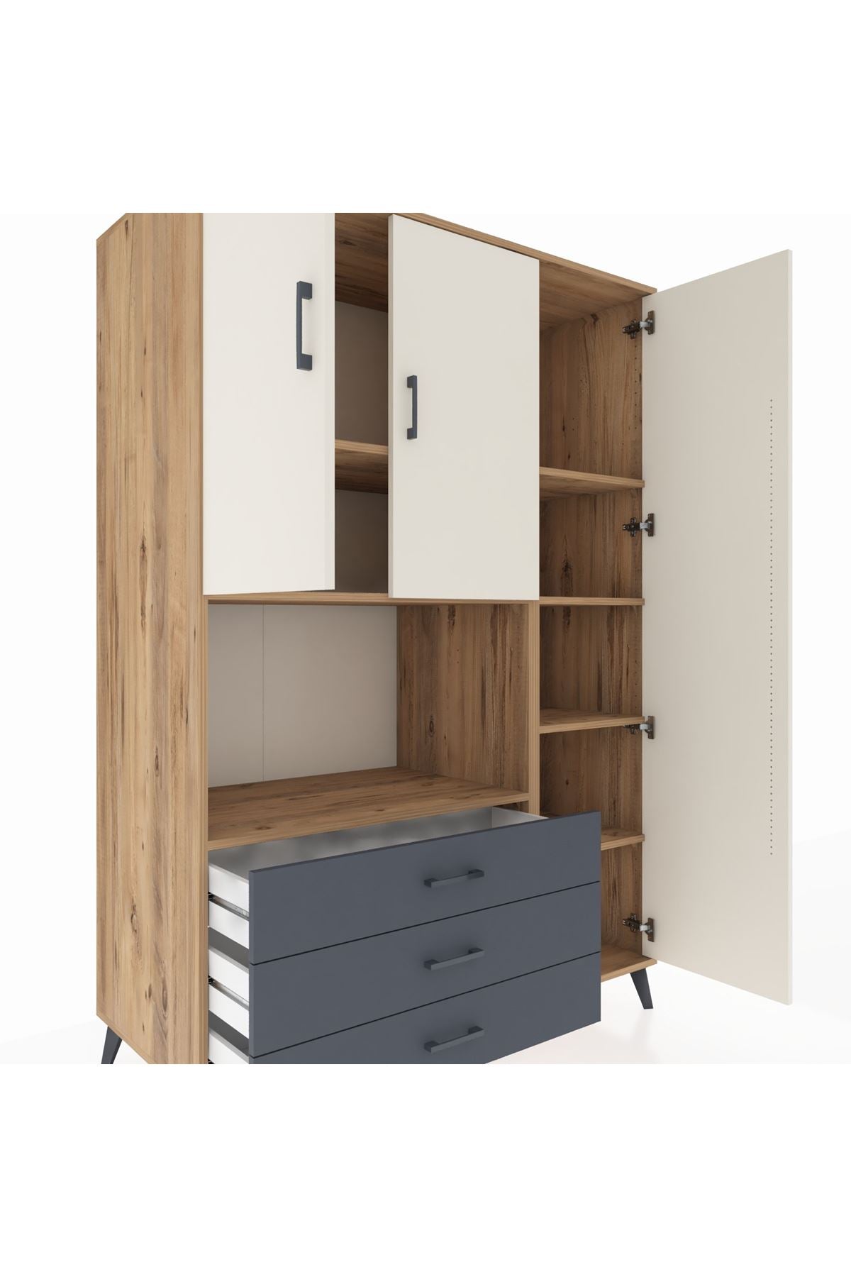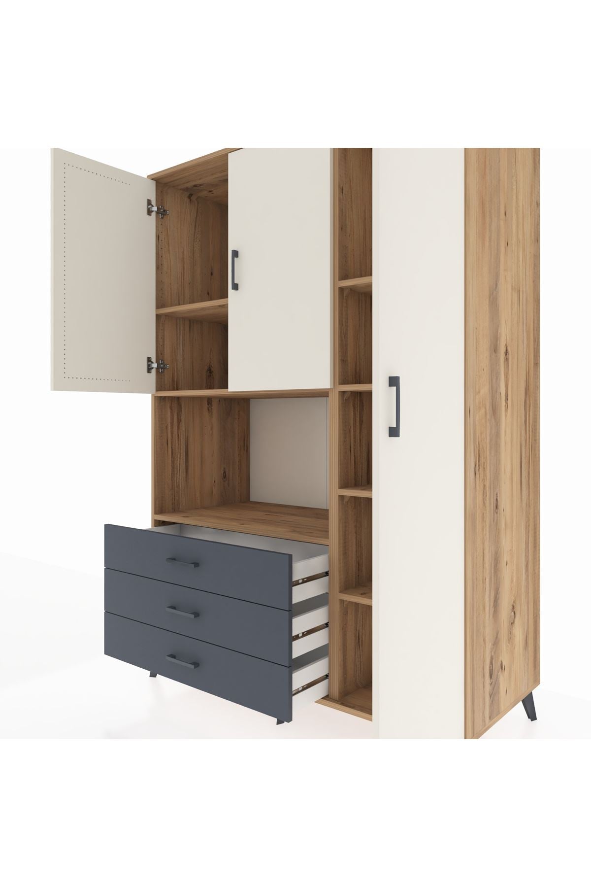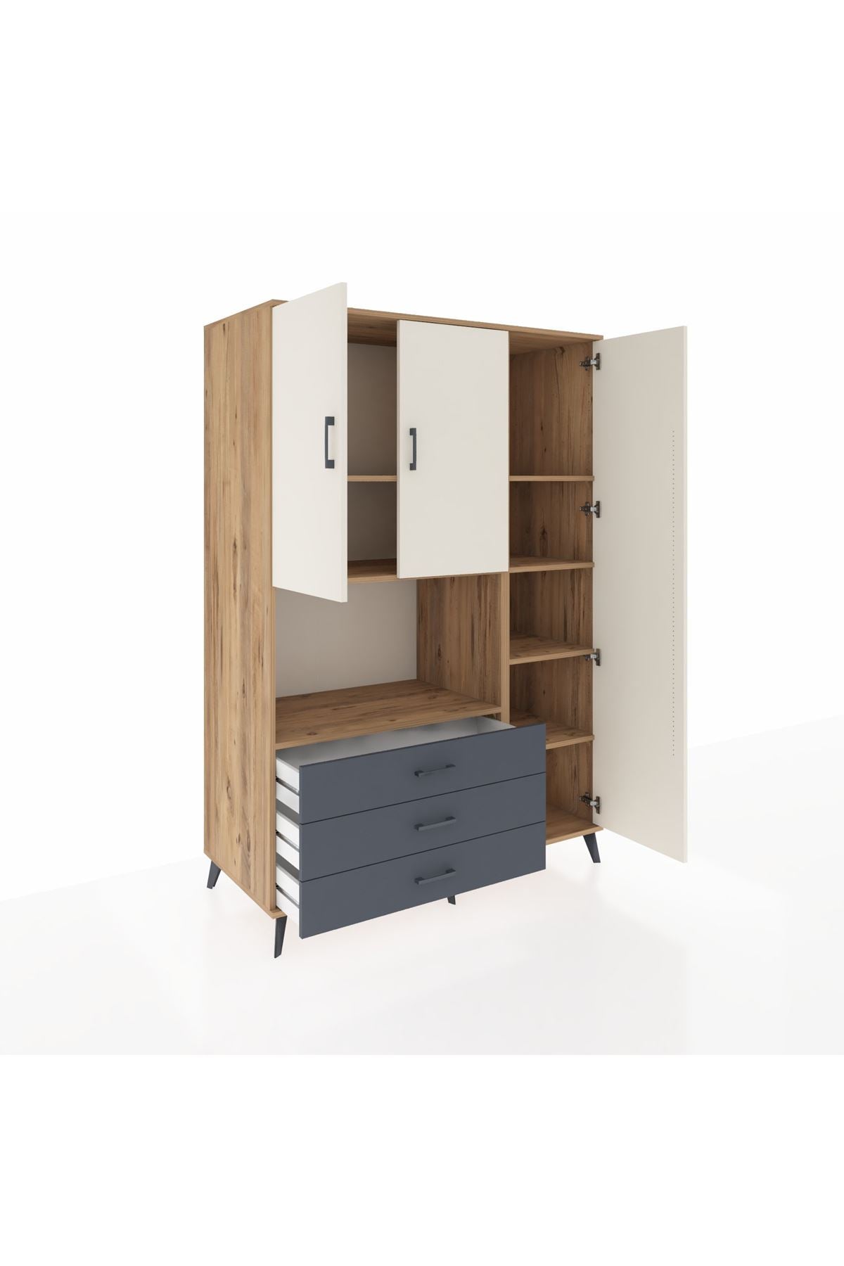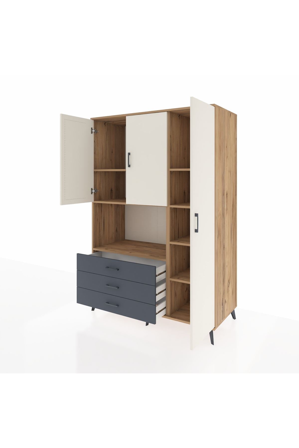 Dienni kalitesini her ayrıntıda hissedeceksiniz! 💎 7 sağlam raf, 3 pratik çekmece ve 3 kapaklı geniş iç hacim; kıyafet, ev tekstili ya da ofis evraklarınız için bolca depolama alanı sağlar.