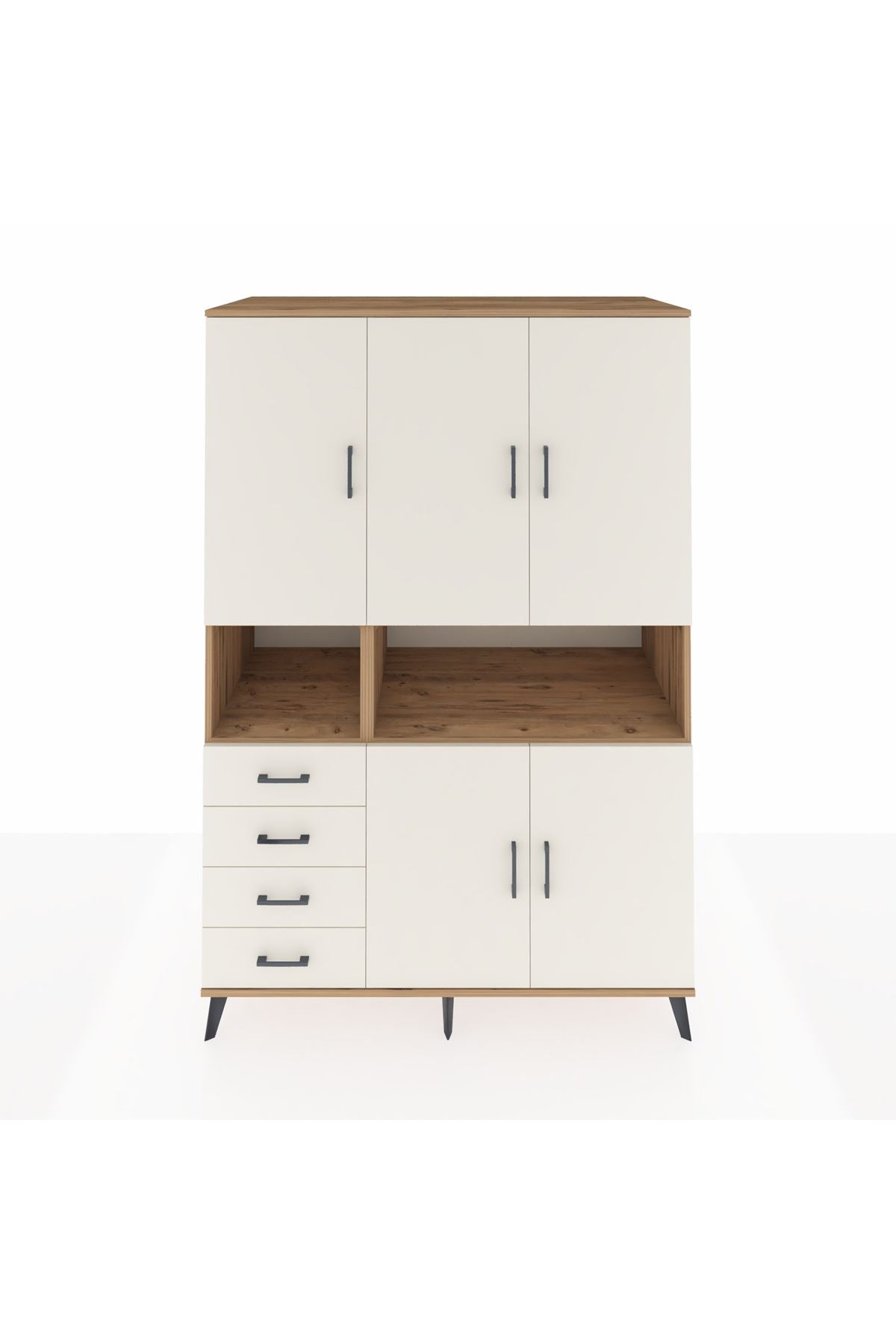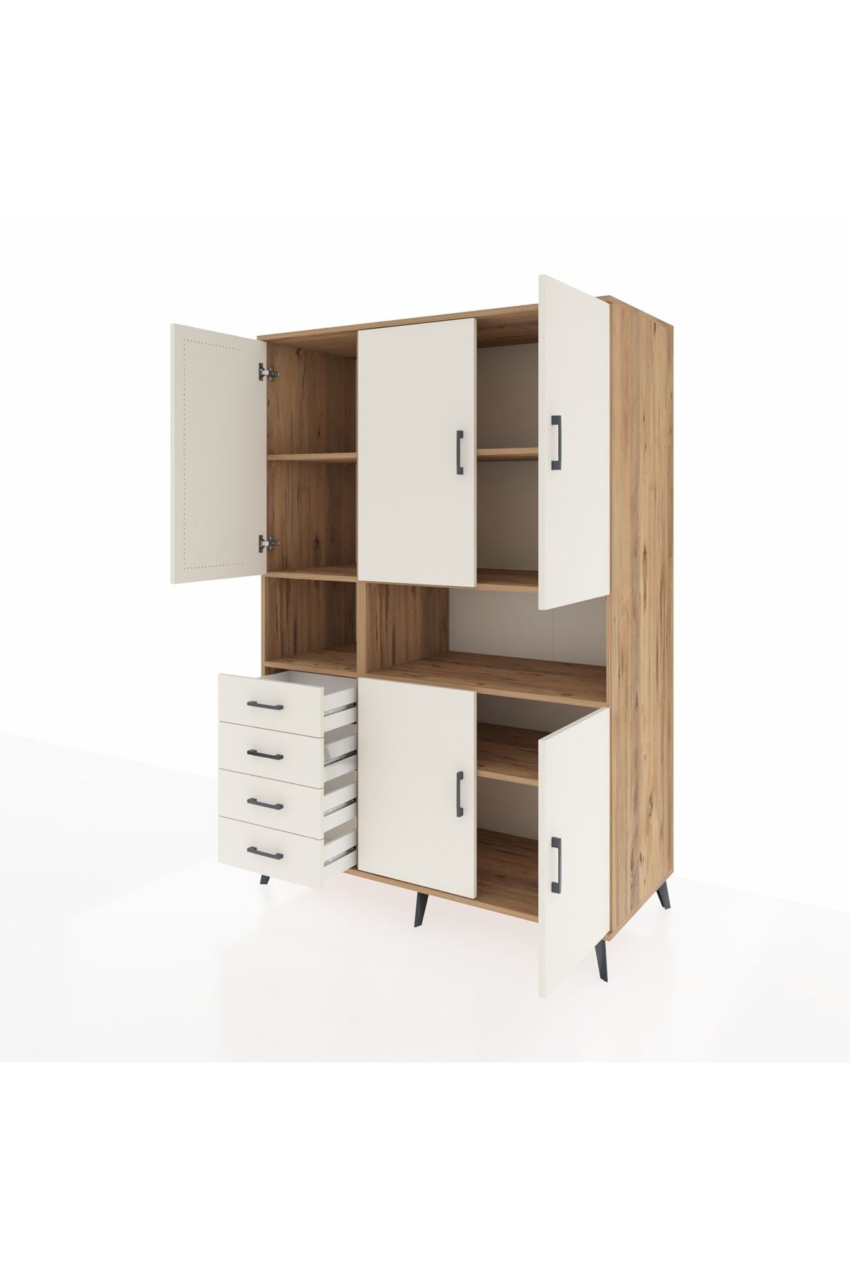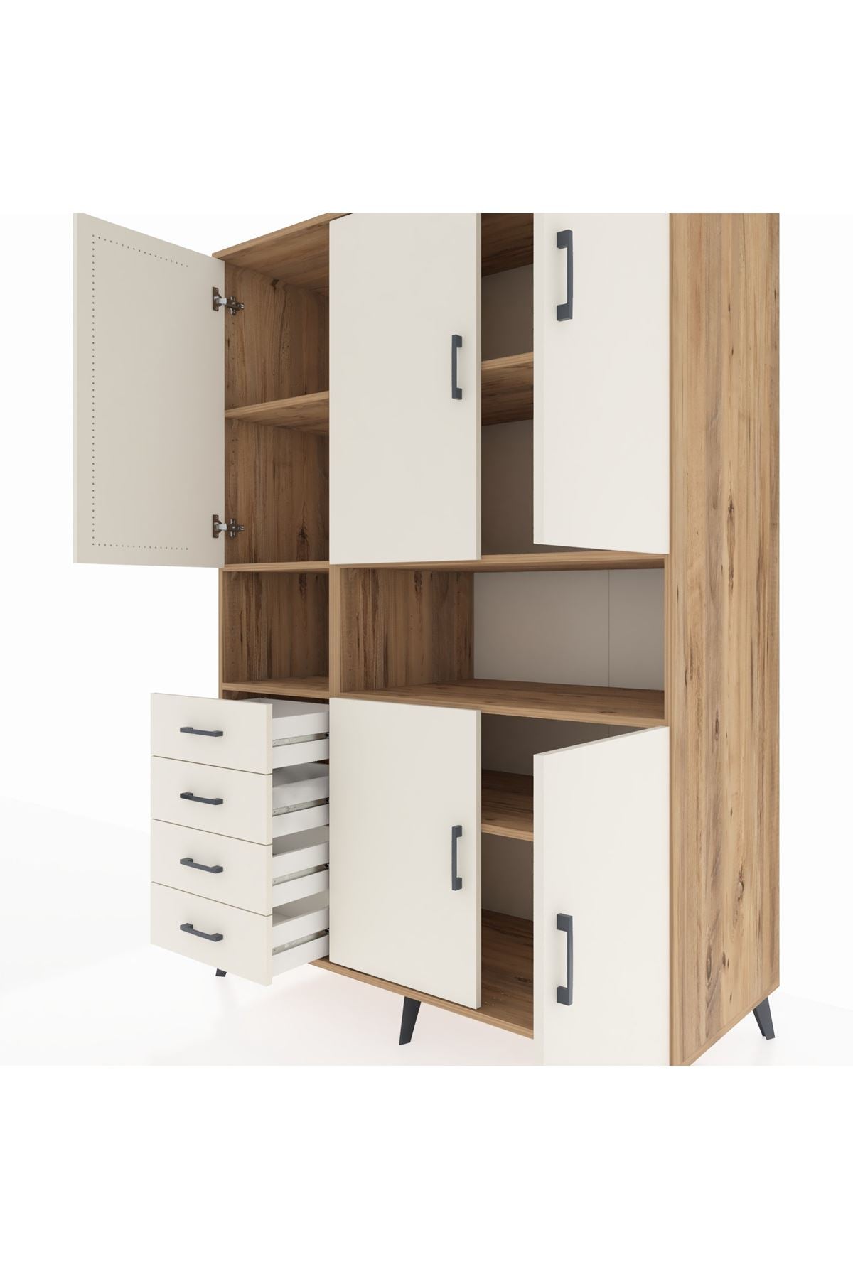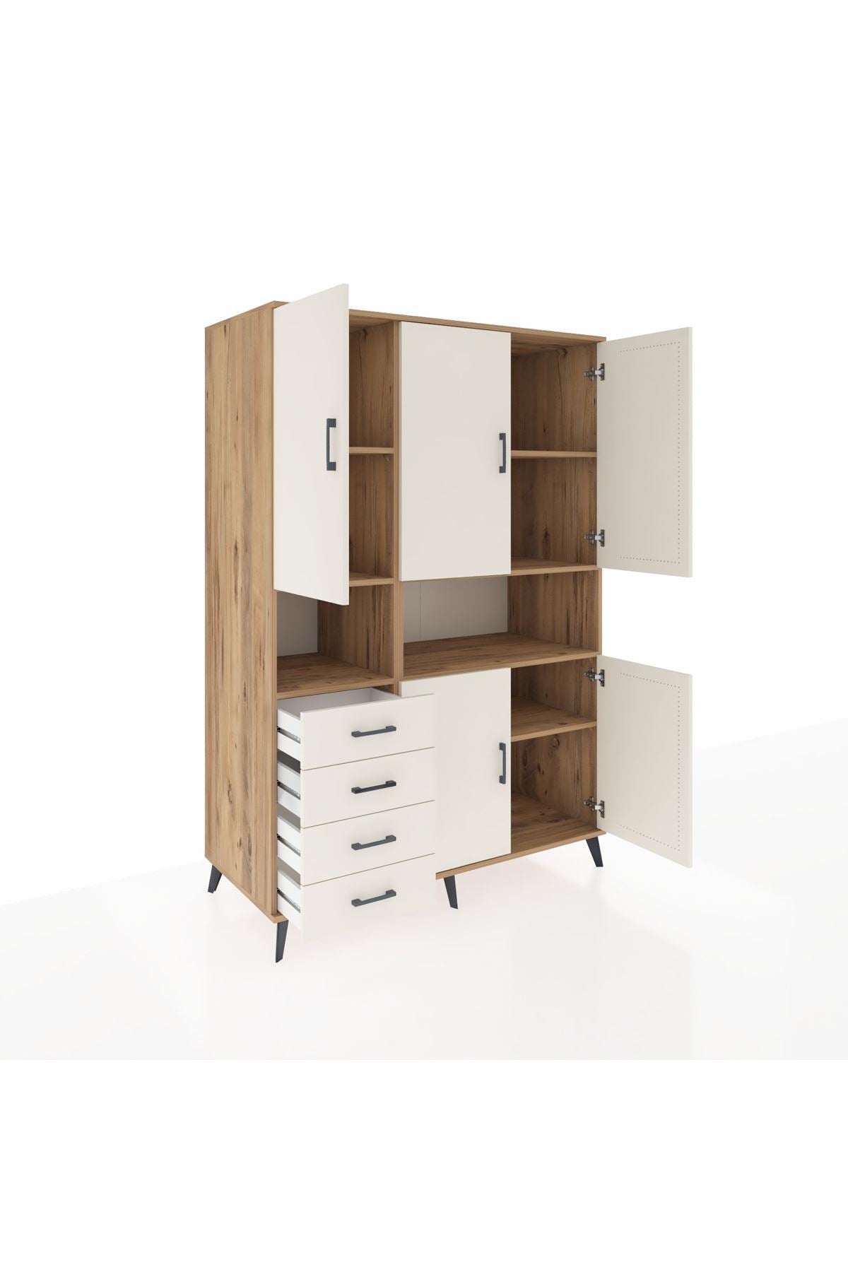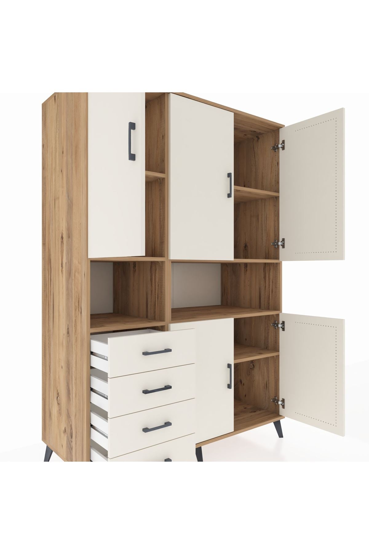 7 raf, 4 çekmece ve 5 kapaklı bölmesiyle ister yatak odası, ister antre ya da ofiste maksimum depolama sağlar. 📚👗 Genişliği 132 cm, derinliği 59 cm ve yüksekliği 195 cm olan bu model, robot süpürge dostu metal ayaklarıyla da temizlikte pratiklik sunar.