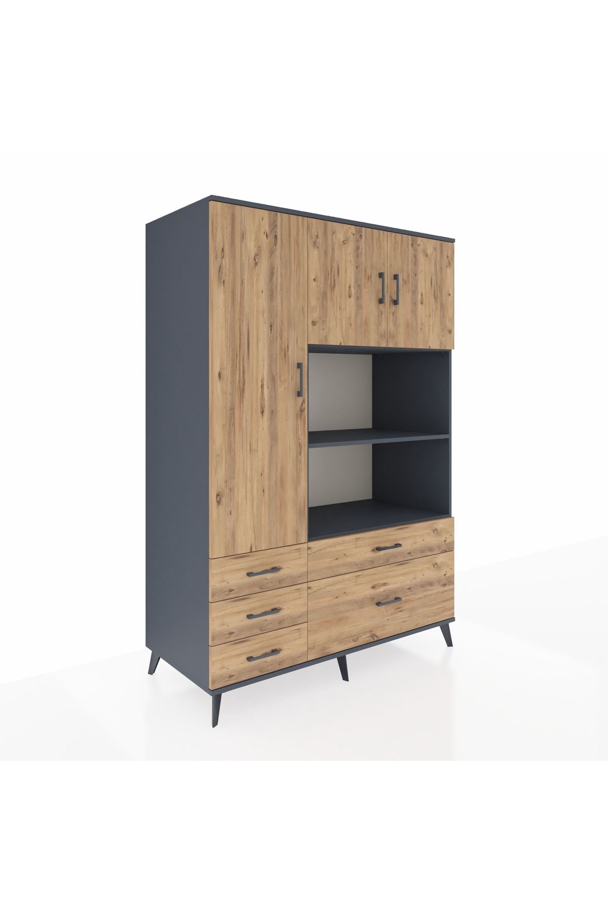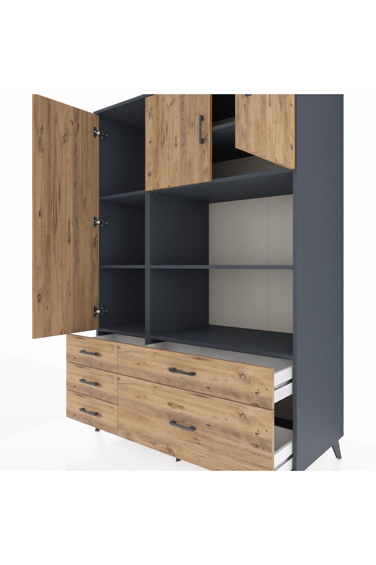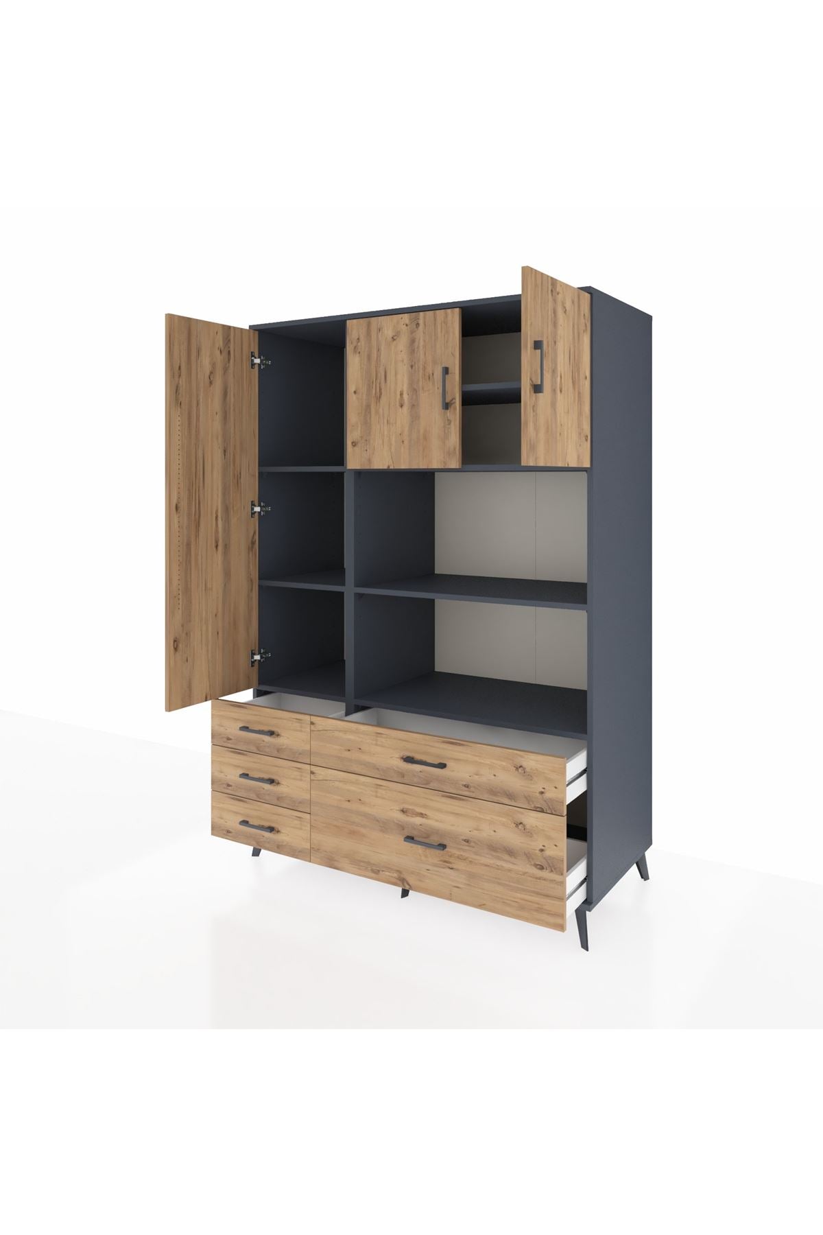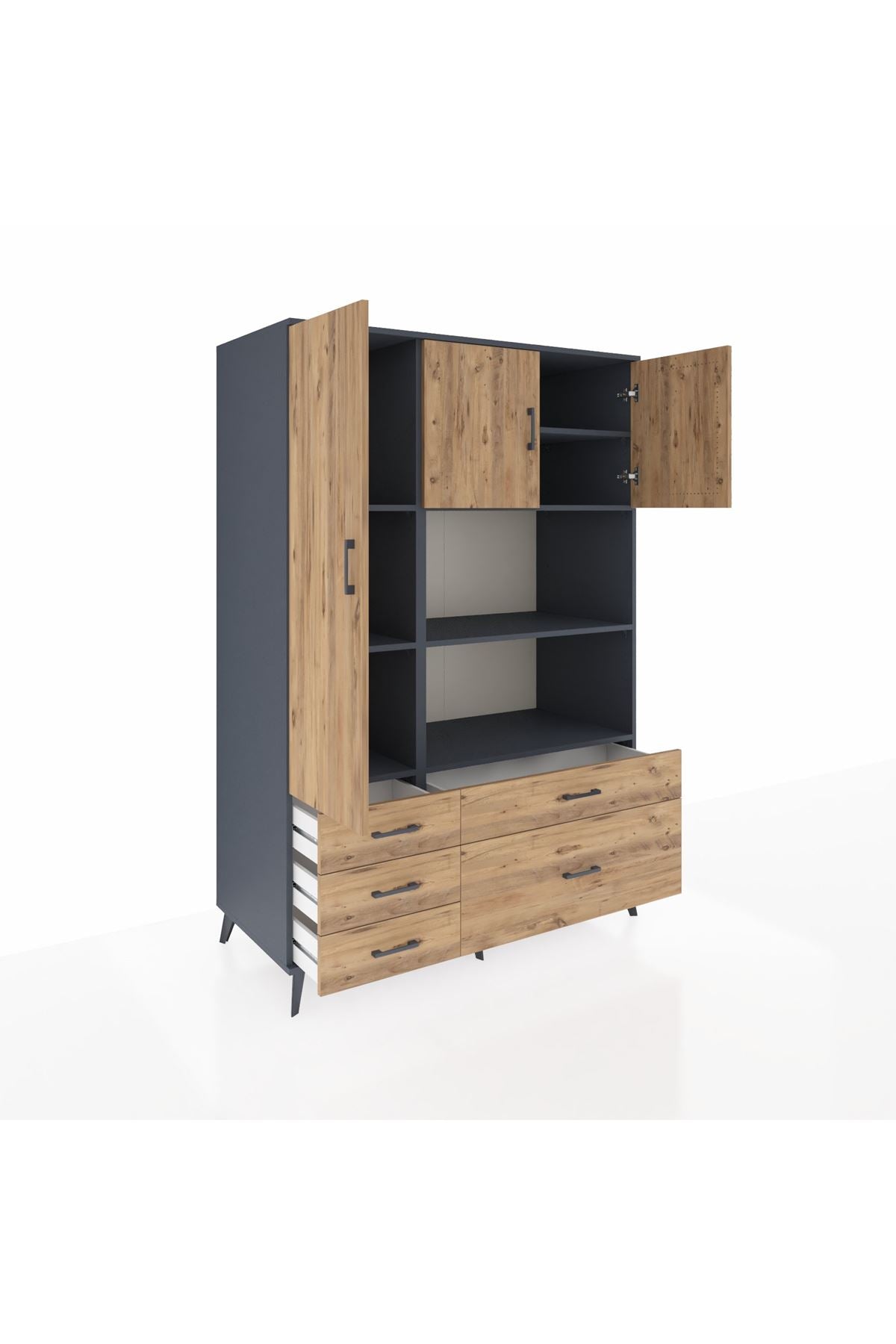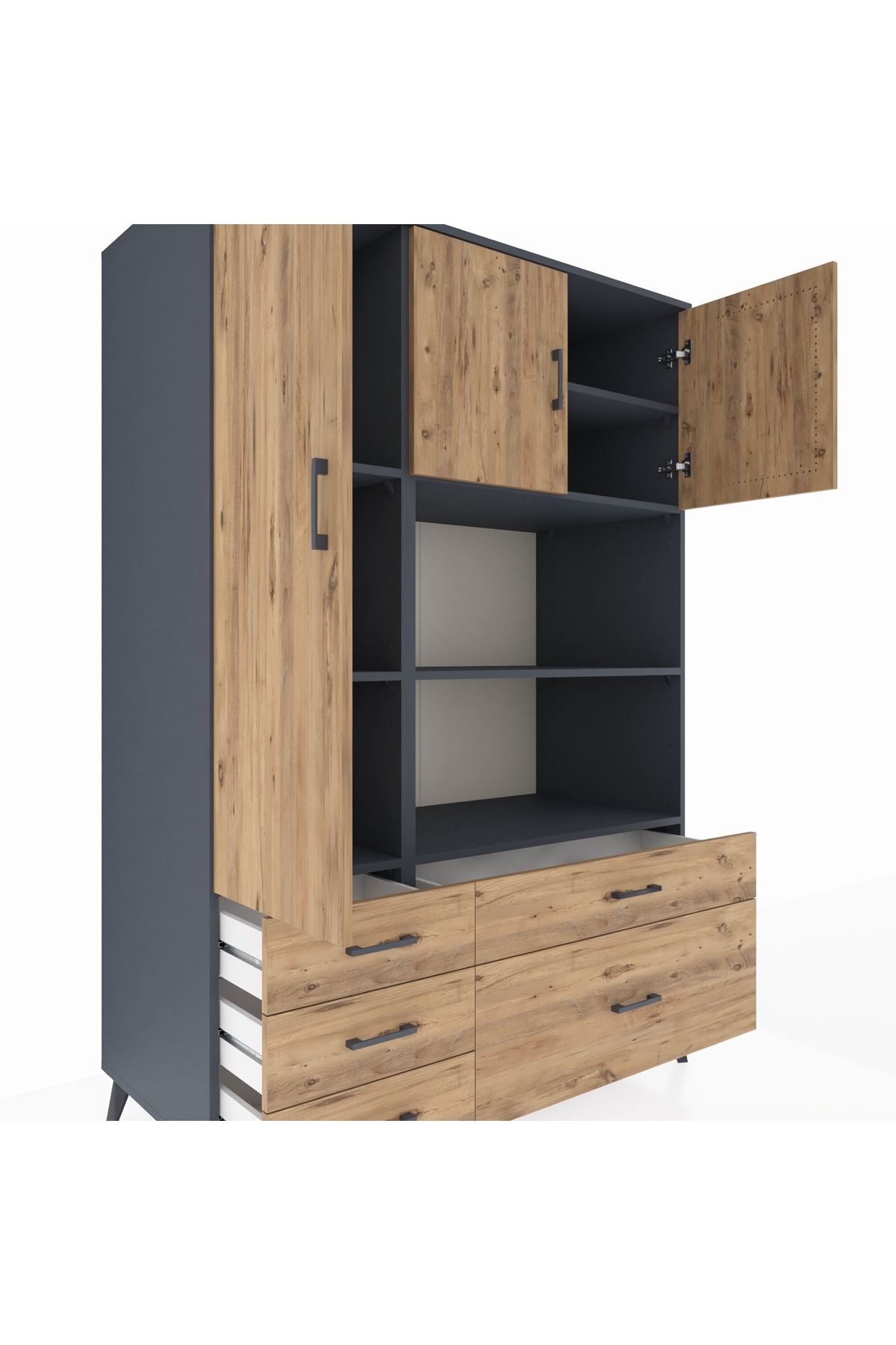 Antrasit ve Atlas Çam renginin sıcak uyumu, evinizde sofistike bir atmosfer yaratır. 7 rafı ve 5 geniş çekmecesiyle tüm eşyalarınızı organize etmek çok kolay. 3 kapaklı yapısı sayesinde dağınıklığa yer bırakmaz, her şey elinizin altında olur.