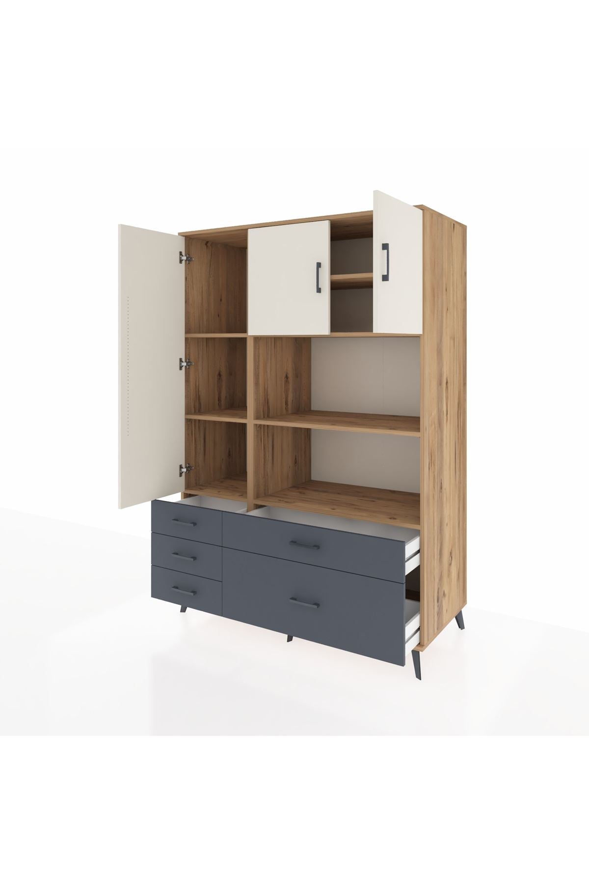 Modern tasarımında çam, aytaşı ve antrasit renklerinin birleşimiyle zamansız bir görünüm sunar. Metal ayaklar ve kulplar hem sağlamlık hem de şıklık katar. 🔩✨