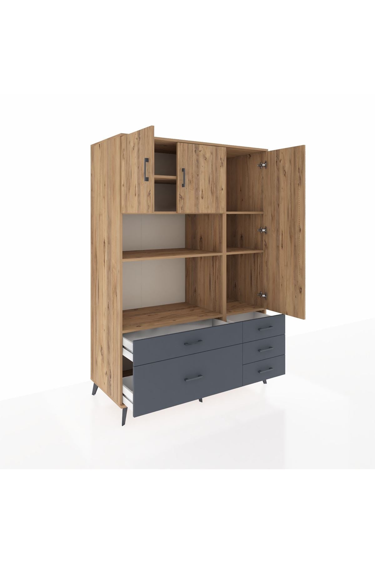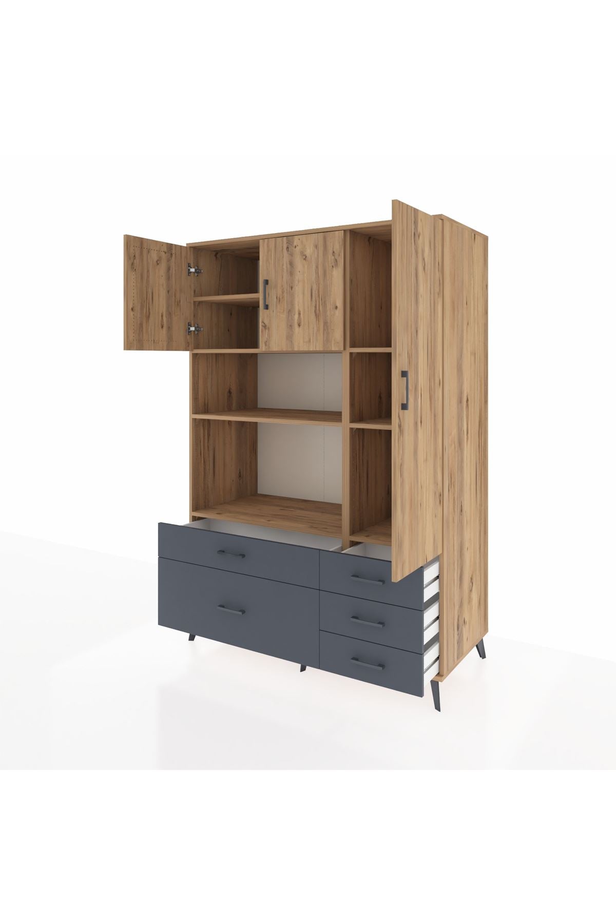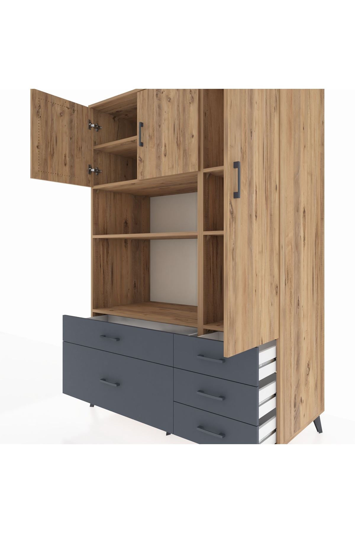 Kronos Dolap 7 Raflı 5 Çekmeceli 3 Kapaklı 132x59x195 Çam-Çam/Antrasit
