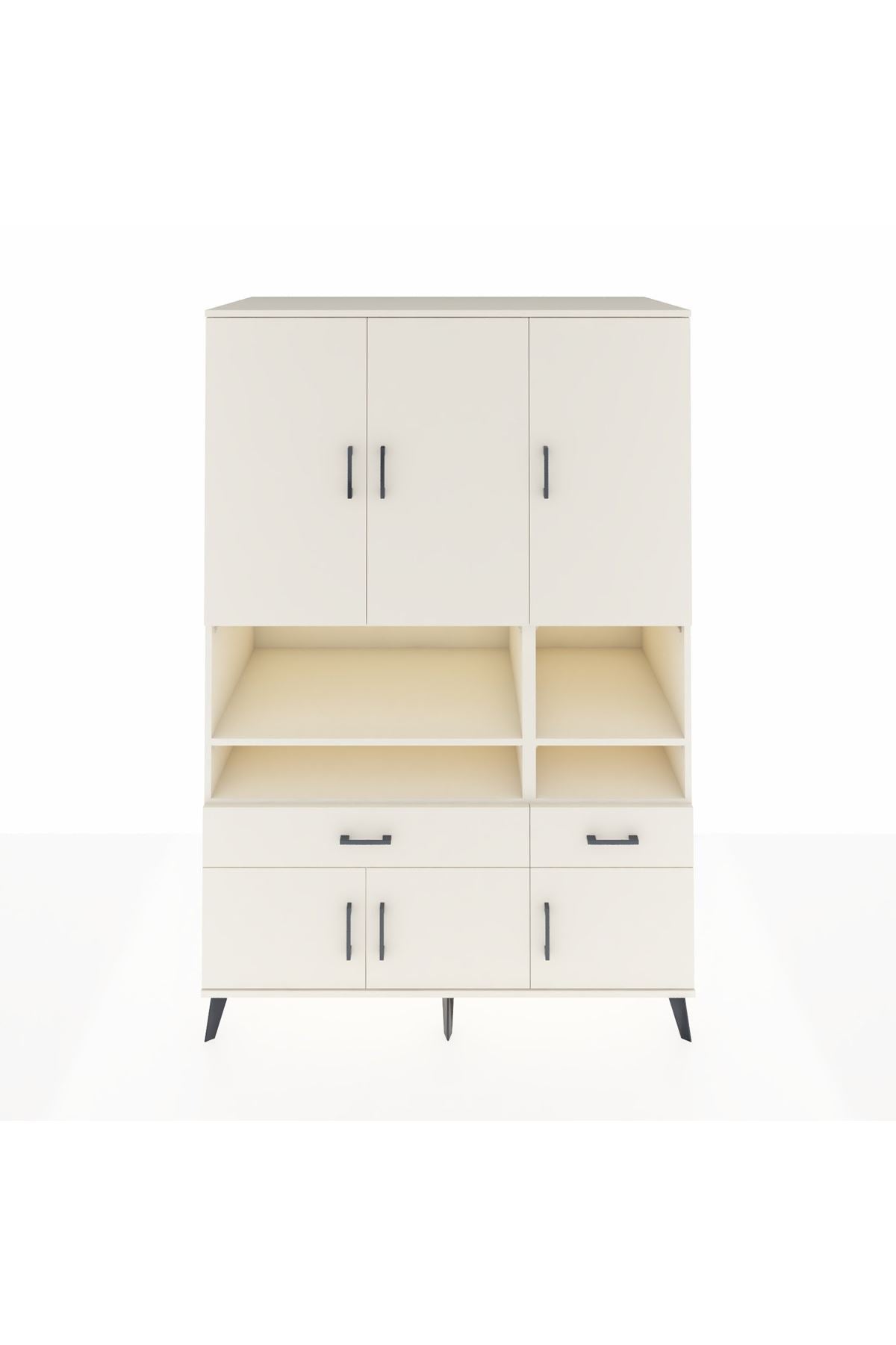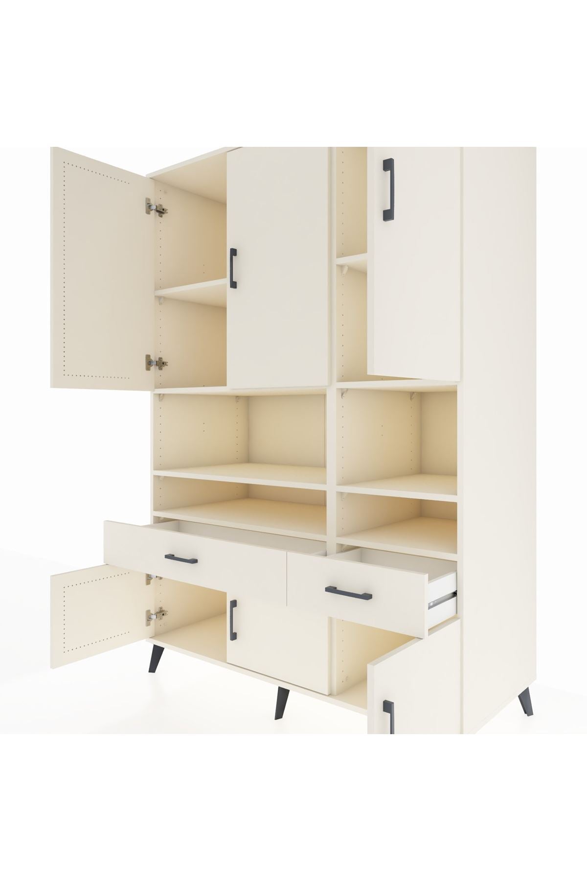 Dolabımız 8 geniş rafı, 2 kullanışlı çekmecesi ve 6 kapaklı yapısıyla her ihtiyaca uygun akıllı çözümler sunar.