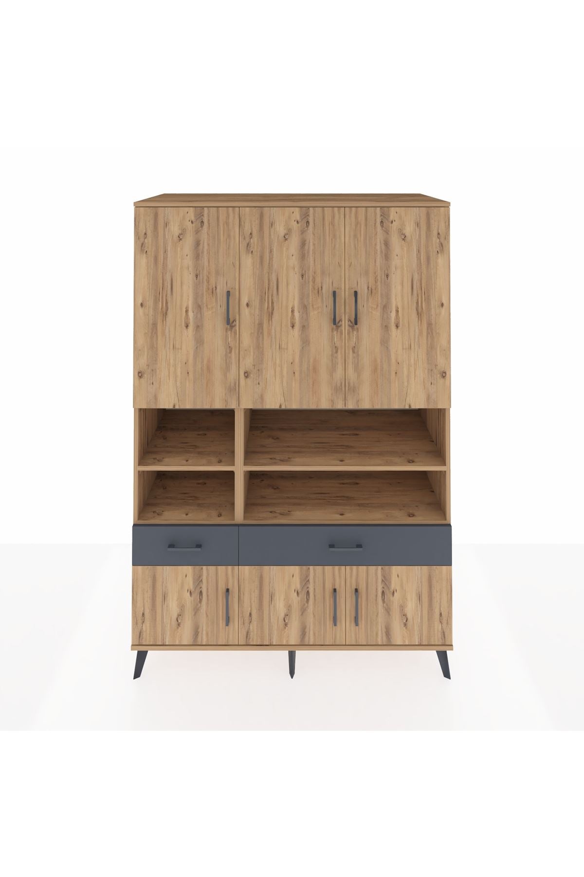 🌟 Kronos Dolap 8 Raflı 2 Çekmeceli 6 Kapaklı 132x59x195 Çam-Çam/Antrasit
