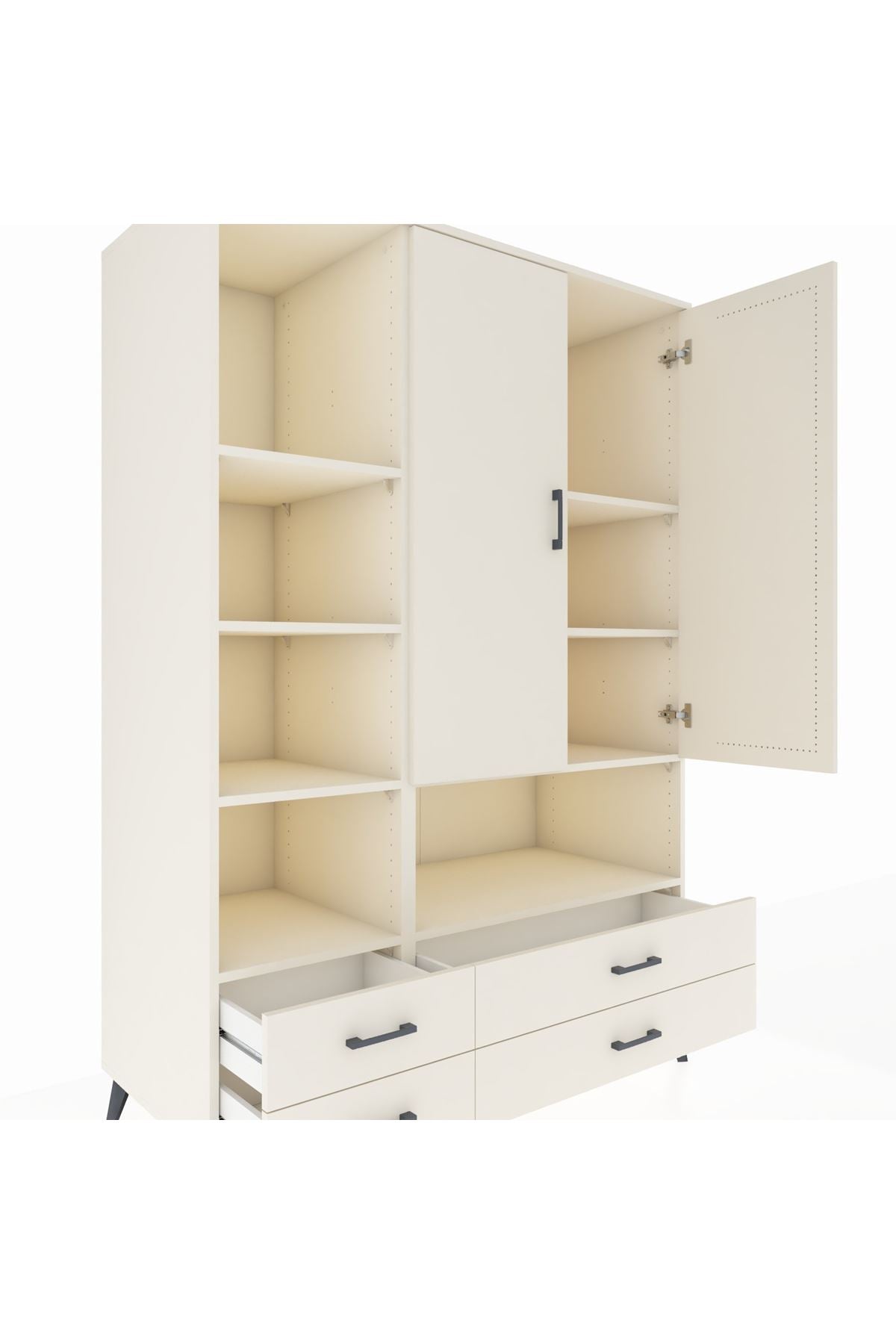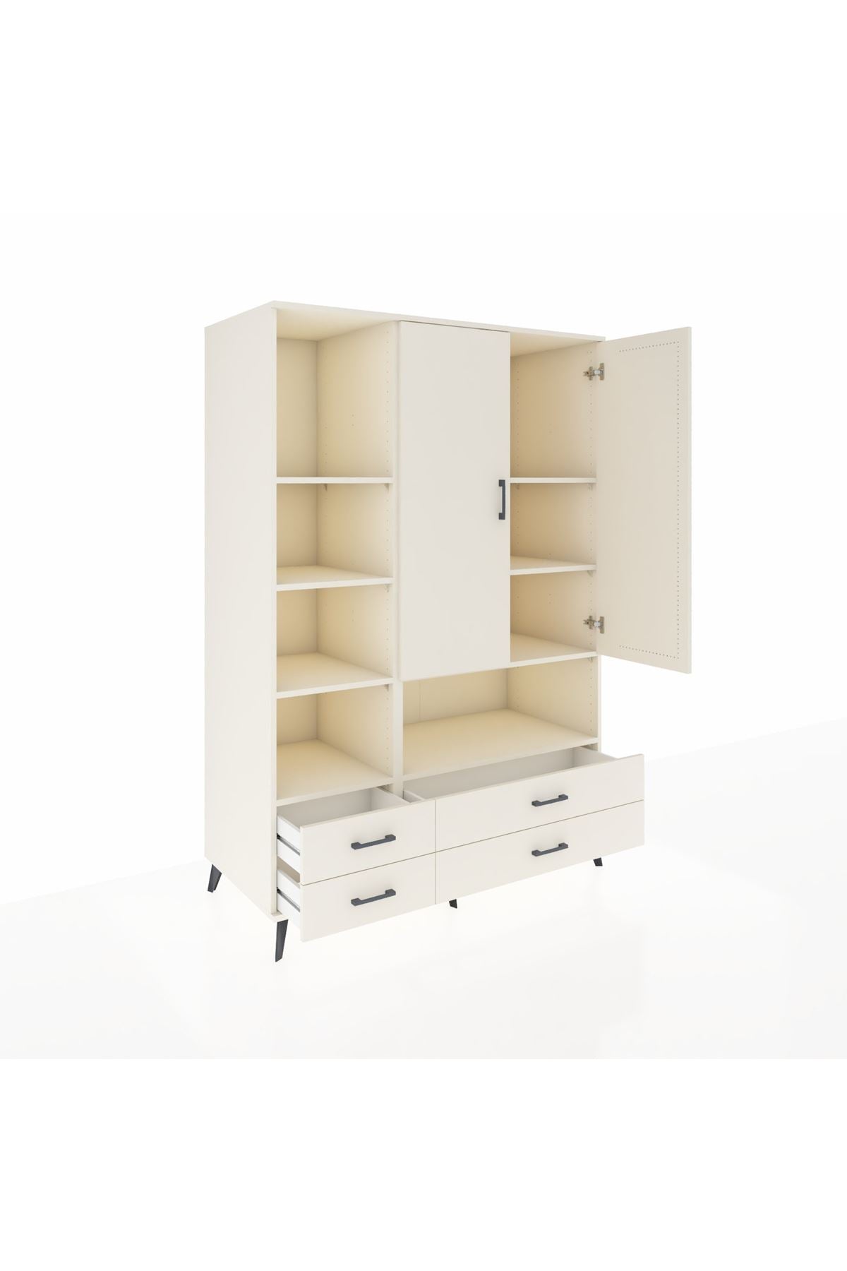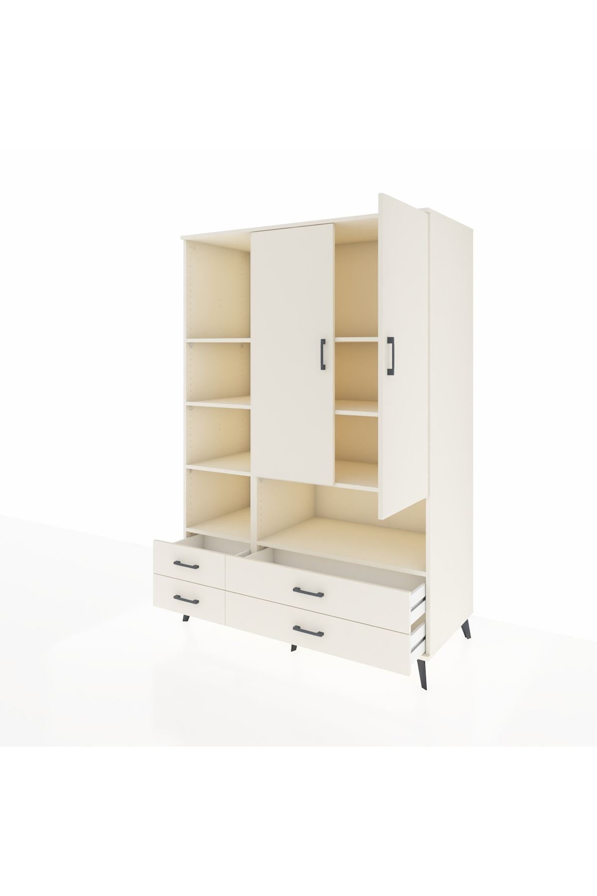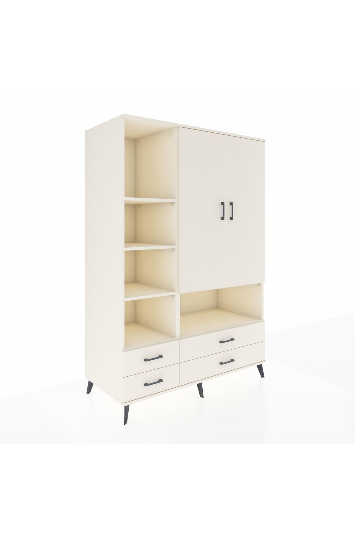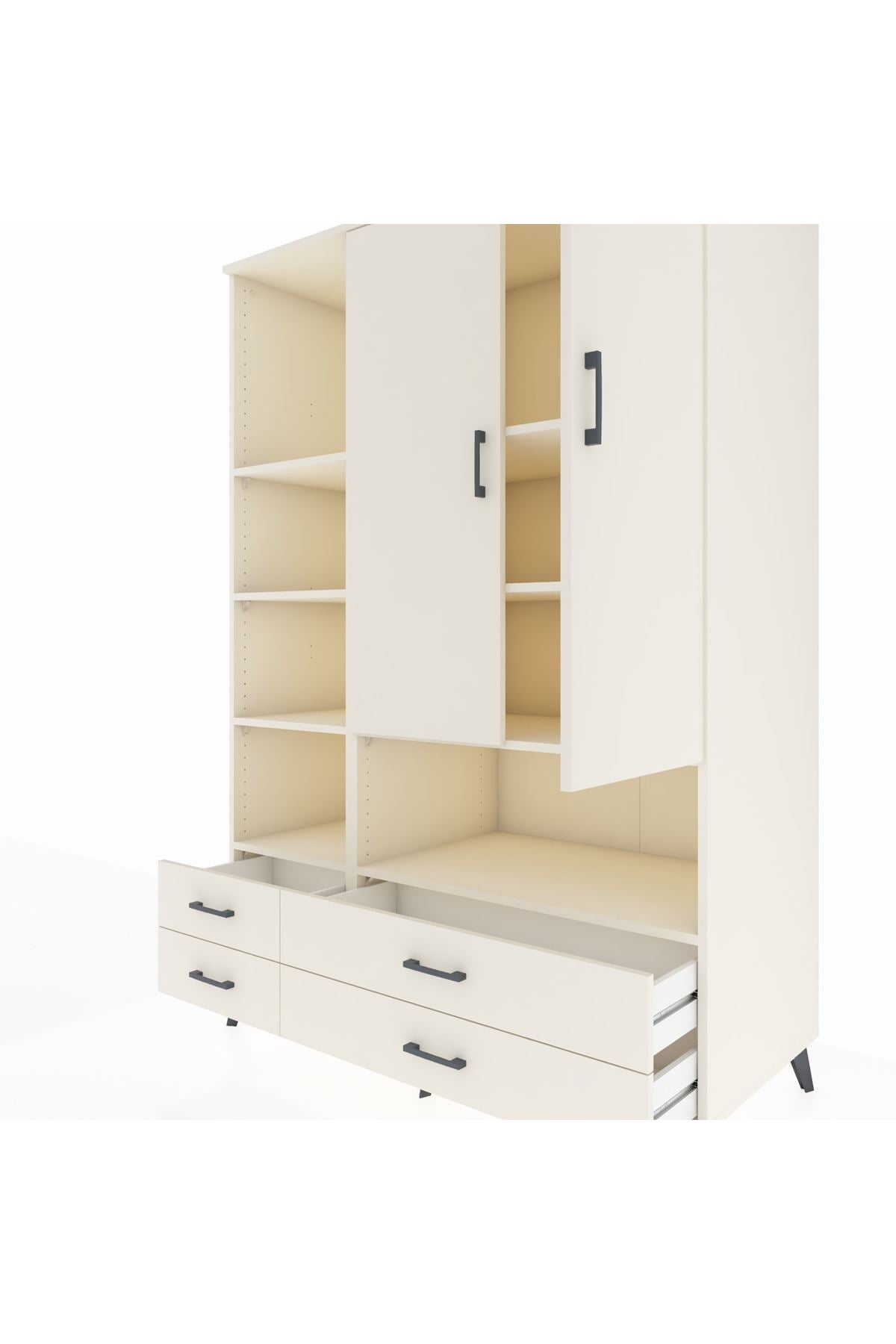 Bu çok amaçlı dolap; zamana meydan okuyan çizgileri, 8 geniş rafı, 4 pratik çekmecesi ve 2 sağlam kapağıyla öne çıkıyor