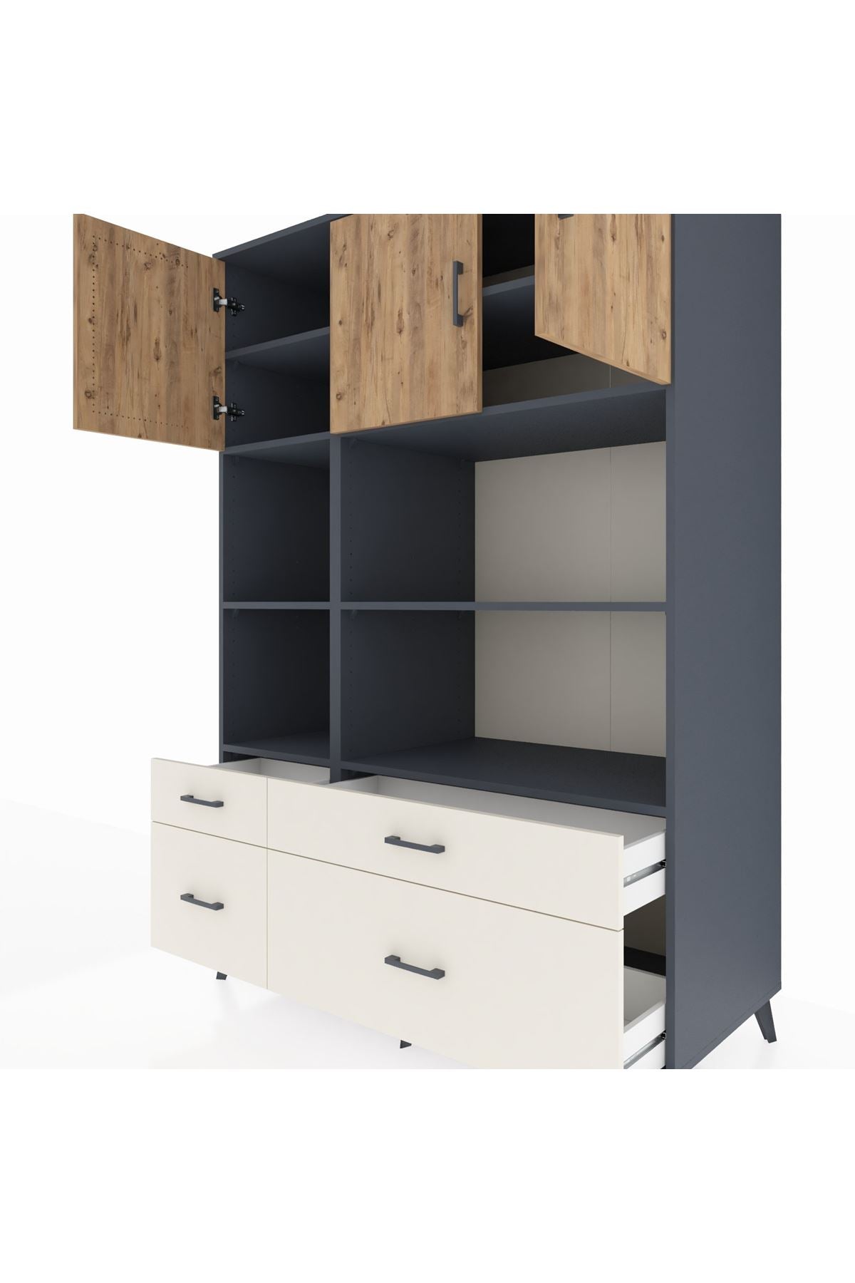 3 kapaklı geniş iç hacmiyle, 8 katlı raf sistemi sayesinde eşyalarınızı kolayca gruplandırabilirsiniz 🗂️ 4 çekmecesiyle çorap, aksesuar ya da evrak gibi küçük eşyalarınızı düzenli biçimde saklayabilirsiniz Atlas çam ve aytaşı renk kombinasyonu, antrasit gövdeyle buluşarak sade ama prestijli bir görünüm sunar