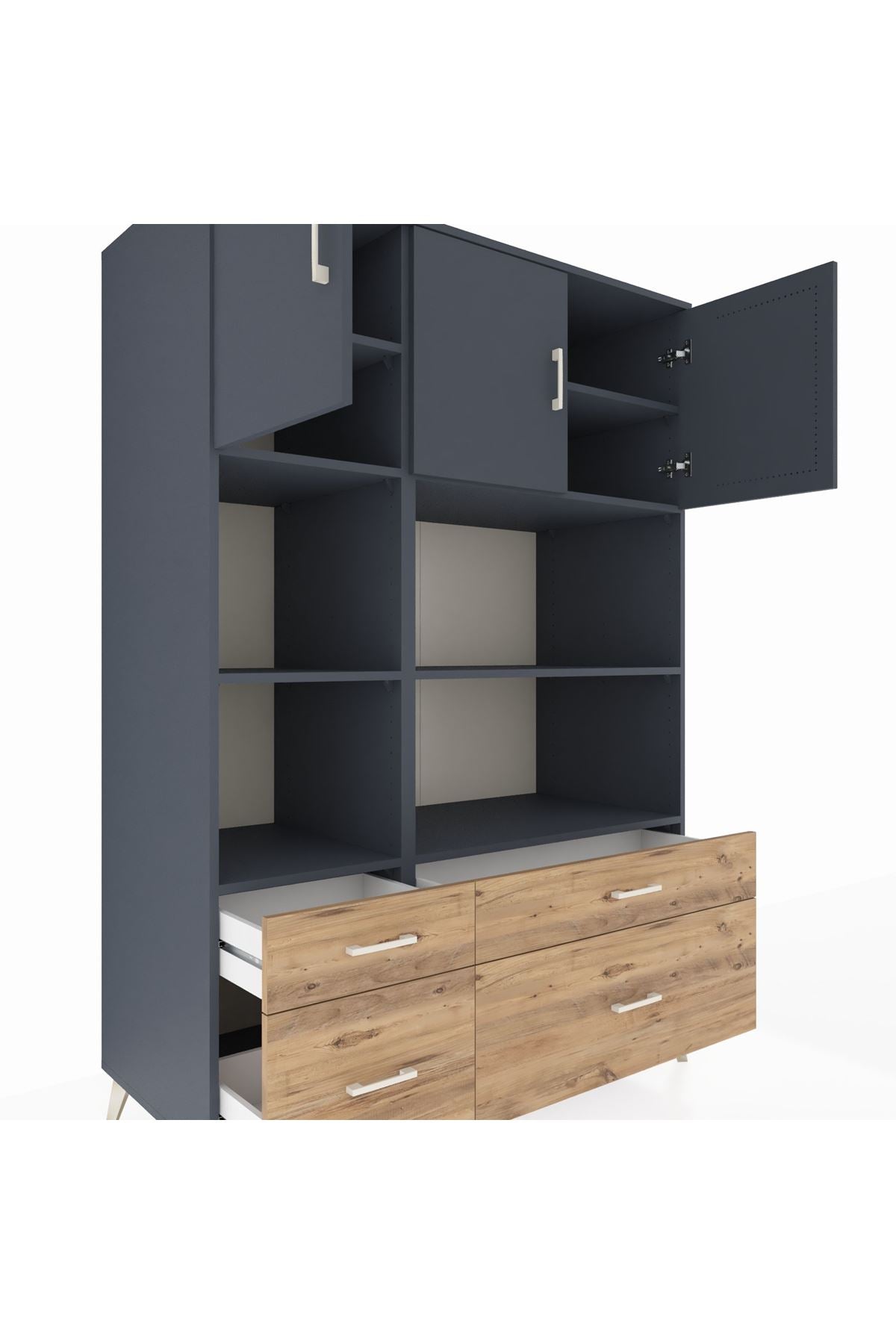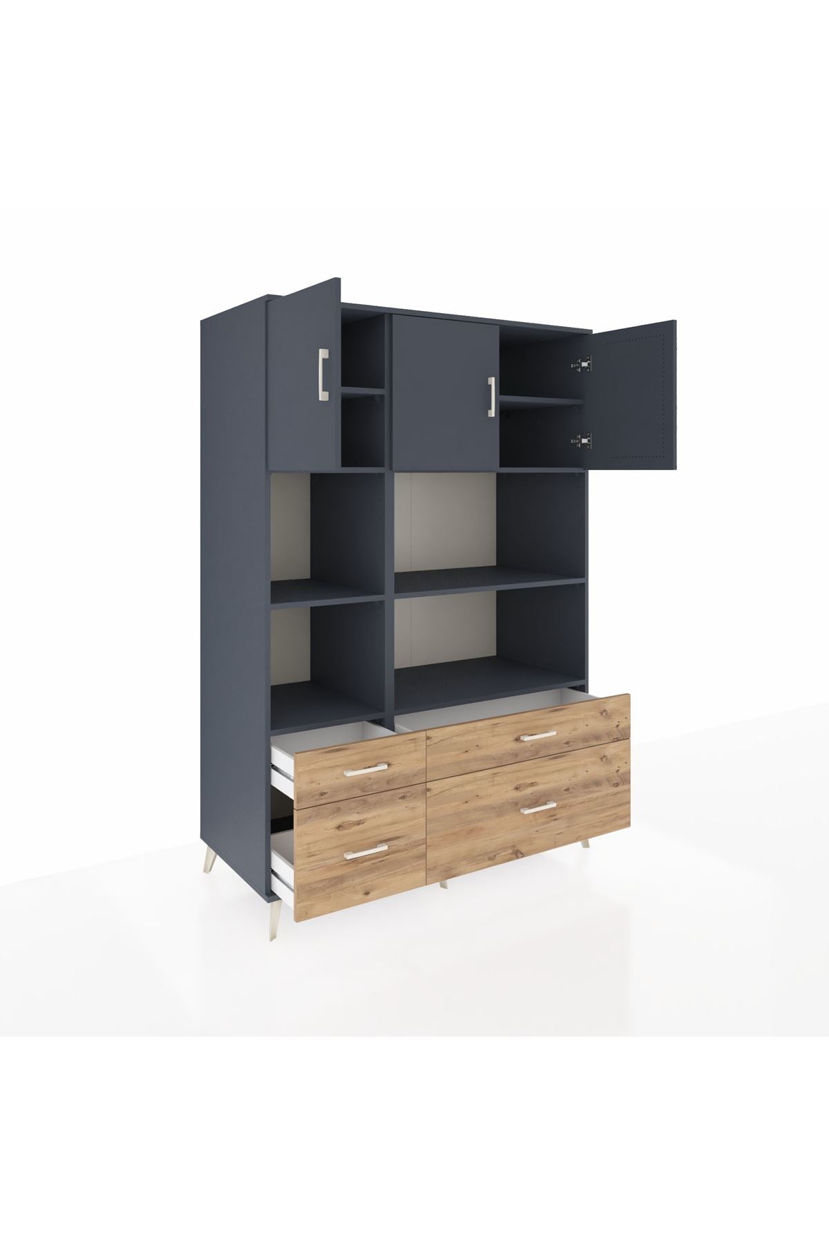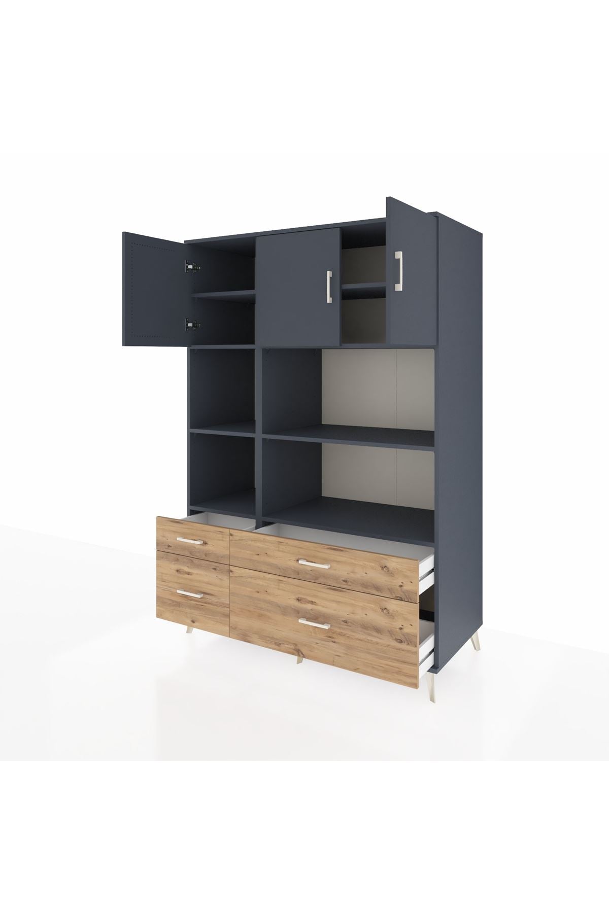 Bu çok amaçlı dolap, tam 8 rafı ile fazlasıyla depolama sunar. 4 çekmecesi, özel eşyalarınızı kolayca organize etmenizi sağlar. 3 kapaklı tasarımı sayesinde hem şık hem de fonksiyonel bir görünüm elde edersiniz. Şık metal ayaklar ve modern metal kulplar, sağlamlık ve uzun ömür sunar. Kastamonu Entegre 1. sınıf suntalam gövde ve 1.2 mm kenar bandı ile maksimum dayanıklılık sağlar.