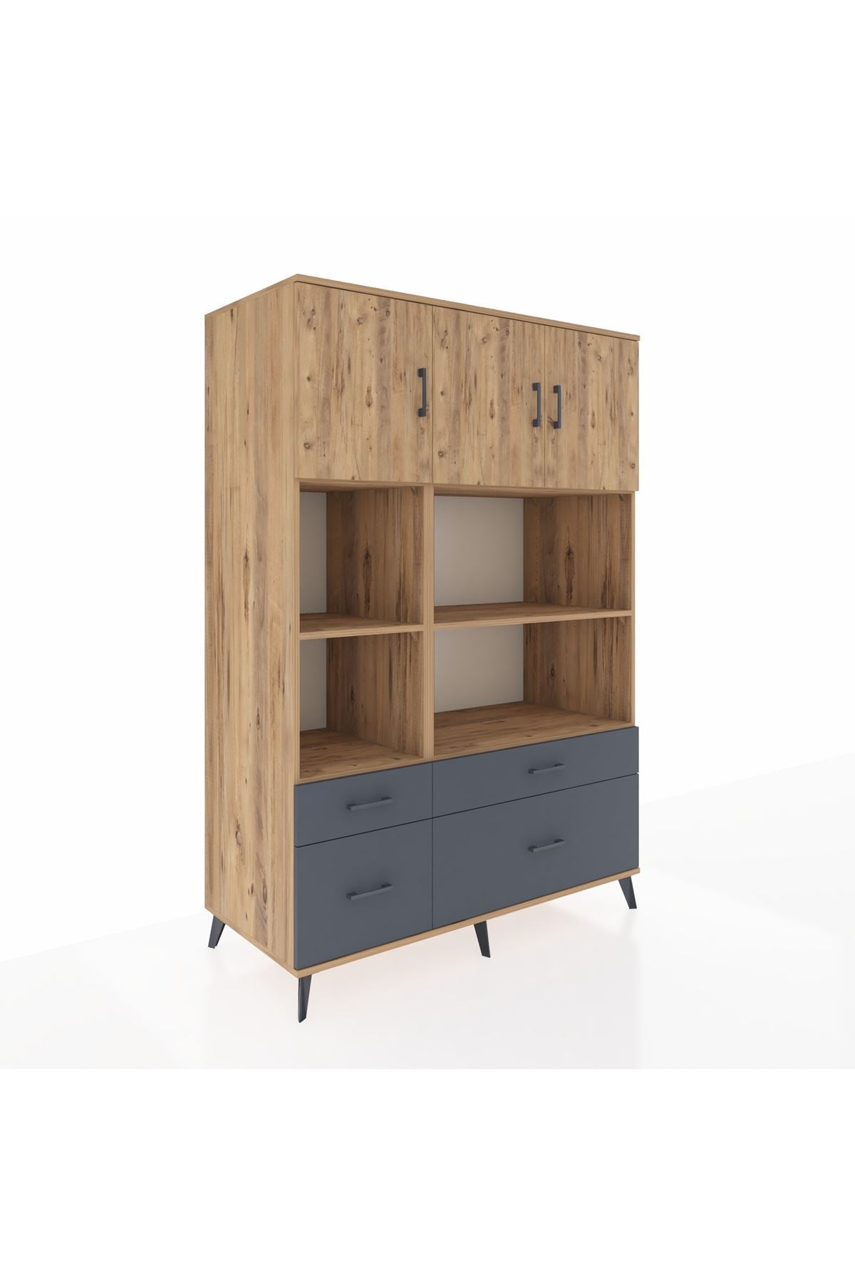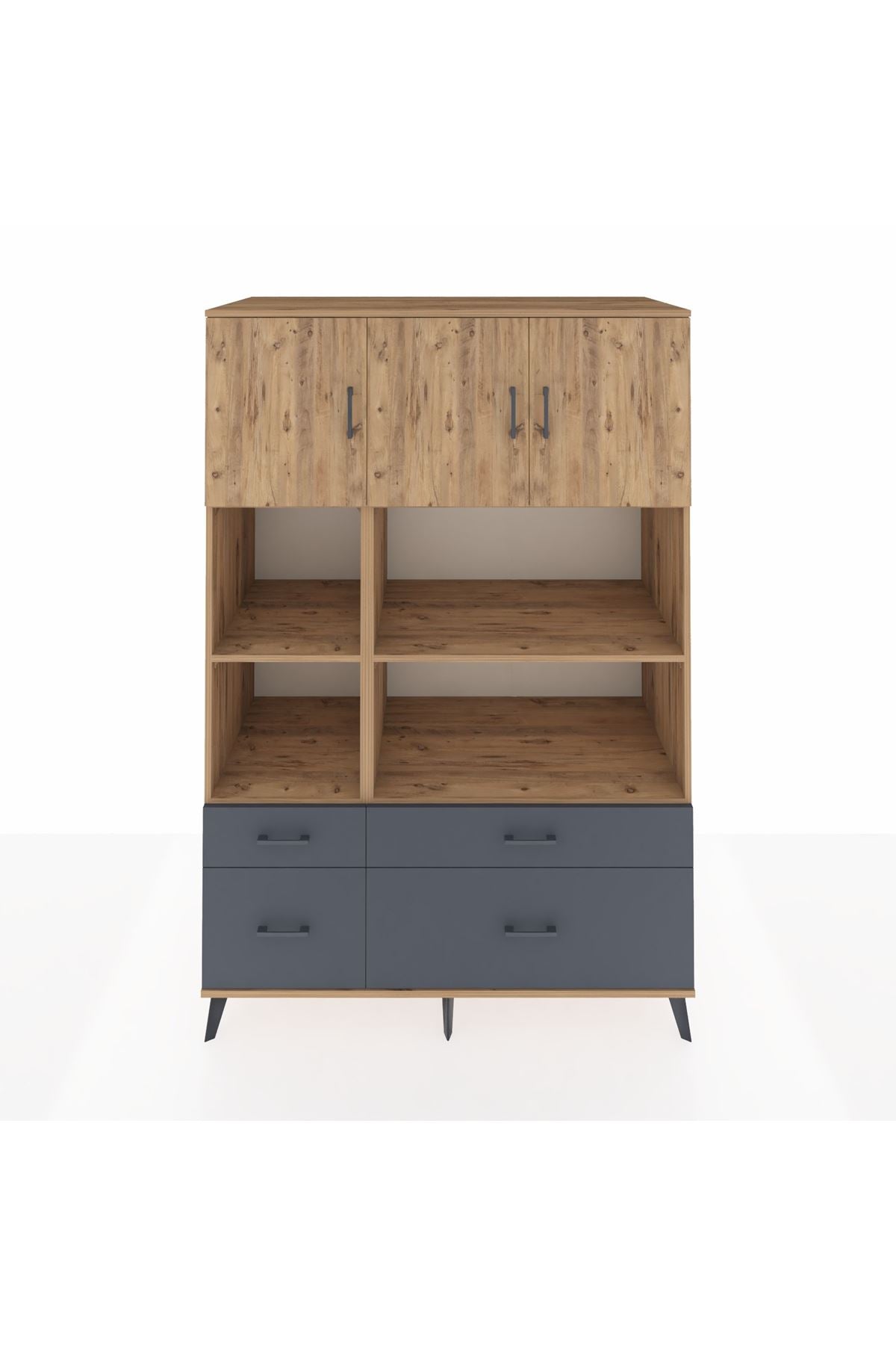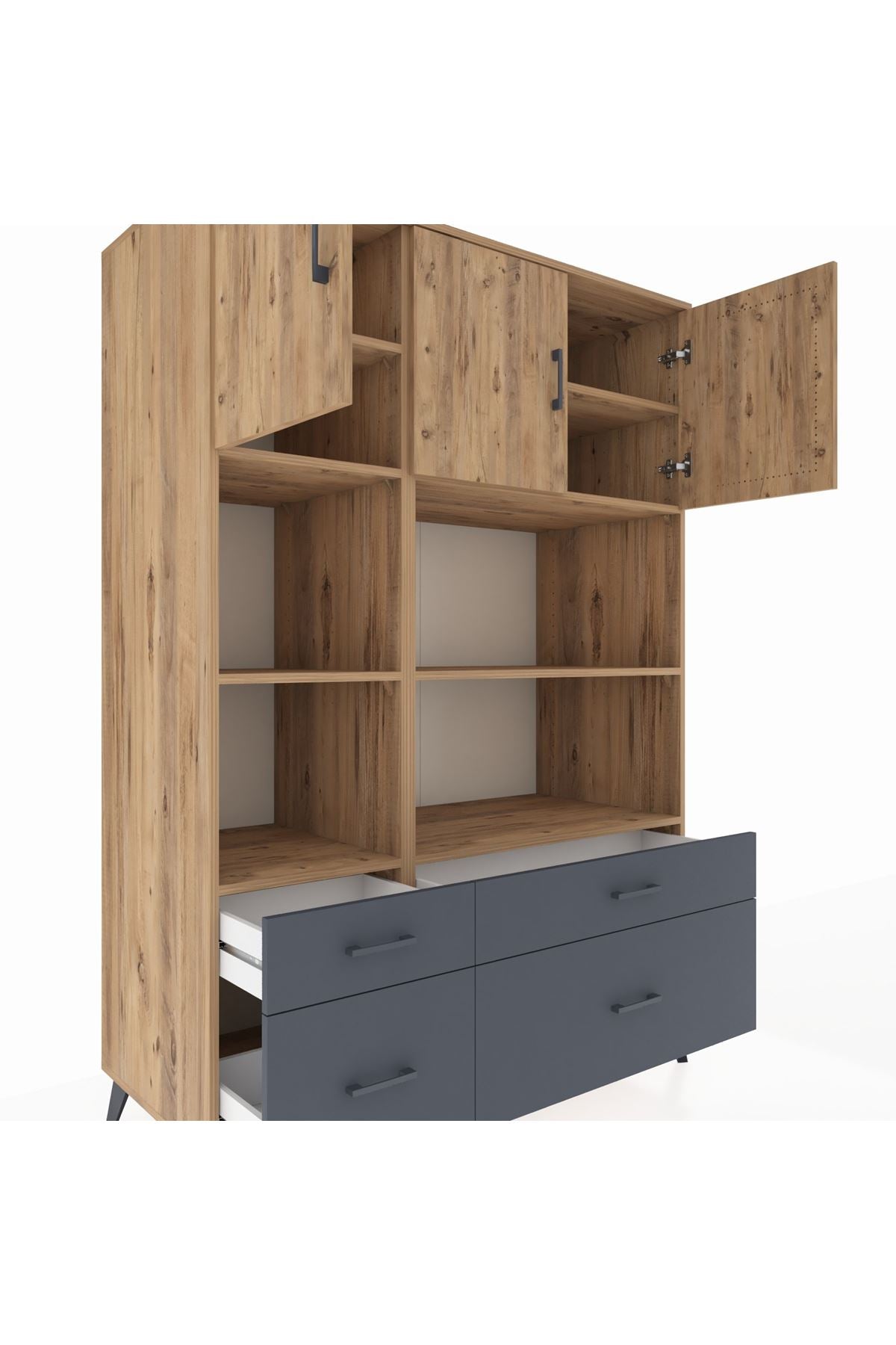 Toplamda 8 geniş raf, 4 kullanışlı çekmece ve 3 kapak ile maksimum depolama alanı sunar 📚🧣 Eşyalarınızı kolayca kategorize edebilir, yaşam alanınızı derli toplu tutabilirsiniz.