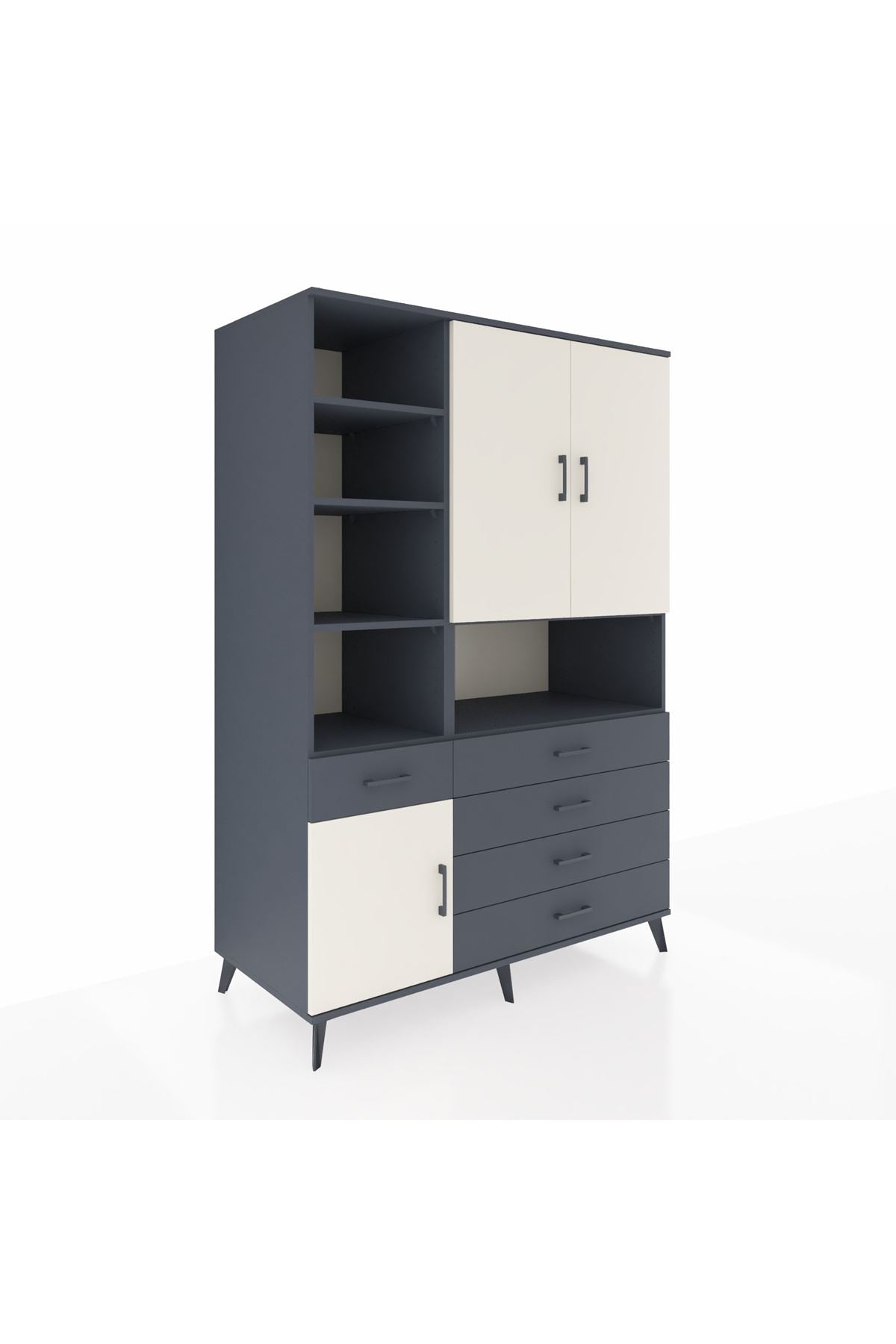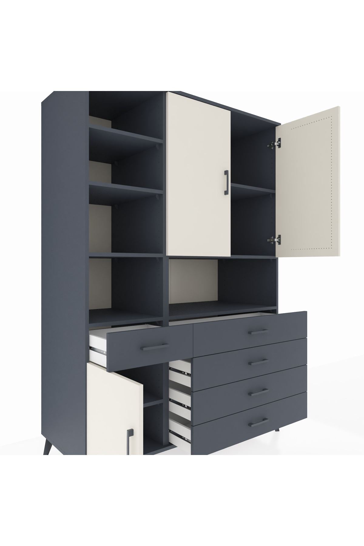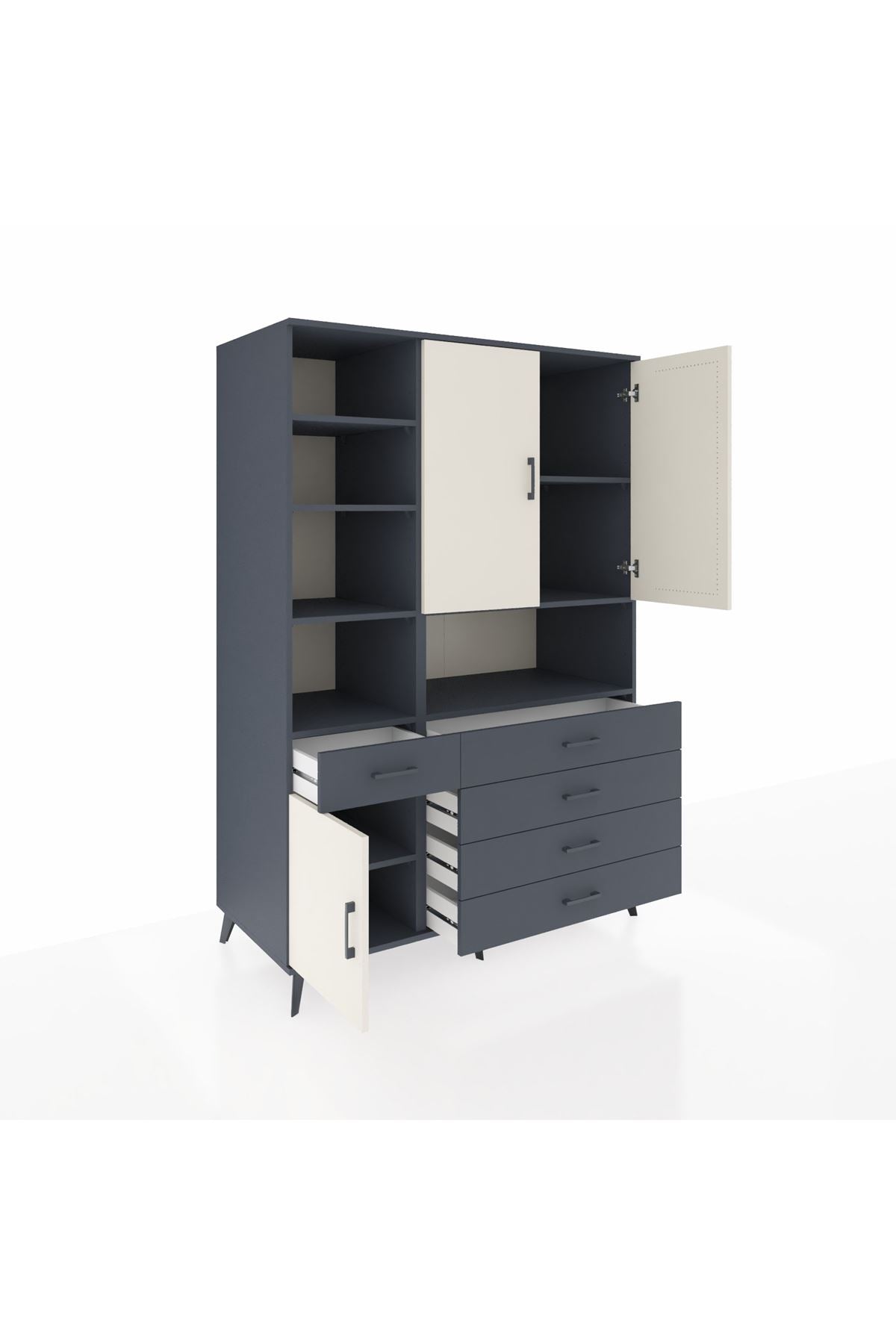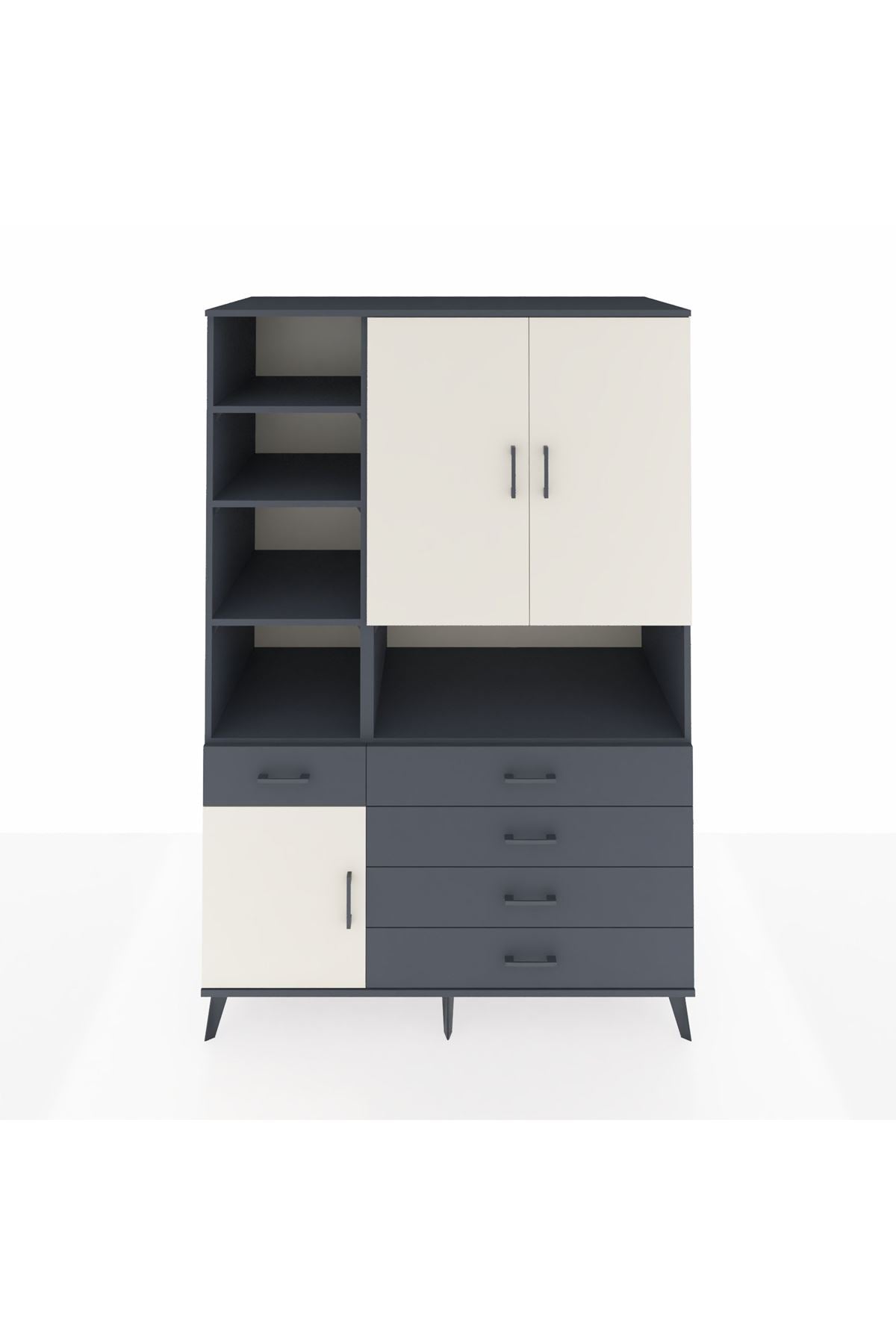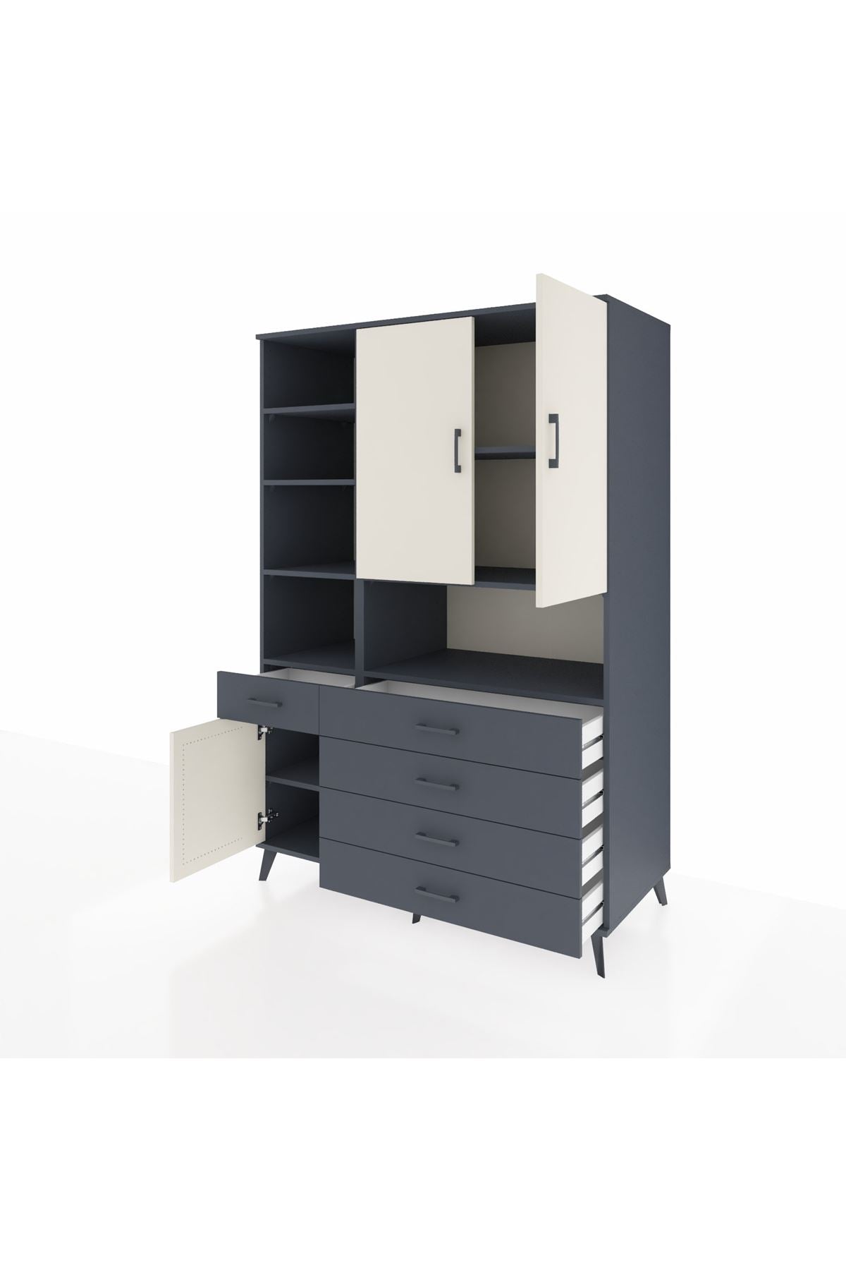 Kronos Dolap’ta 8 adet geniş raf, 5 kullanışlı çekmece ve 3 şık kapak bulunuyor. Gövde ve kapaklarda kullanılan Antrasit-Aytaşı renk kombinasyonu, modern dekorasyonla mükemmel uyum sağlıyor. Metal ayak ve metal kulp detaylarıyla hem sağlam hem de trend bir duruş sergiliyor.