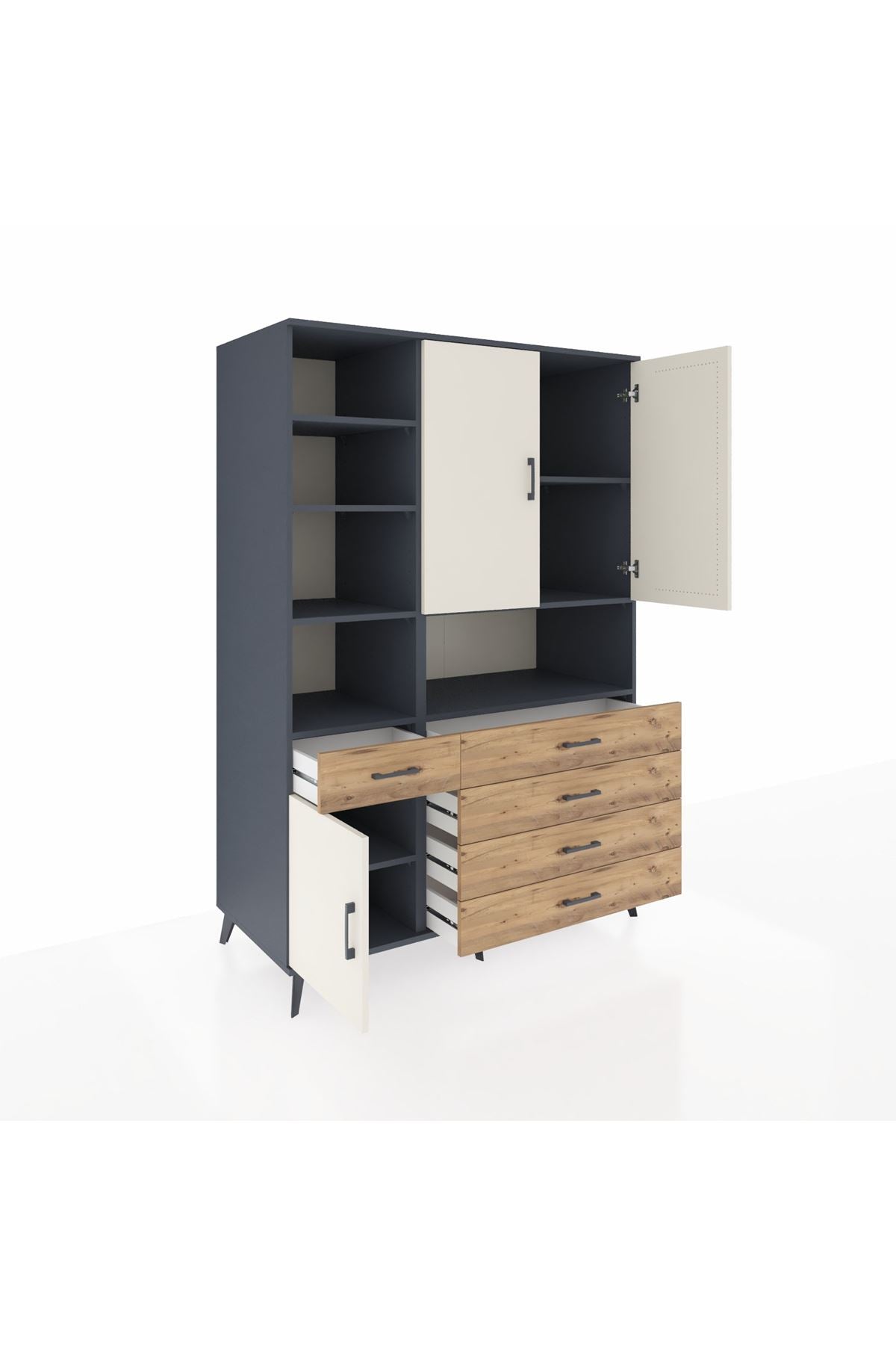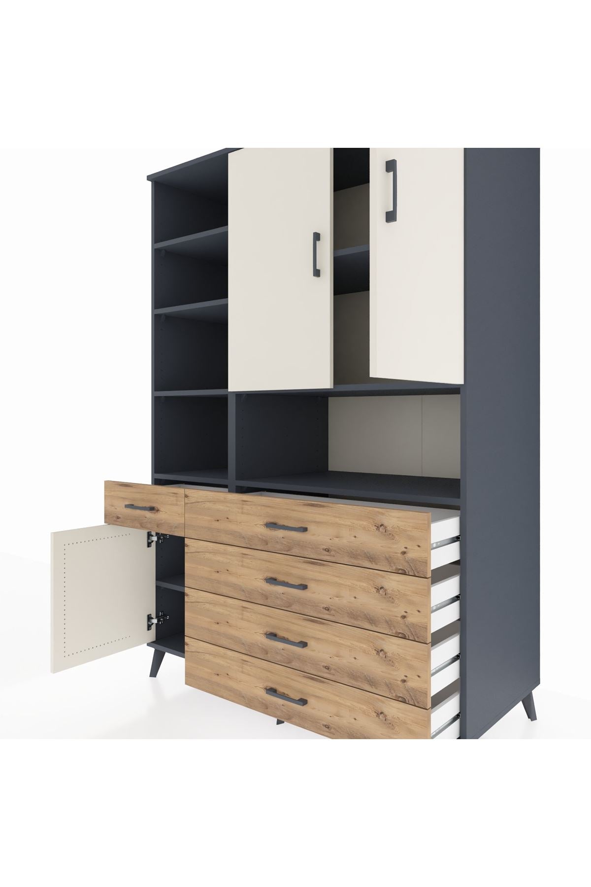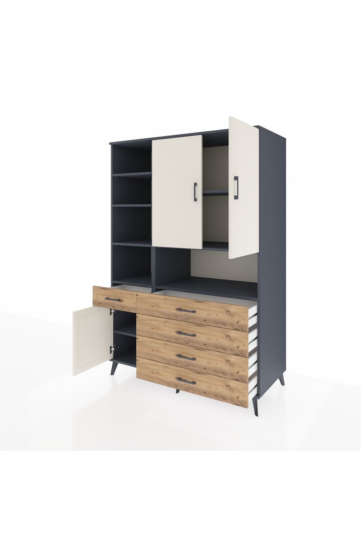 132 cm genişliği, 59 cm derinliği ve 195 cm yüksekliğiyle geniş bir depolama alanı sunuyor. 8 rafı, 5 çekmecesi ve 3 kapaklı bölmesiyle dilediğiniz eşyaları kolayca organize edebilirsiniz. Benzersiz Antrasit-Aytaşı/Çam renk kombinasyonu, her ortama zarif bir dokunuş katar.