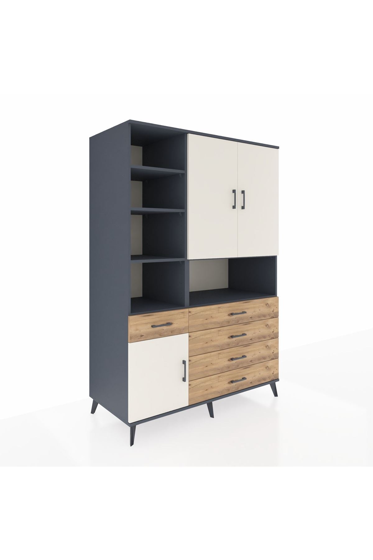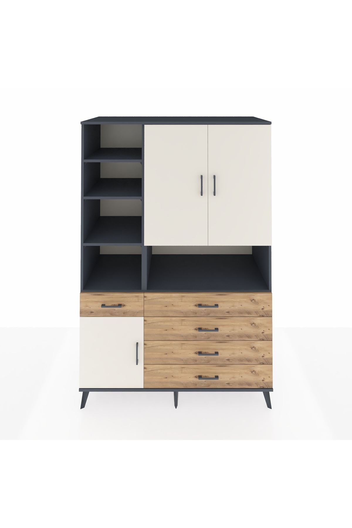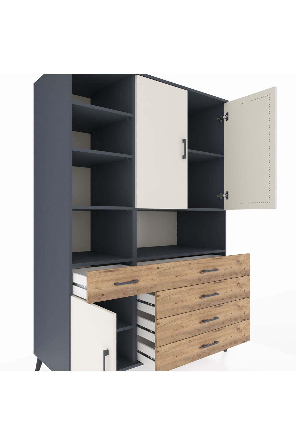 132 cm genişliği, 59 cm derinliği ve 195 cm yüksekliğiyle geniş bir depolama alanı sunuyor. 8 rafı, 5 çekmecesi ve 3 kapaklı bölmesiyle dilediğiniz eşyaları kolayca organize edebilirsiniz. Benzersiz Antrasit-Aytaşı/Çam renk kombinasyonu, her ortama zarif bir dokunuş katar.
