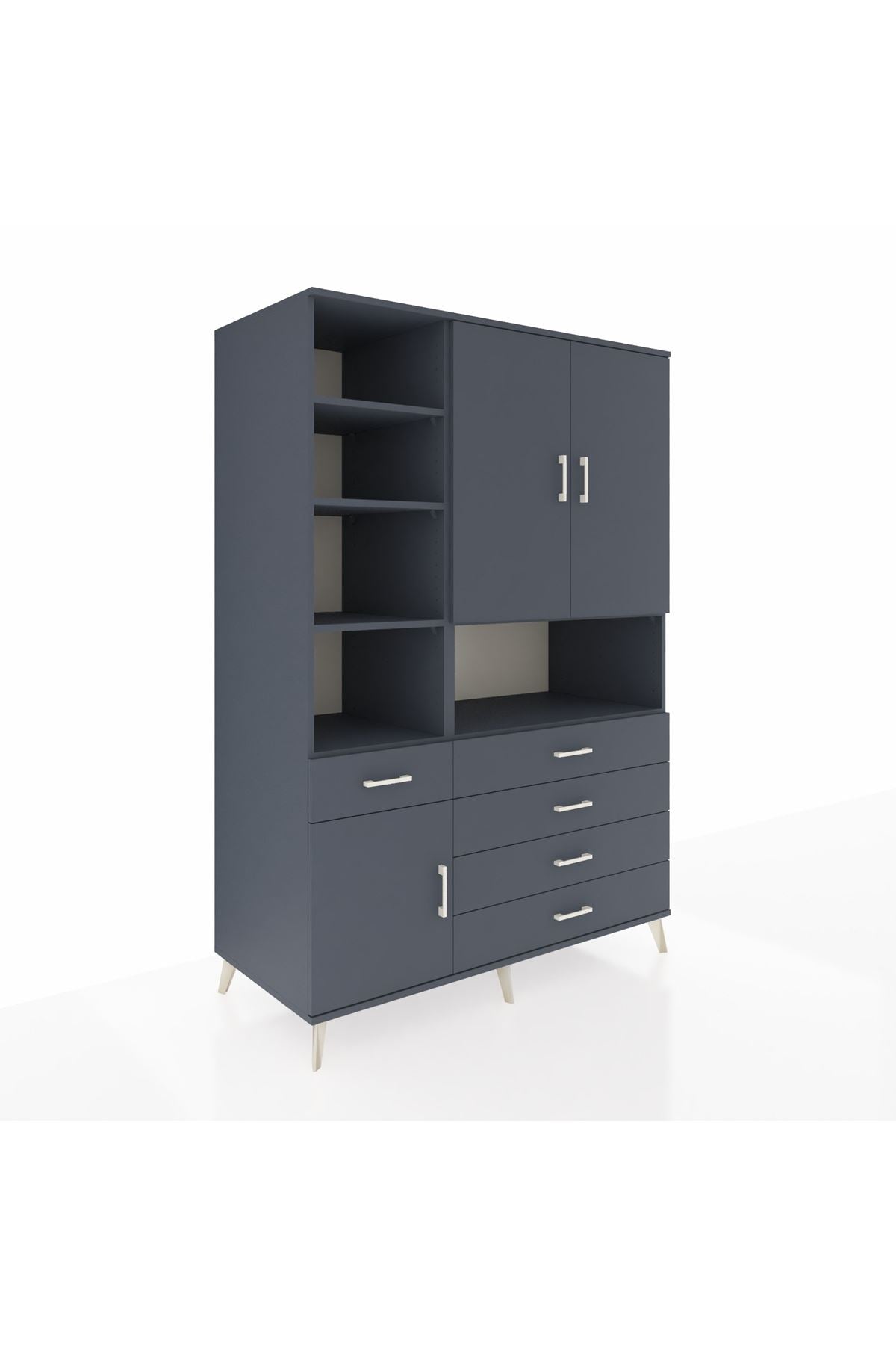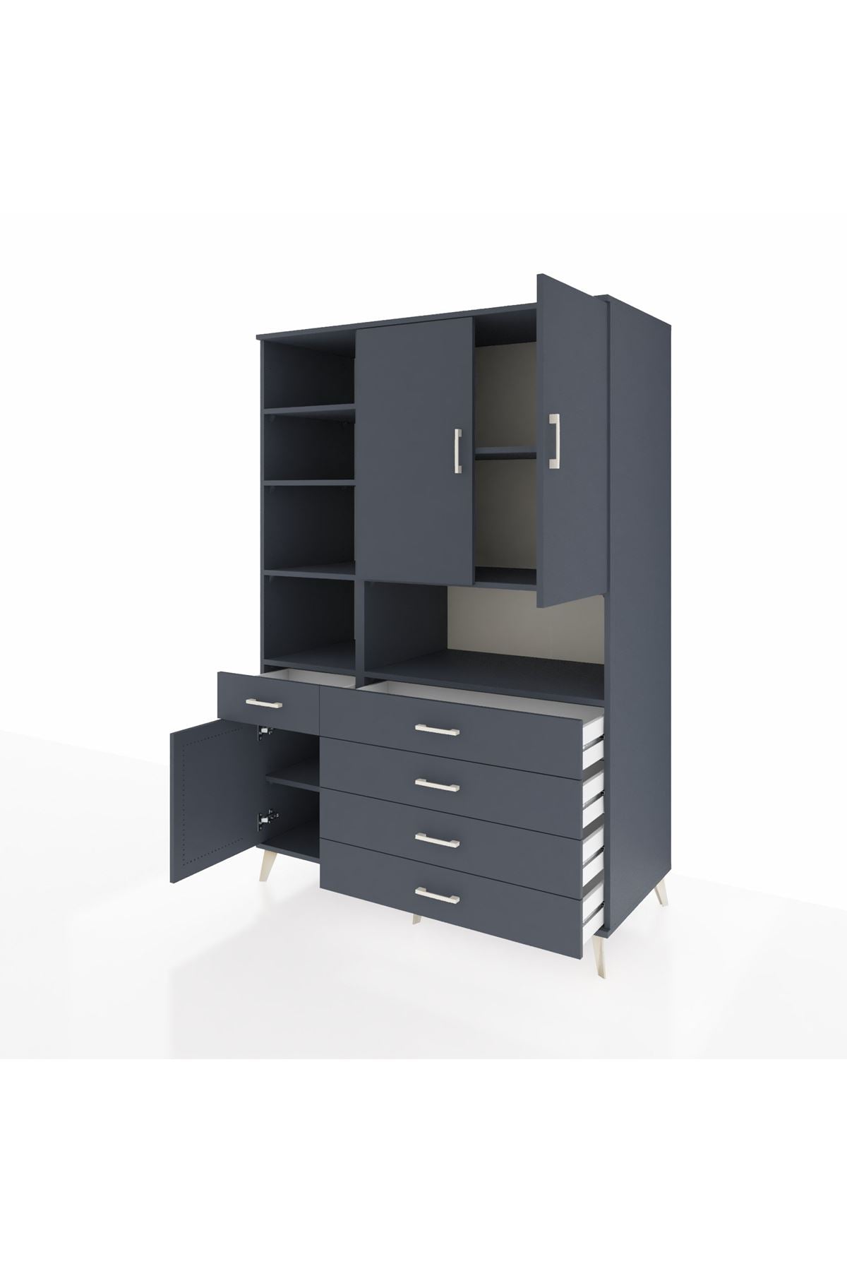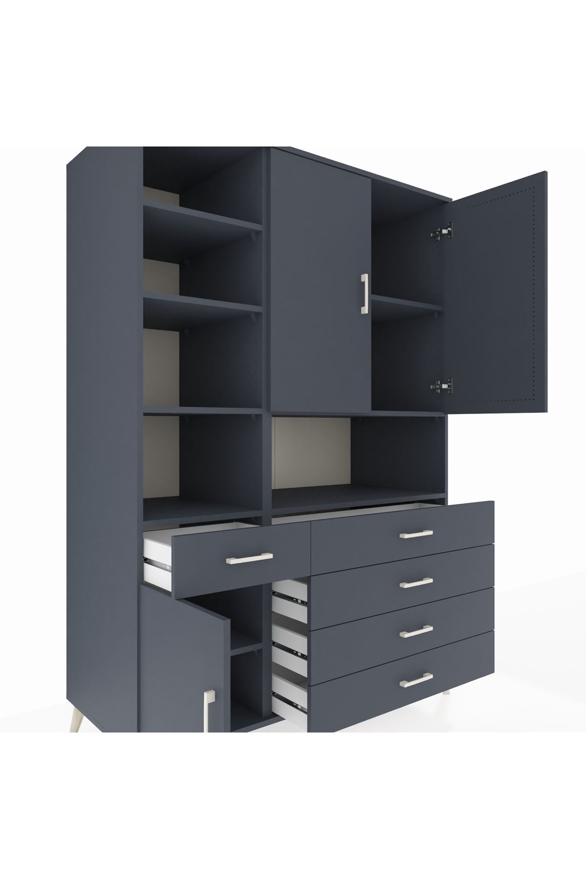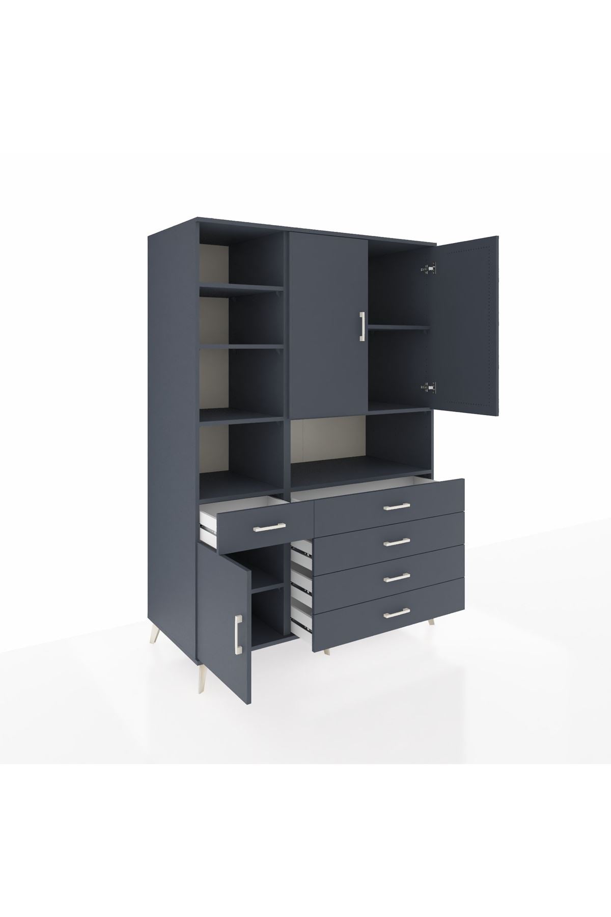 Geniş iç hacmi sayesinde 8 raf ve 5 çekmeceyle tüm ihtiyaçlarınızı kolayca organize edebilirsiniz. 3 kapaklı tasarımı hem estetik hem de kullanım kolaylığı sunar. 132 cm genişliği ve 195 cm yüksekliğiyle büyük odalar ve depolama ihtiyacı yüksek alanlar için idealdir.