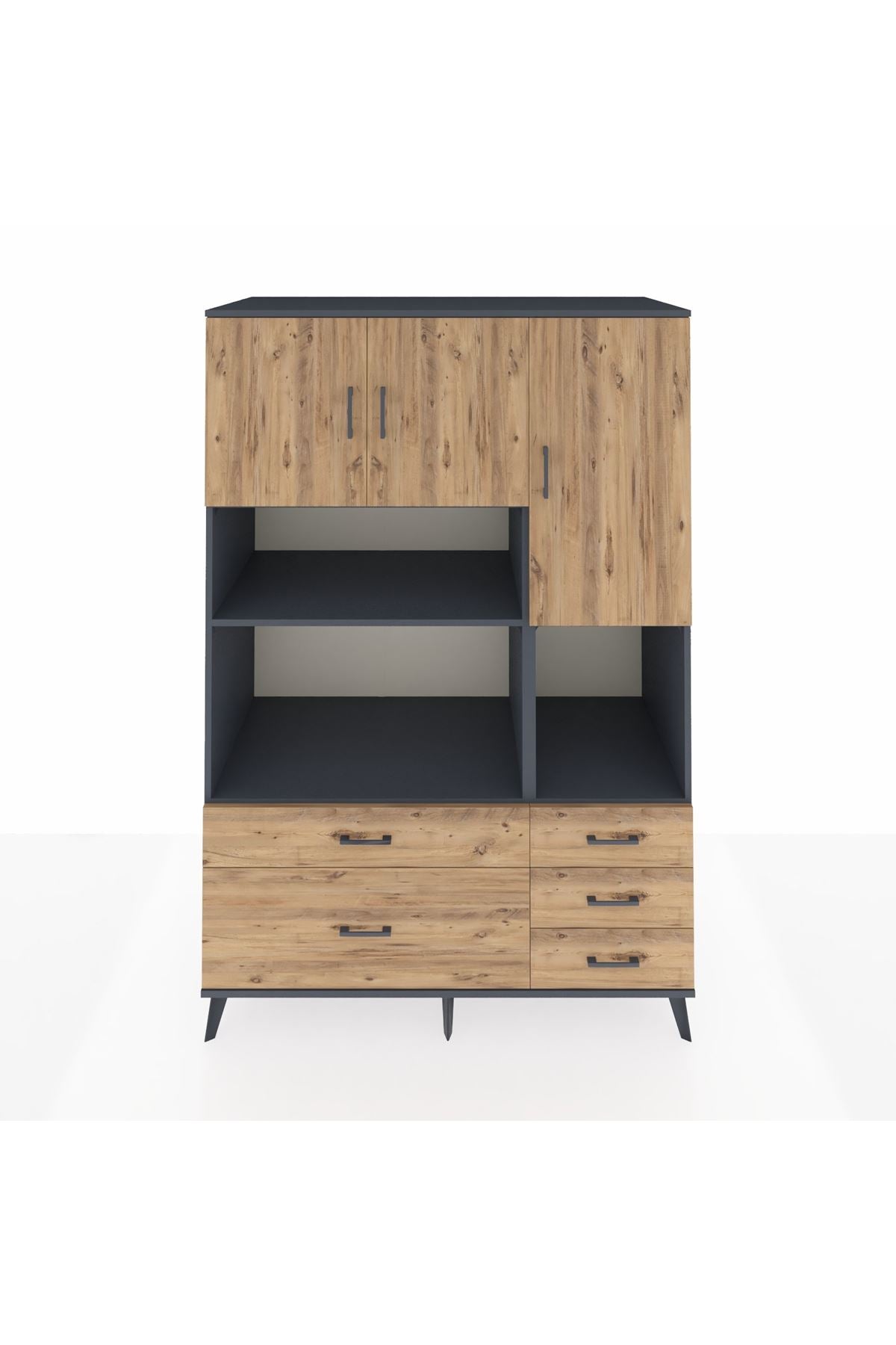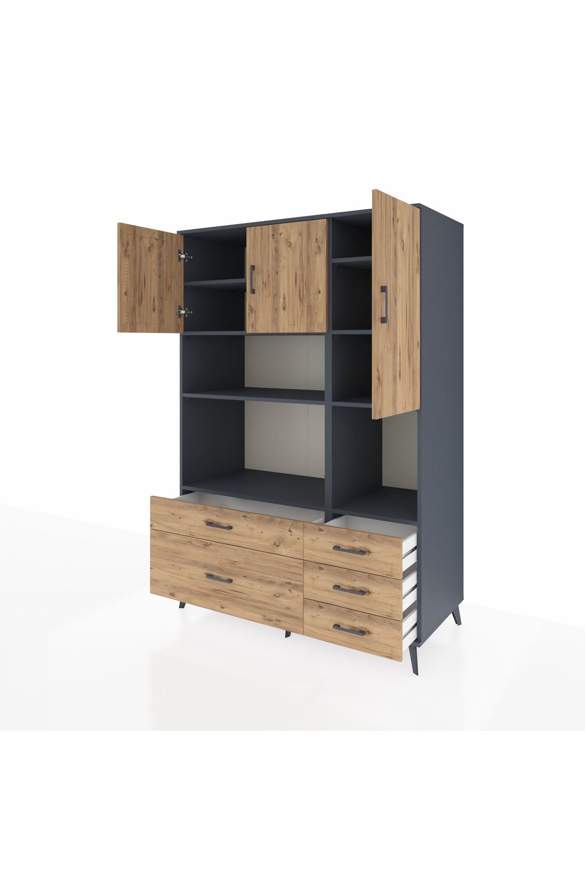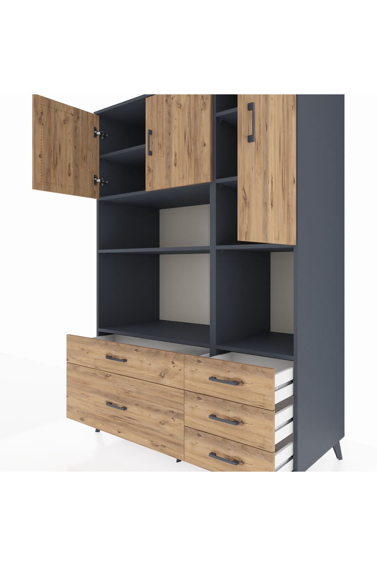 Kronos Dolap 8 Raflı 5 Çekmeceli 3 Kapaklı 132x59x195 Antrasit-Çam/Çam