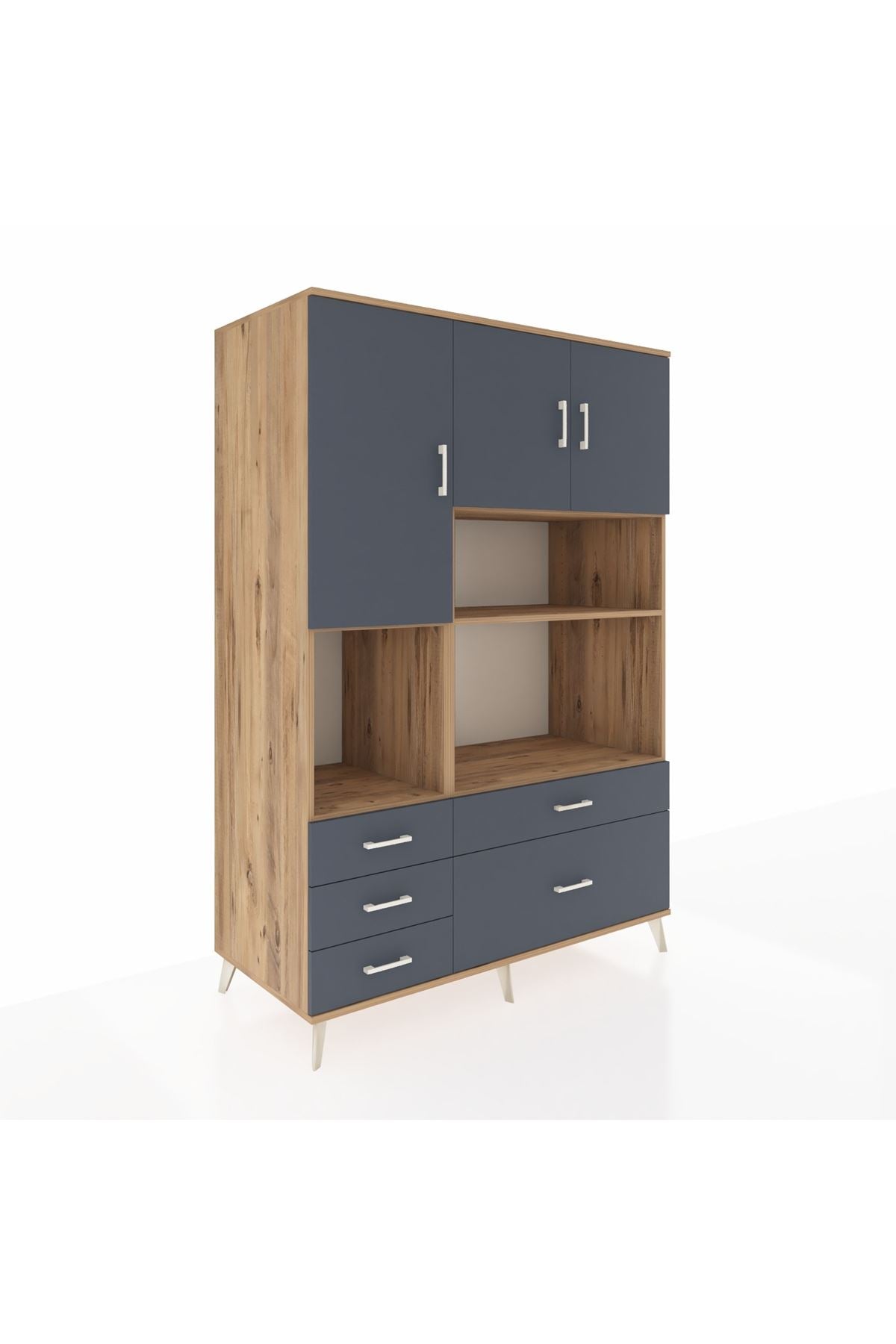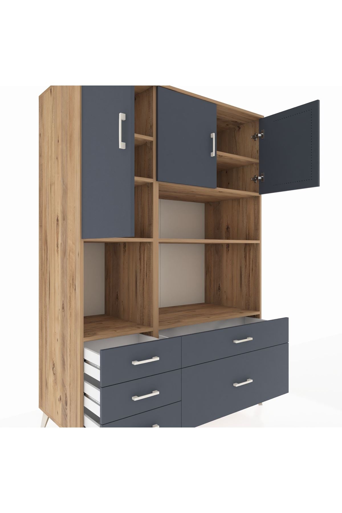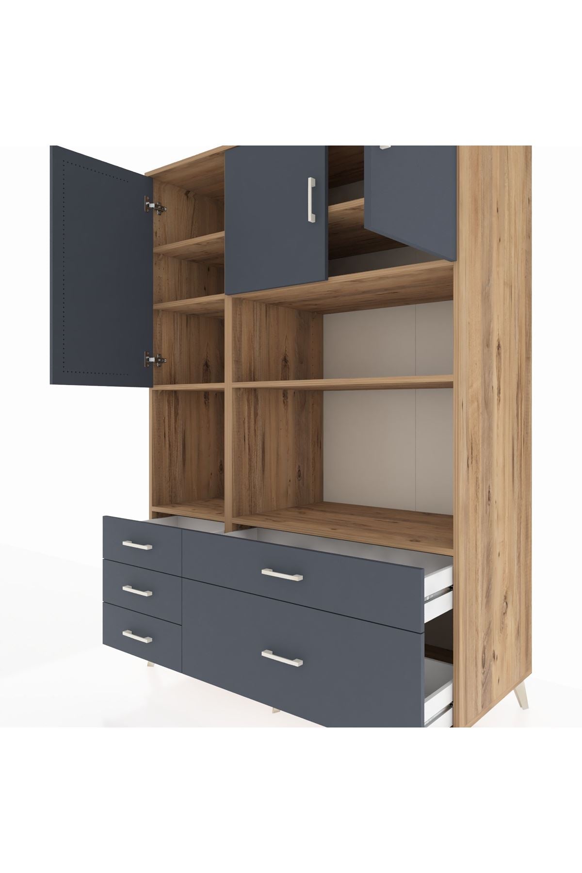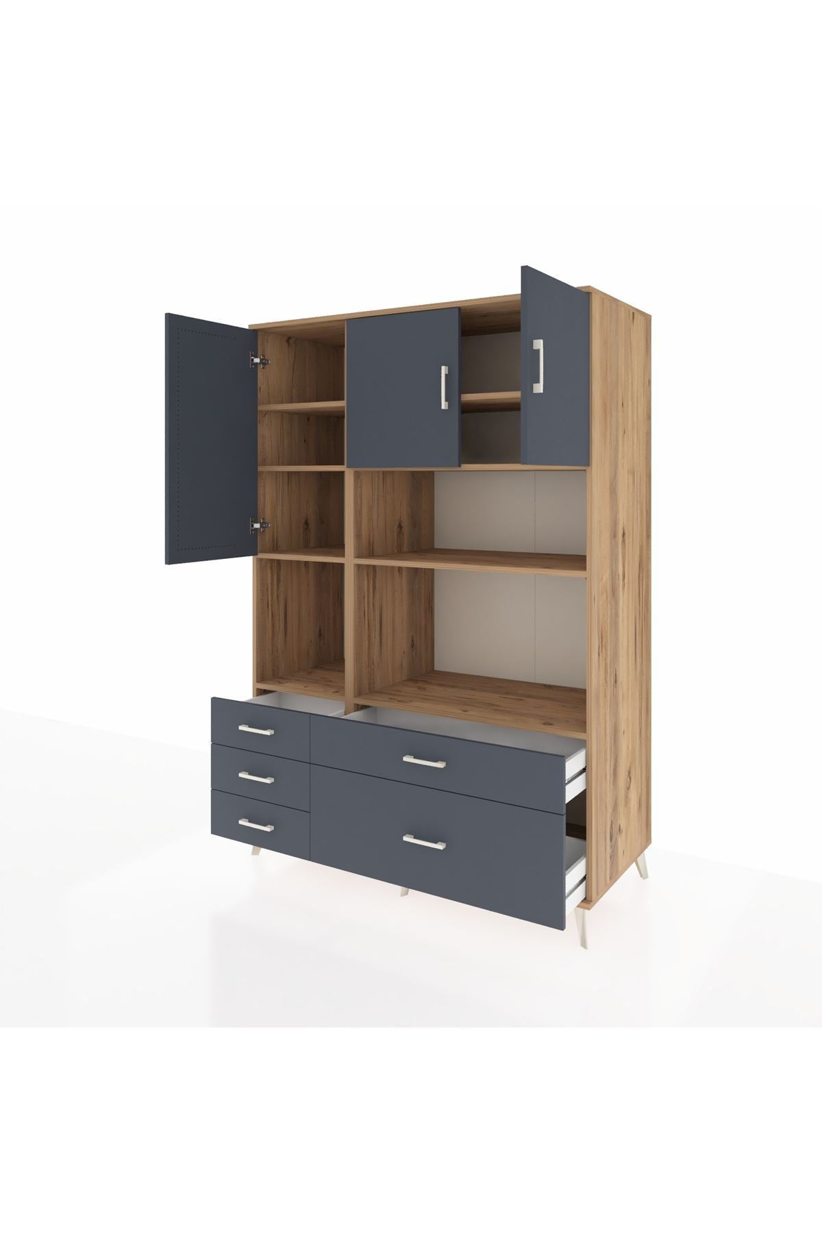 Çam ve antrasit renk kombinasyonu; mekâna doğal bir sıcaklık ve modern bir hava katar. 🌲🖤 3 kapaklı bölme, 8 geniş raf ve 5 çekmecesiyle farklı eşyalarınızı kolayca kategorize edebilirsiniz.