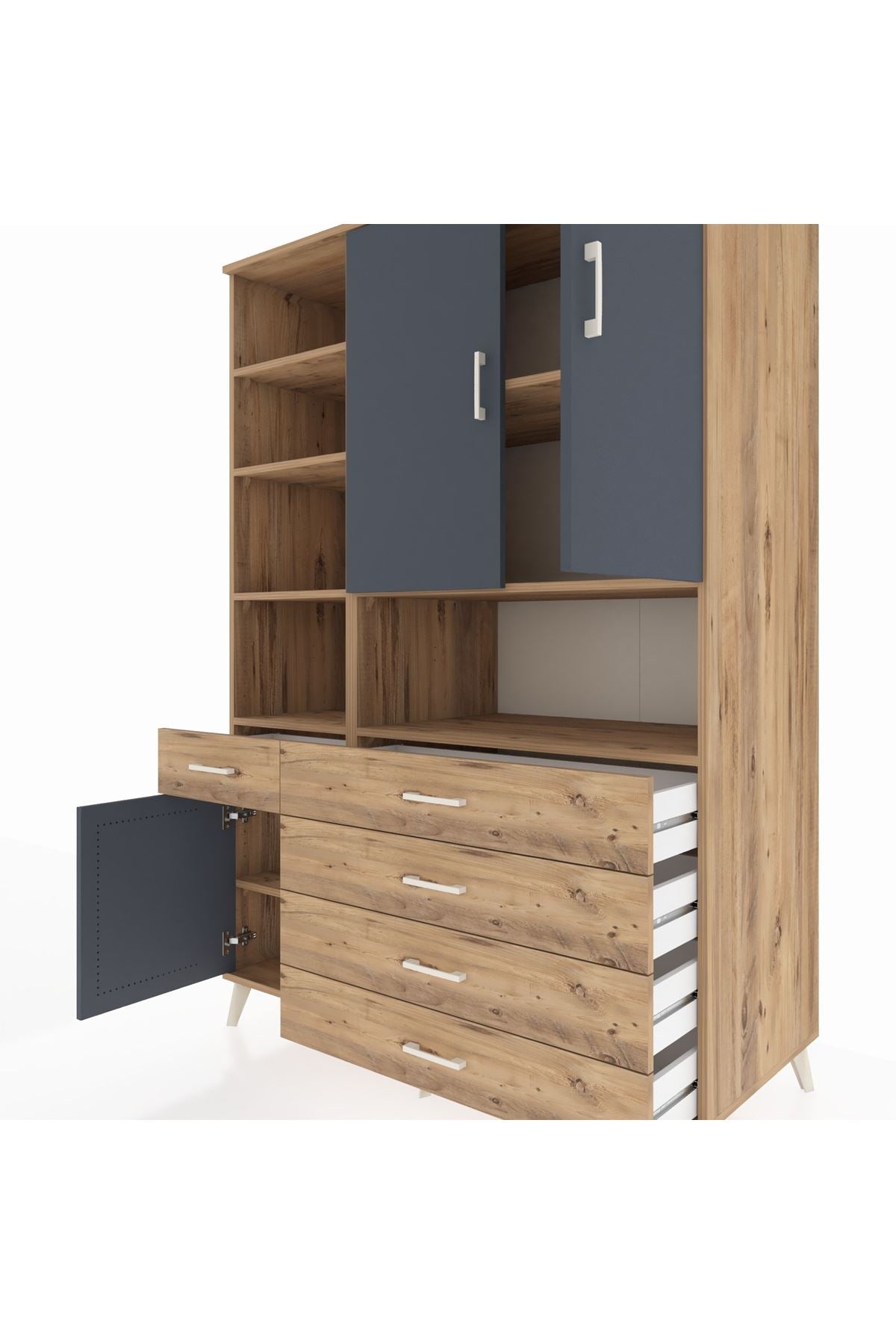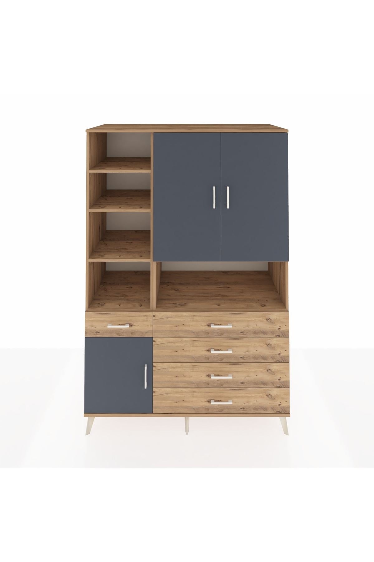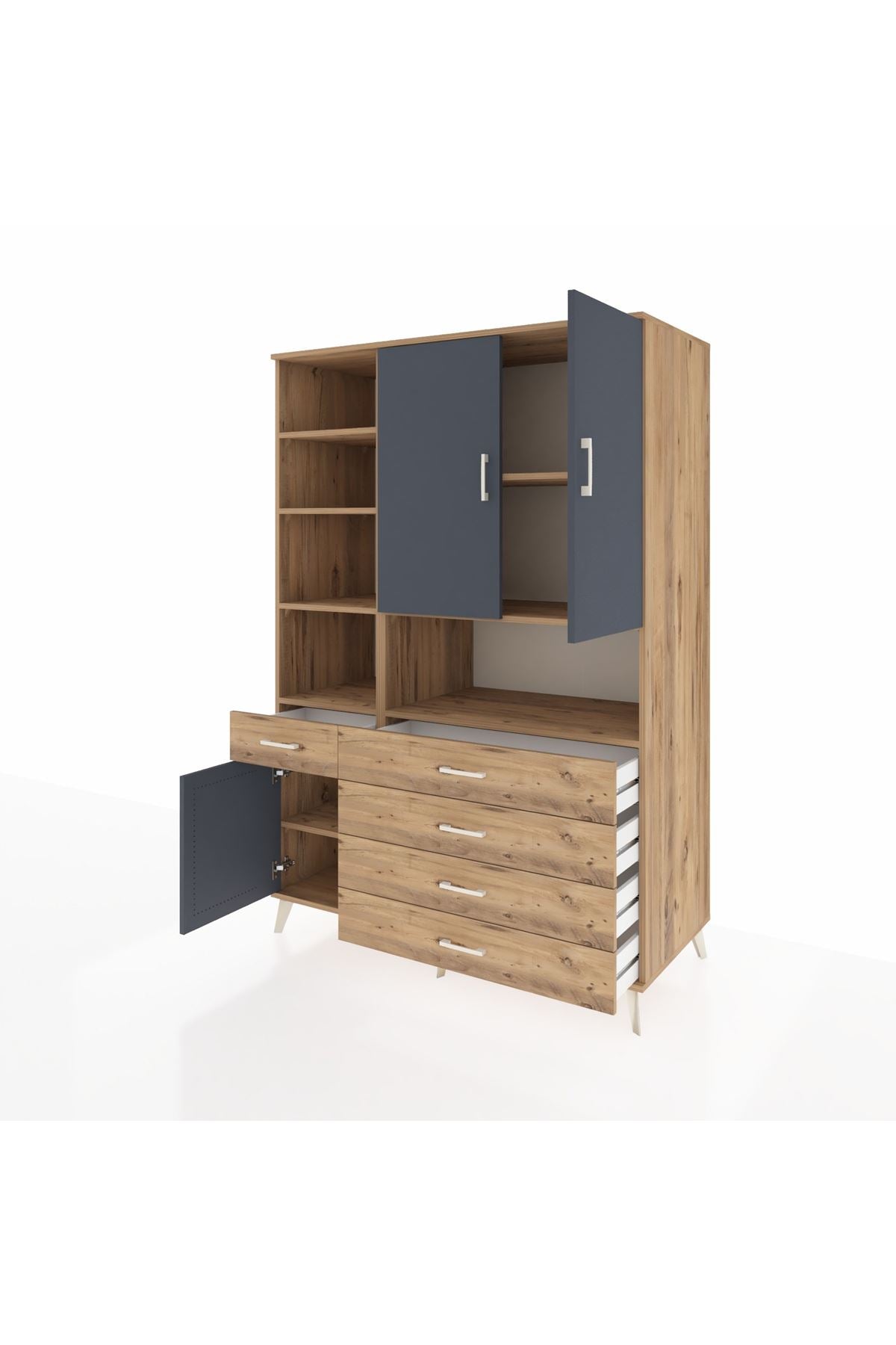 Çam ve antrasit renk kombinasyonu sayesinde hem sıcak hem de modern bir atmosfer yaratır 8 geniş rafı, 5 fonksiyonel çekmecesi ve 3 kapaklı bölümüyle her türlü depolama ihtiyacınıza cevap verir 🗄️ 132 cm genişliği, 59 cm derinliği ve 195 cm yüksekliğiyle geniş iç hacim sunar