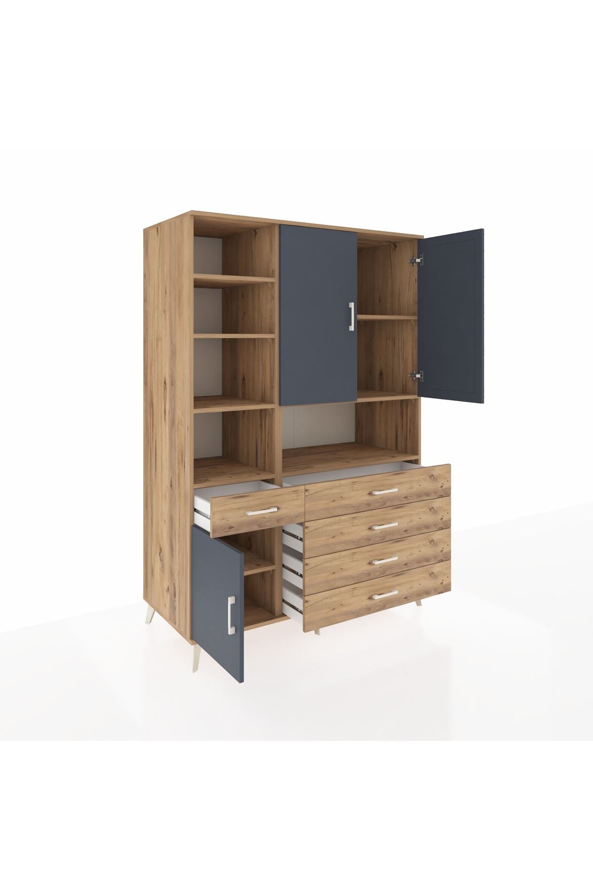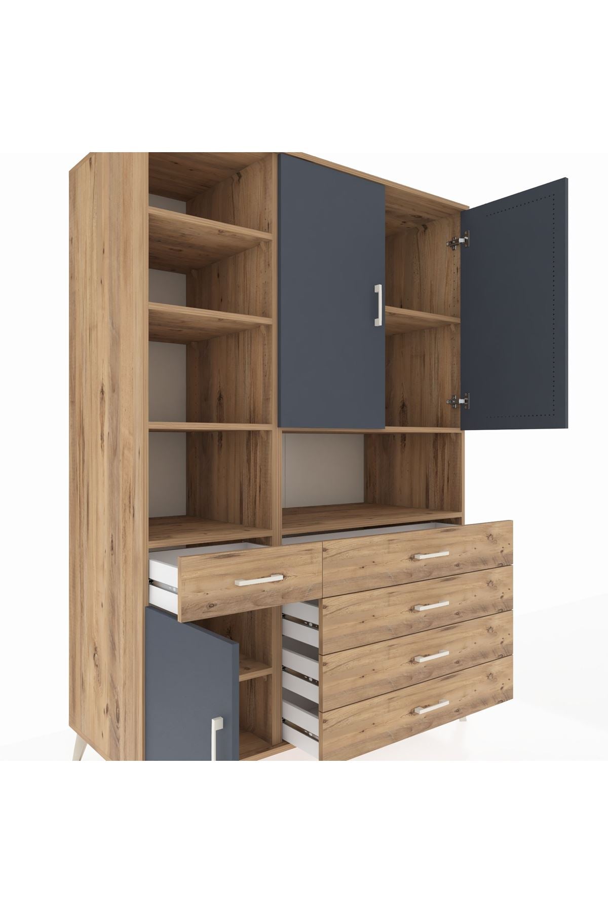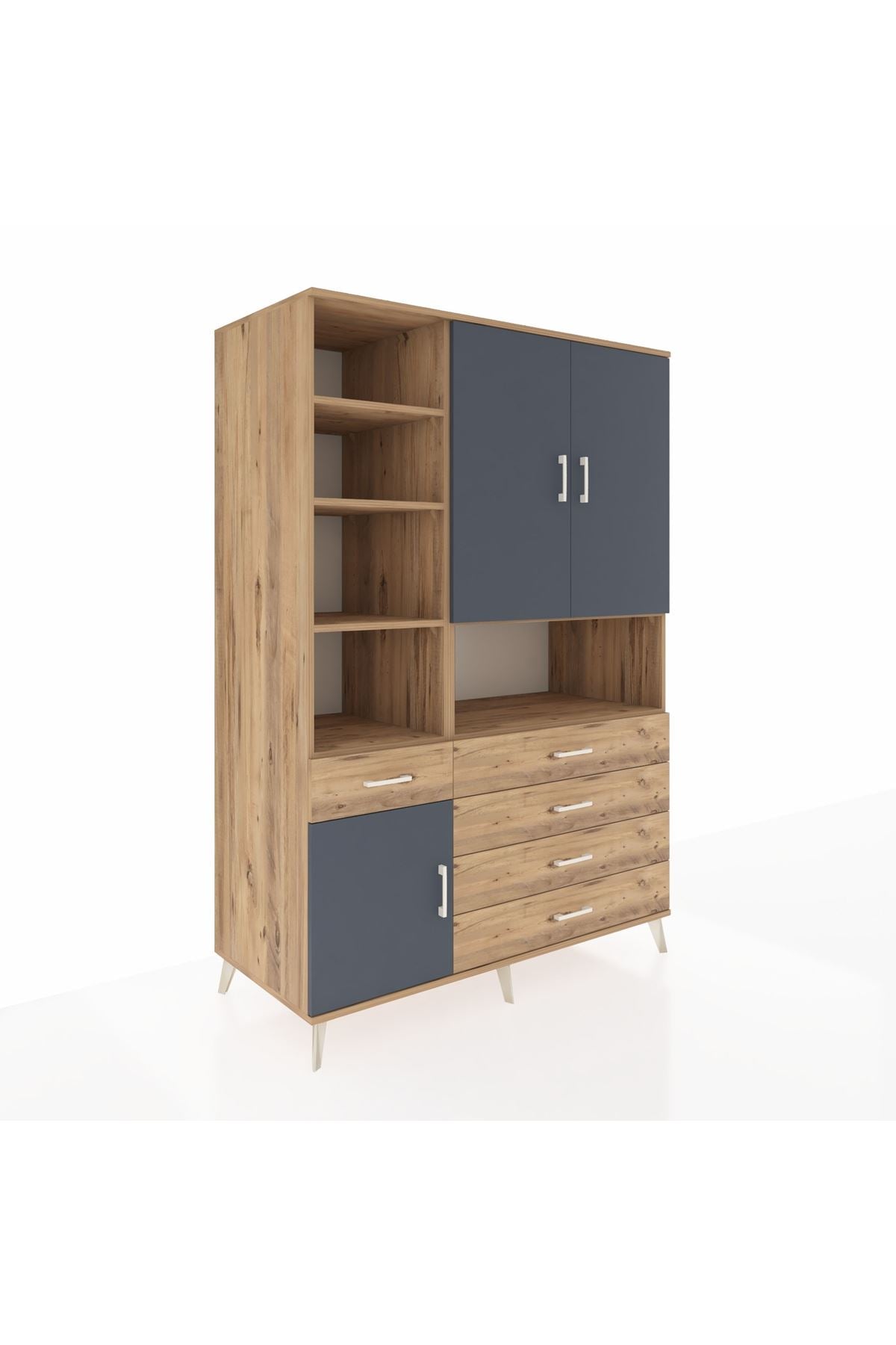 Çam ve antrasit renk kombinasyonu sayesinde hem sıcak hem de modern bir atmosfer yaratır 8 geniş rafı, 5 fonksiyonel çekmecesi ve 3 kapaklı bölümüyle her türlü depolama ihtiyacınıza cevap verir 🗄️ 132 cm genişliği, 59 cm derinliği ve 195 cm yüksekliğiyle geniş iç hacim sunar