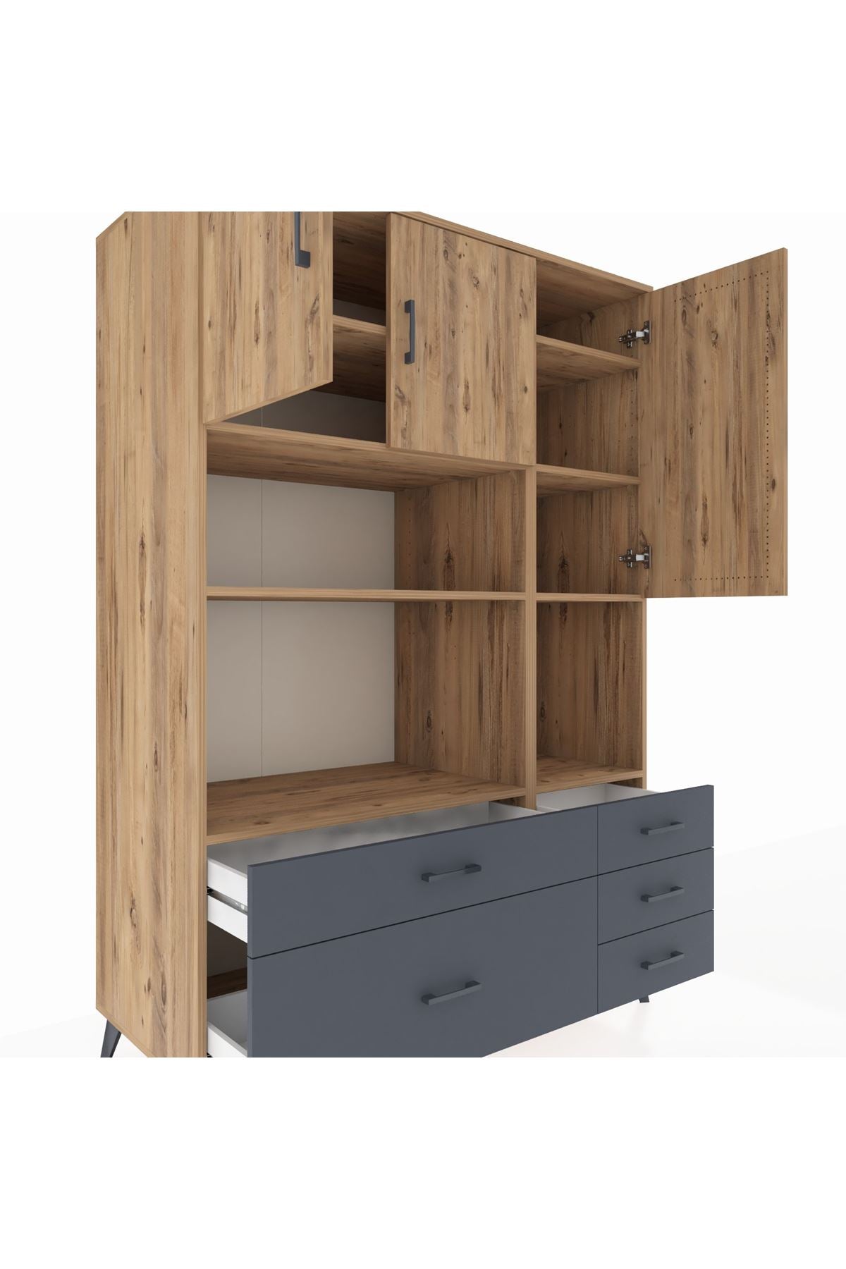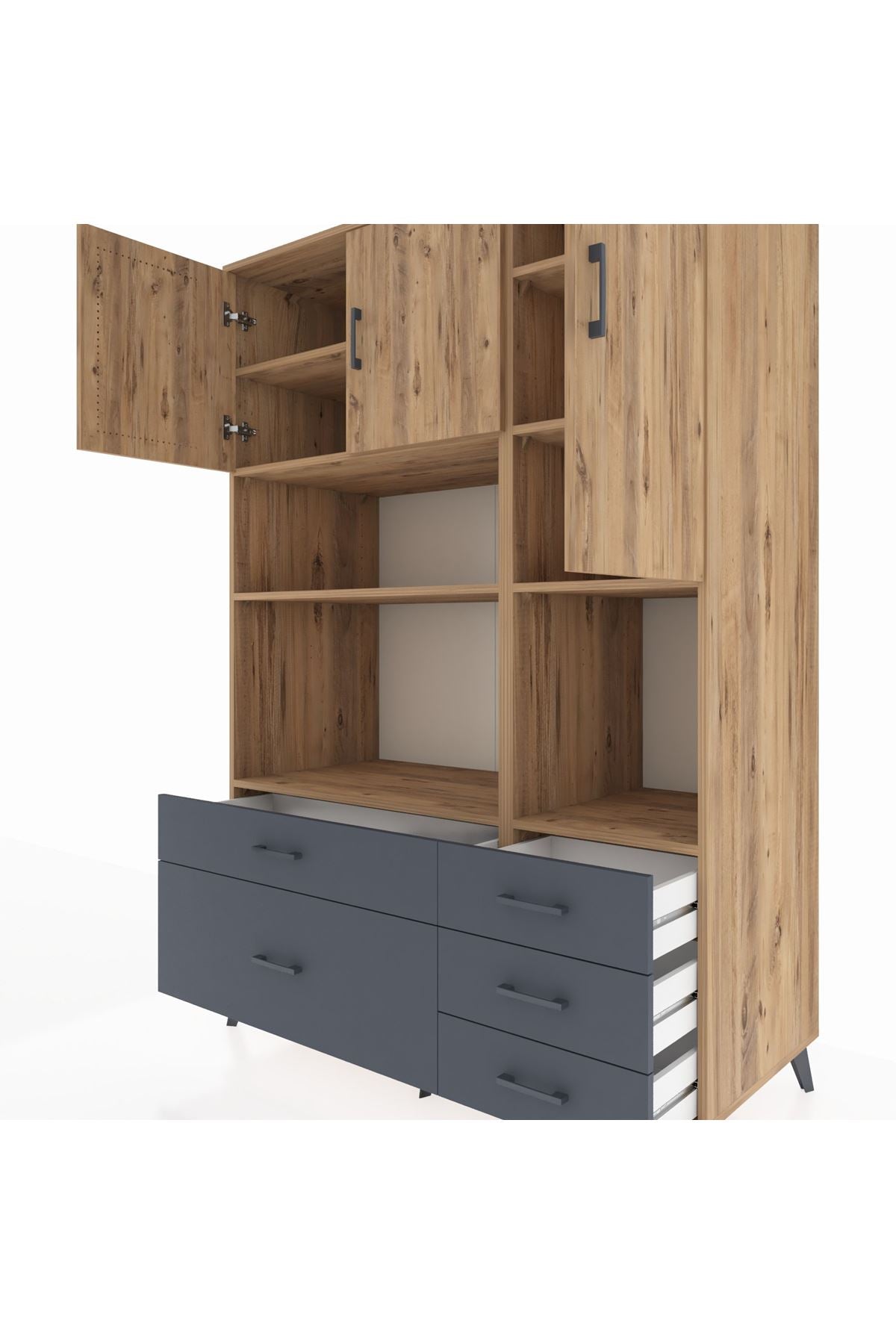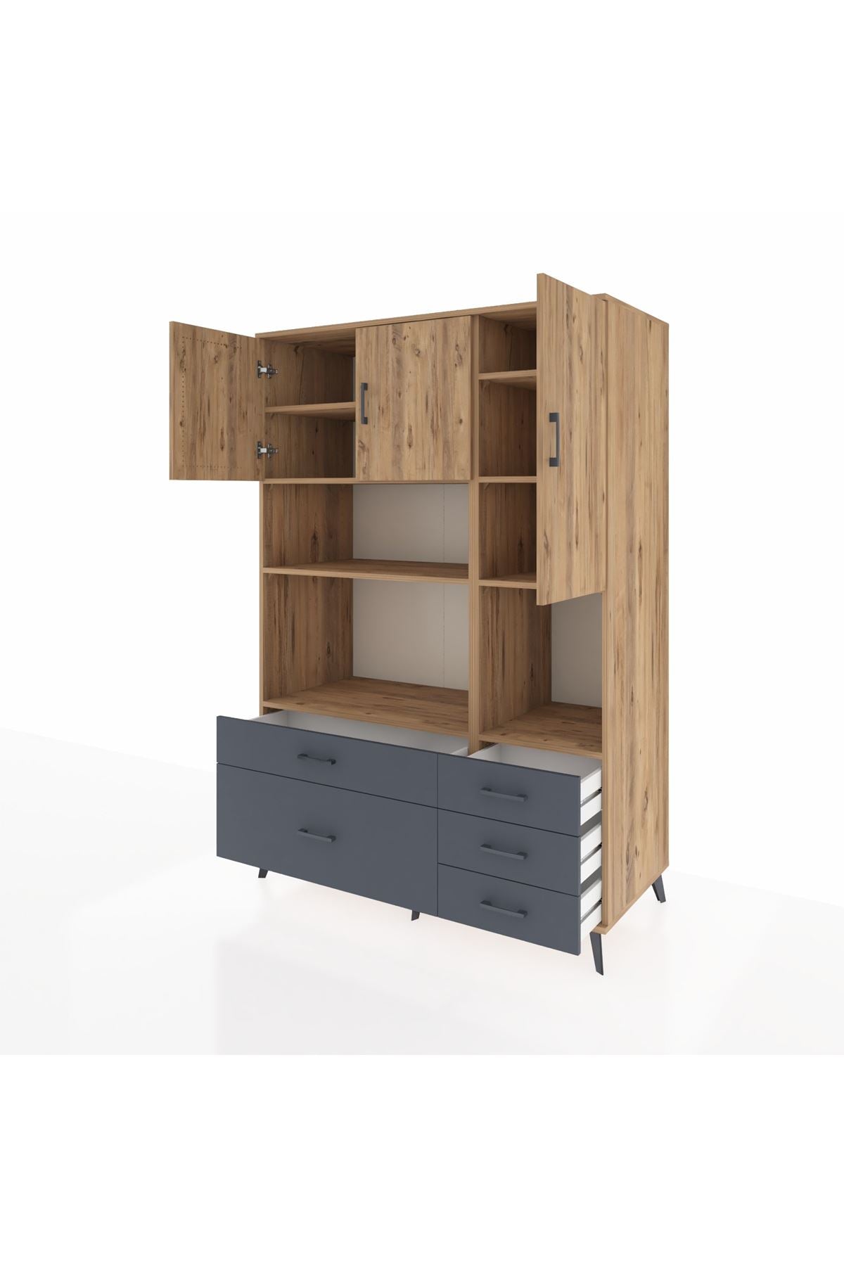 Kronos Dolap 8 Raflı 5 Çekmeceli 3 Kapaklı 132x59x195 Çam-Çam/Antrasit