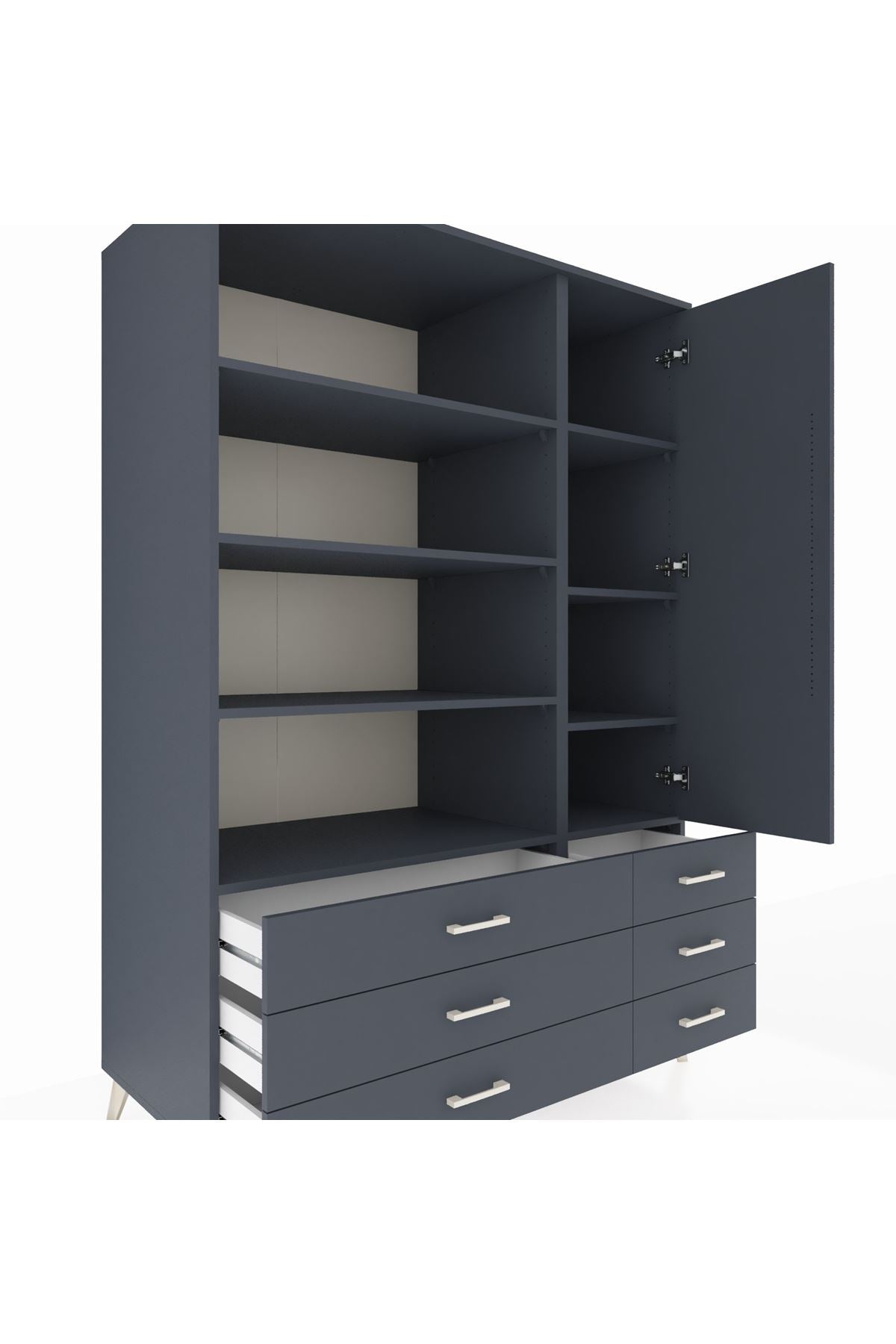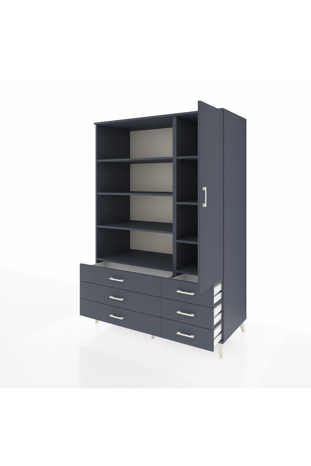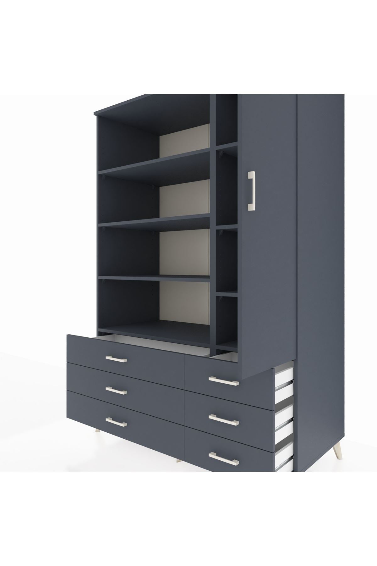 Modern antrasit tonuyla hem minimalist hem sofistike bir görünüm sunarken, 8 raf ve 6 çekmecesiyle maksimum depolama alanı sağlıyor.