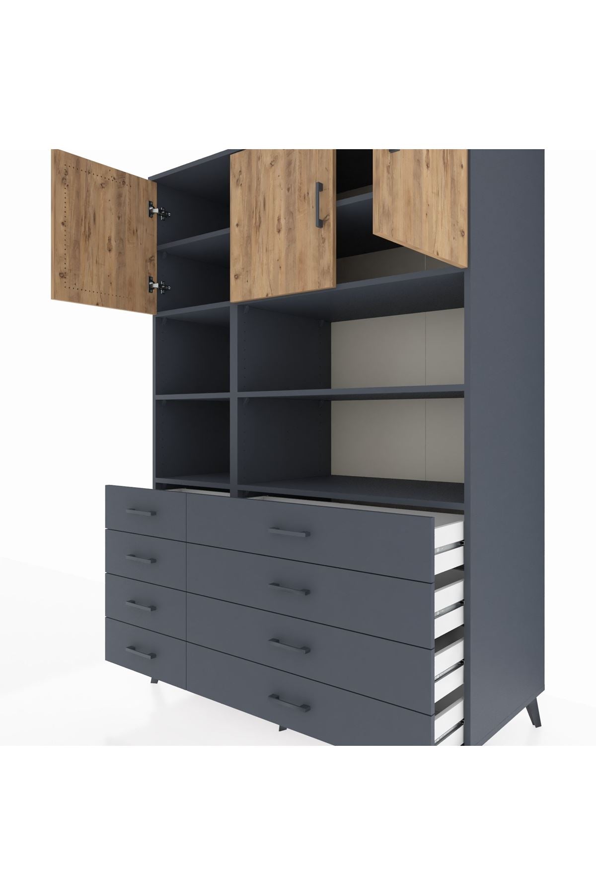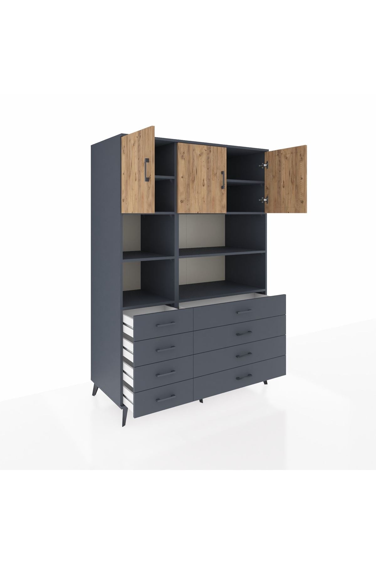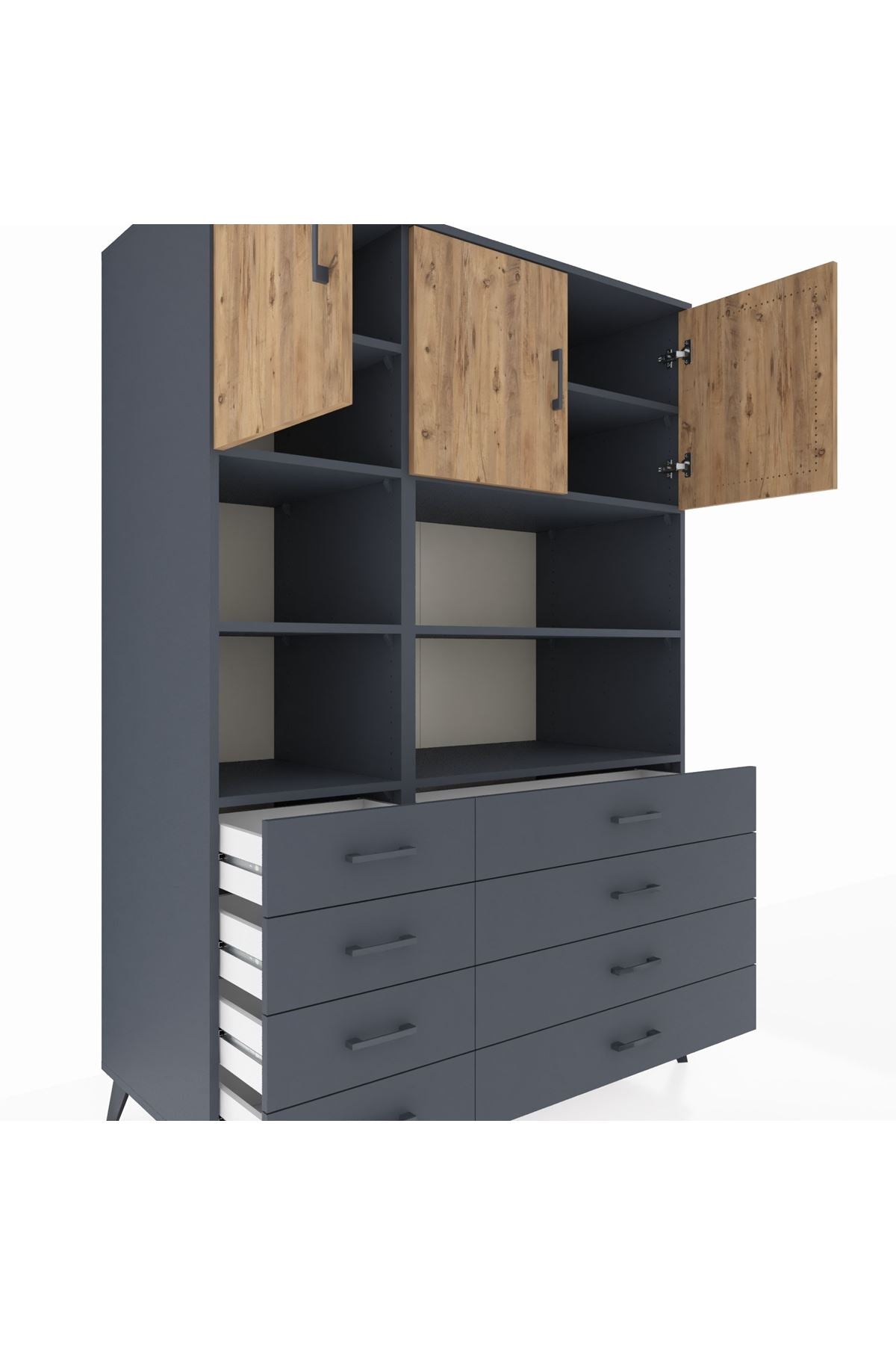 Kronos Dolap 8 Raflı 8 Çekmeceli 3 Kapaklı 132x59x195 Antrasit-Çam/Antrasit