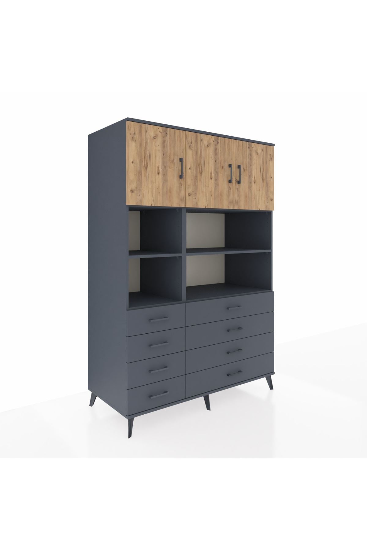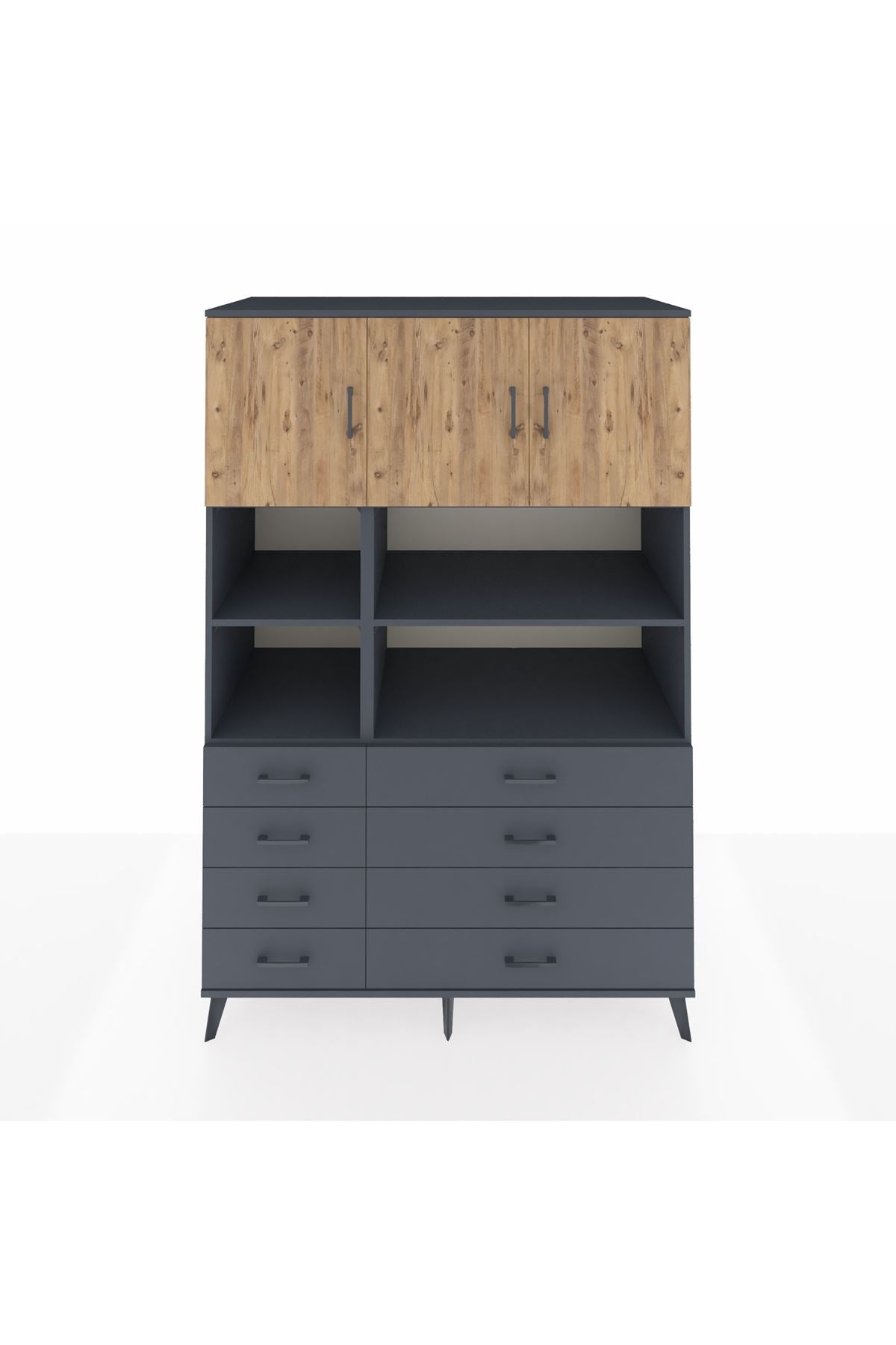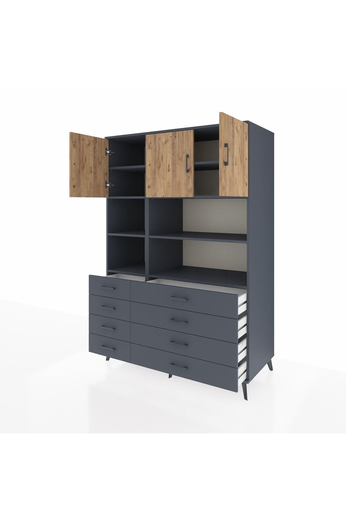 Kronos Dolap 8 Raflı 8 Çekmeceli 3 Kapaklı 132x59x195 Antrasit-Çam/Antrasit