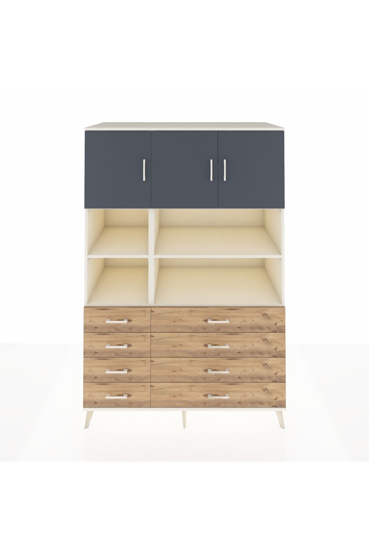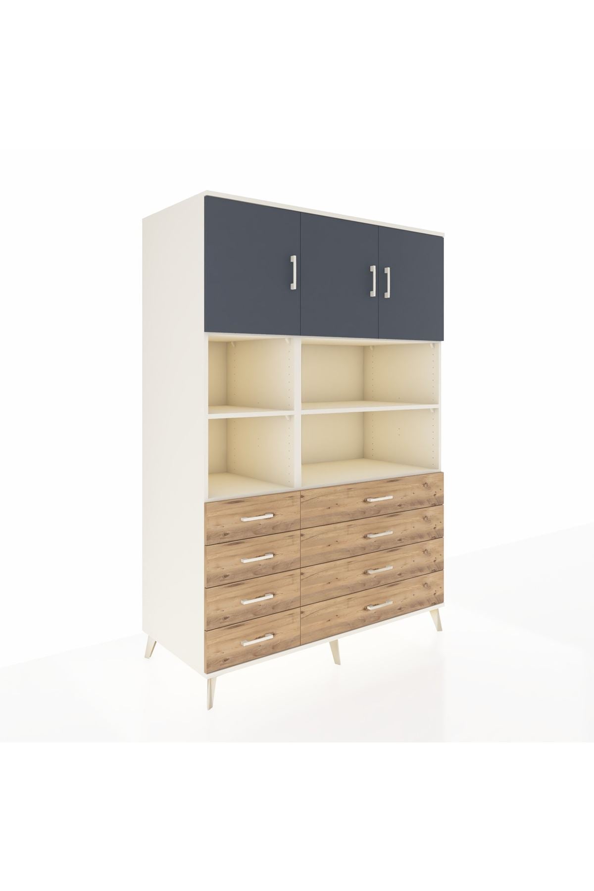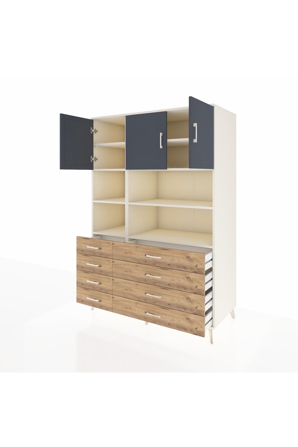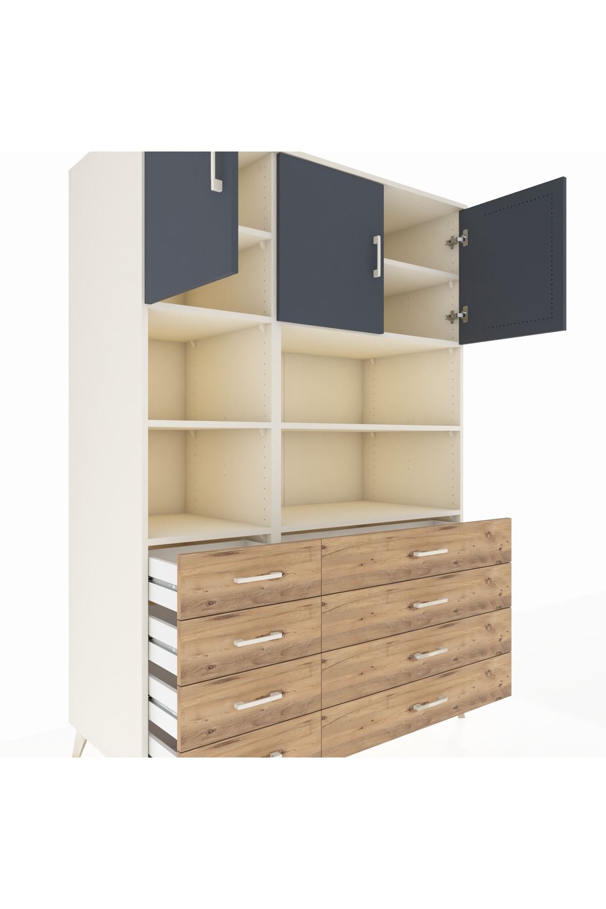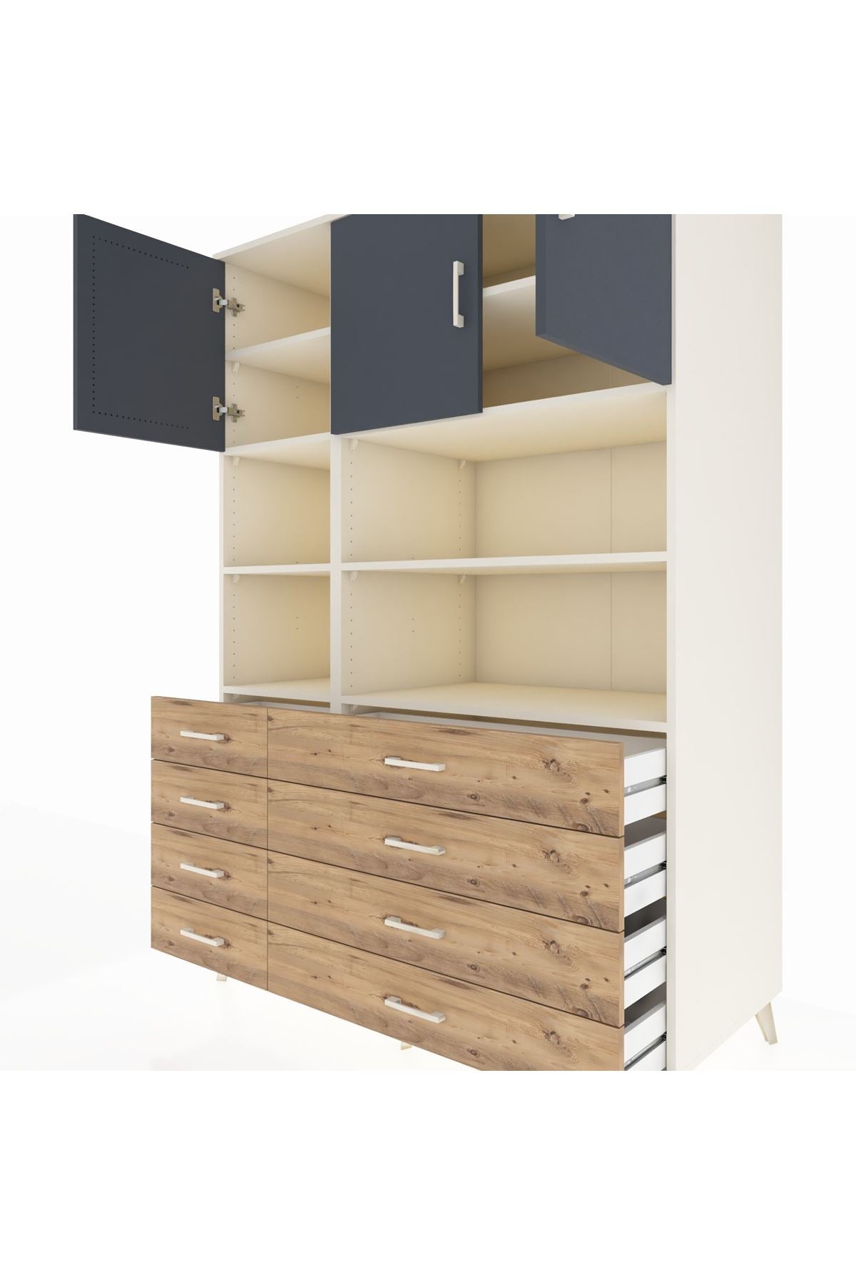 132 cm genişliği, 59 cm derinliği ve 195 cm yüksekliğiyle bu dolap, çok amaçlı kullanımlar için tasarlanmıştır. 8 adet çekmecesi ve 8 geniş rafı ile kıyafetlerinizden ofis dosyalarınıza kadar her şeyi düzenli tutmanızı sağlar. 3 kapaklı bölümü ile büyük hacimli eşyalarınızı kolayca saklayabilirsiniz.