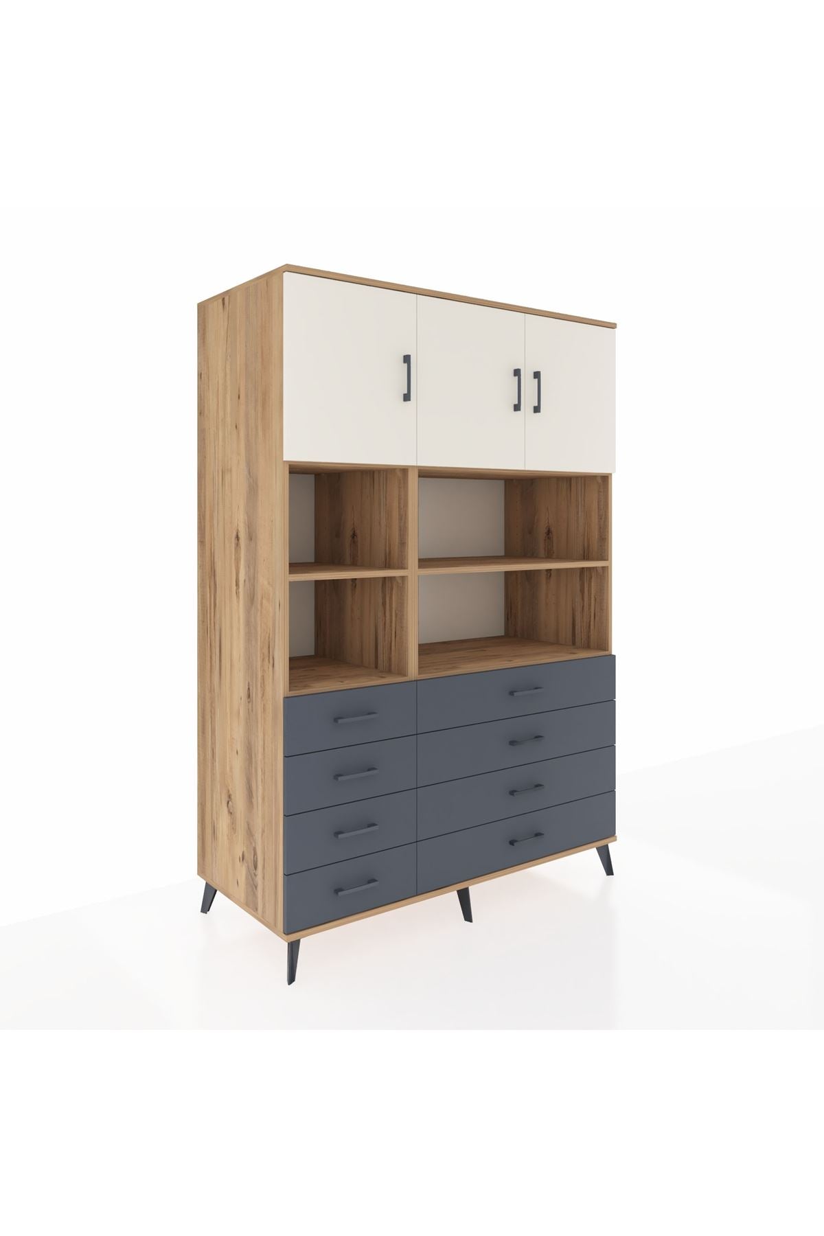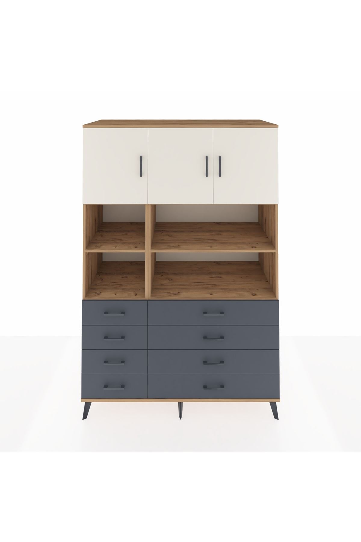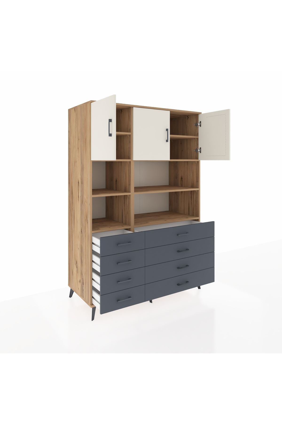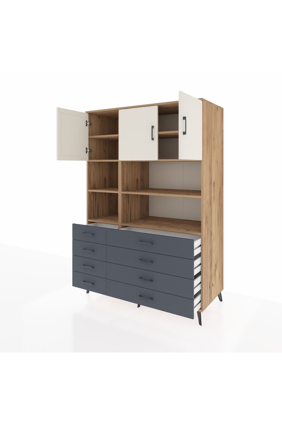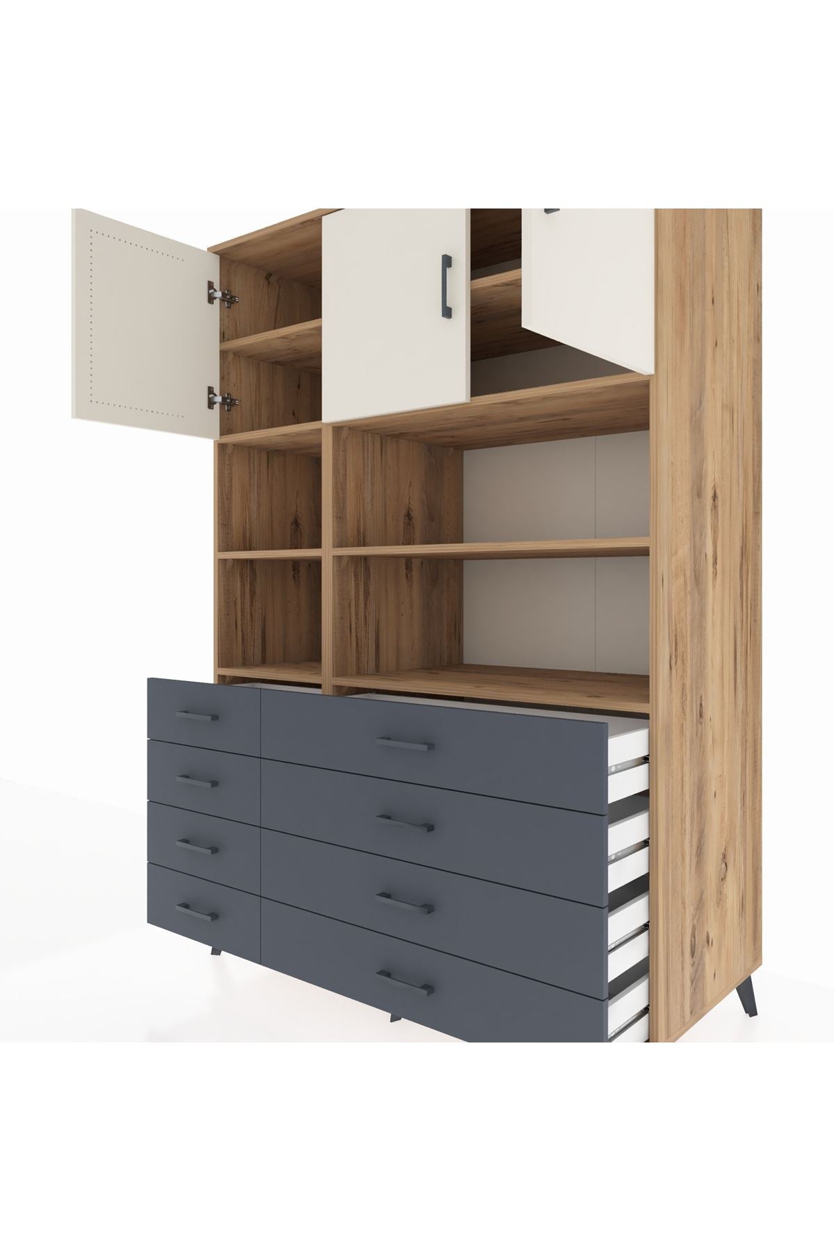 Üründe 8 adet çekmece ve 8 raf sayesinde dilediğiniz eşyalarınızı düzenli biçimde saklayabilirsiniz 🗄️ Üç kapaklı yapısı, hem kullanım kolaylığı hem de estetik bir görünüm sağlar 🚪