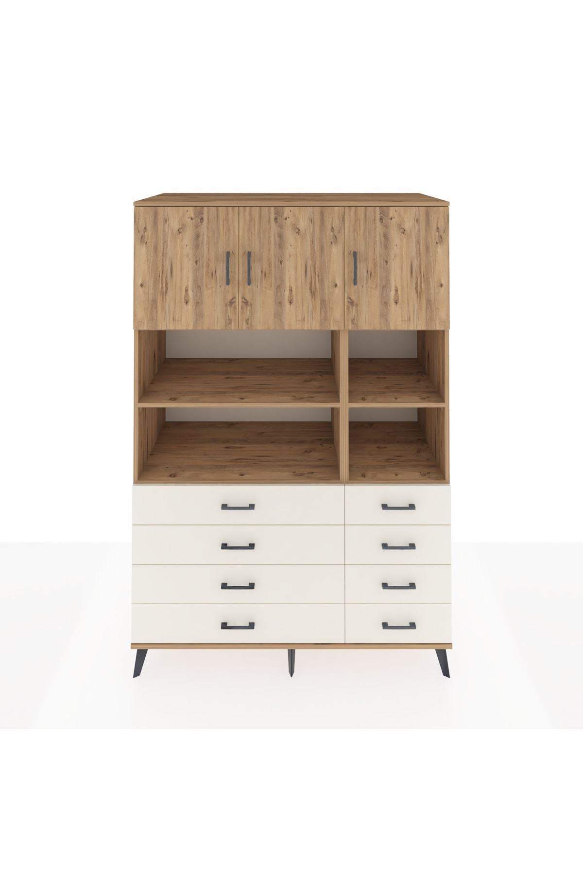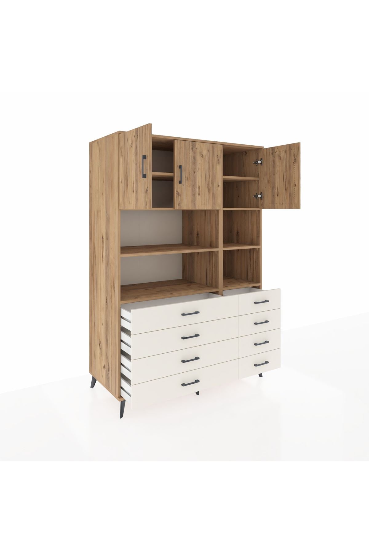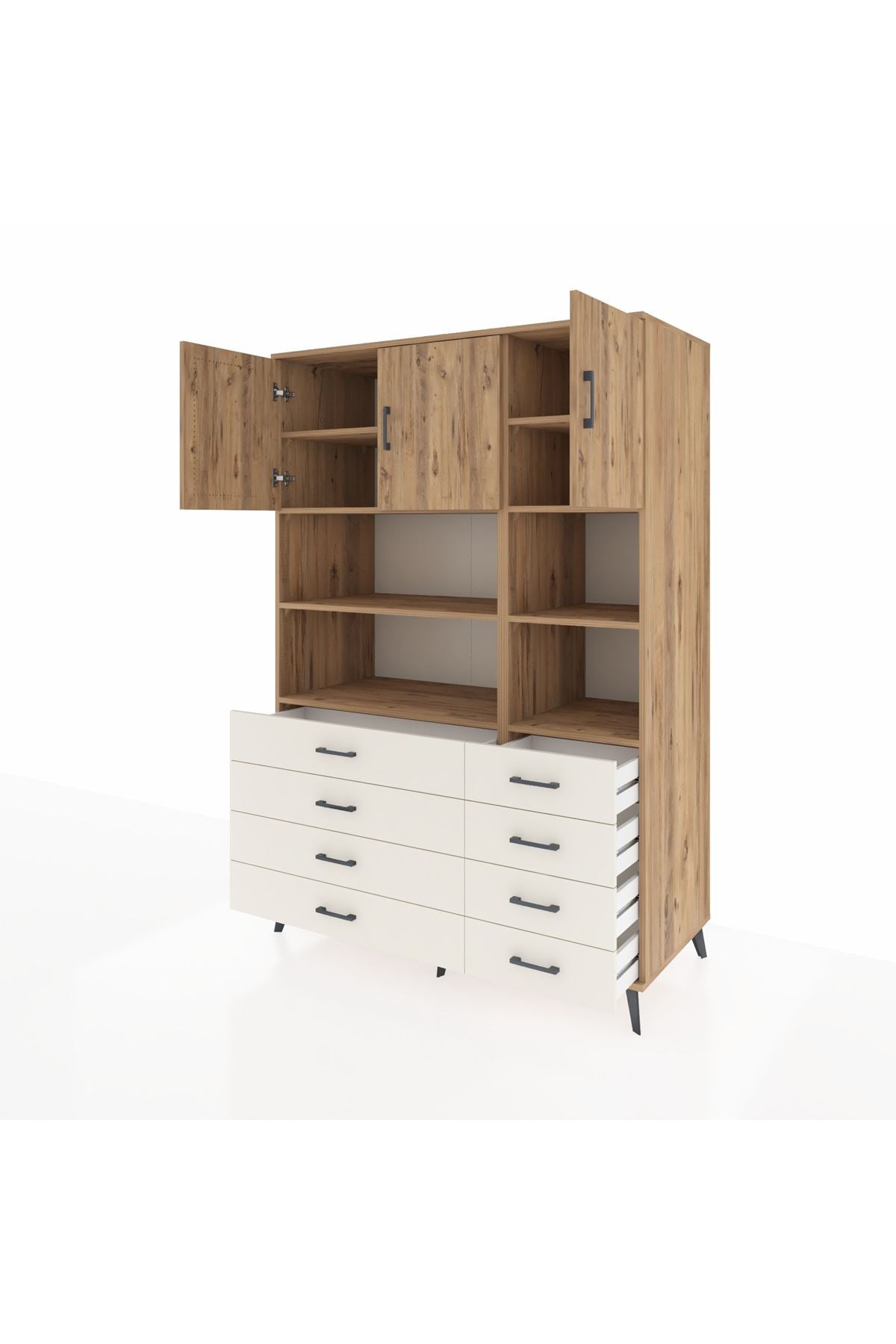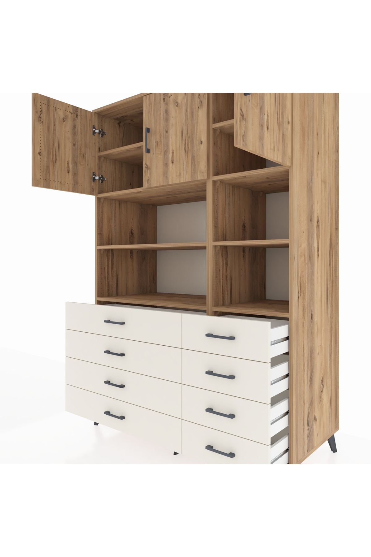 🌲 Kronos Dolap 8 Raflı 8 Çekmeceli 3 Kapaklı 132x59x195 Çam-Çam/Aytaşı ile Eşsiz Düzen!