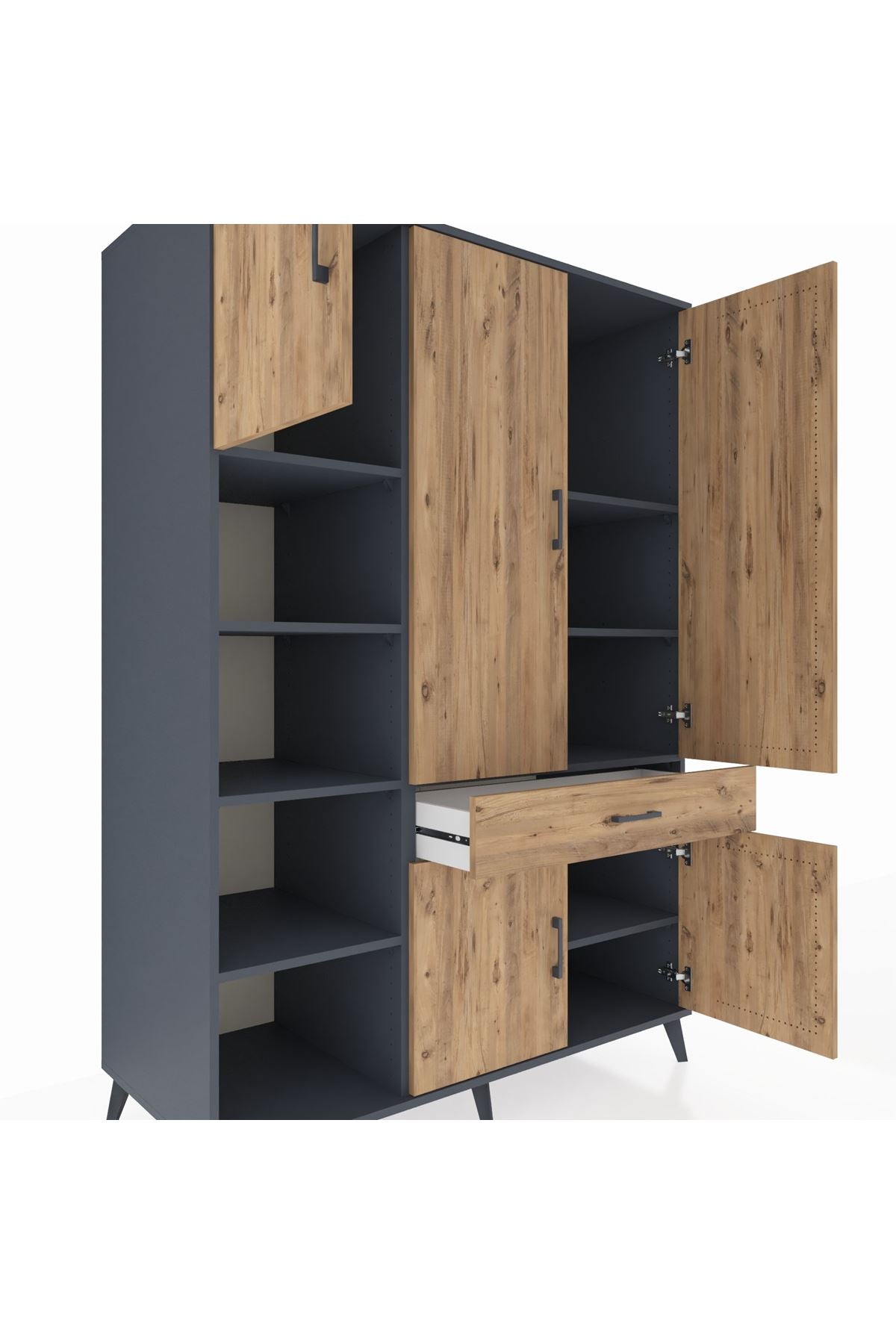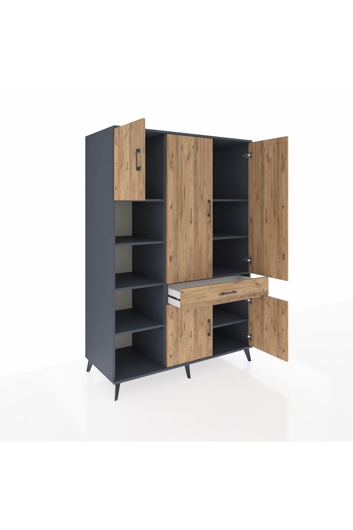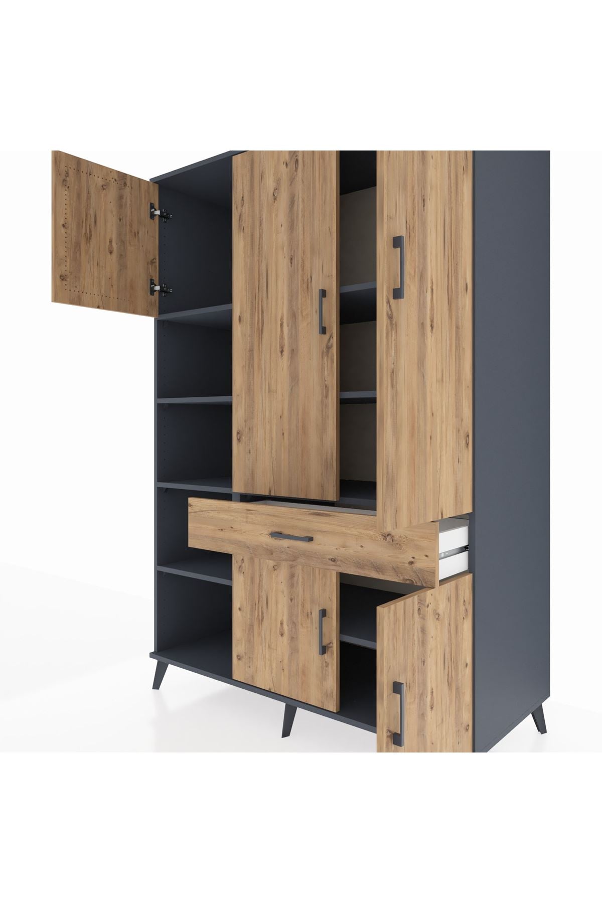 Kronos Dolap 8 Raflı Tek Çekmeceli 5 Kapaklı 132x59x195 Antrasit-Çam/Çam