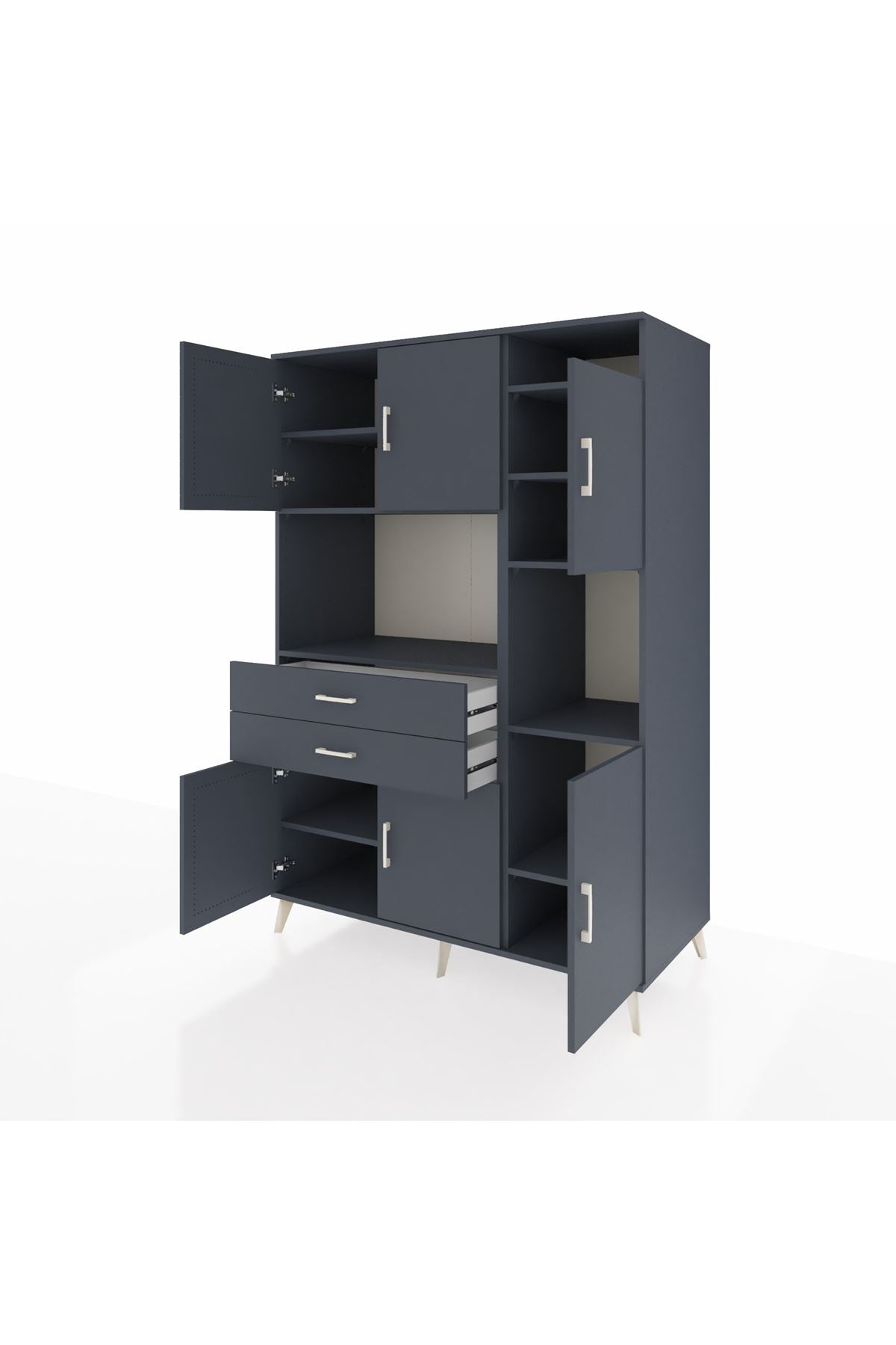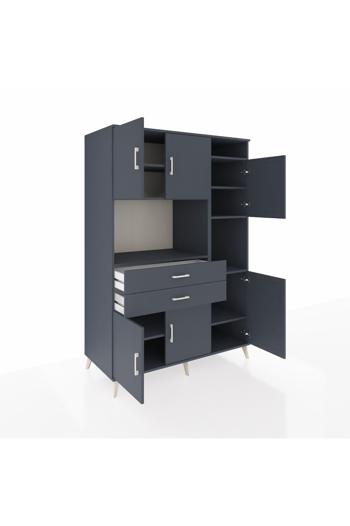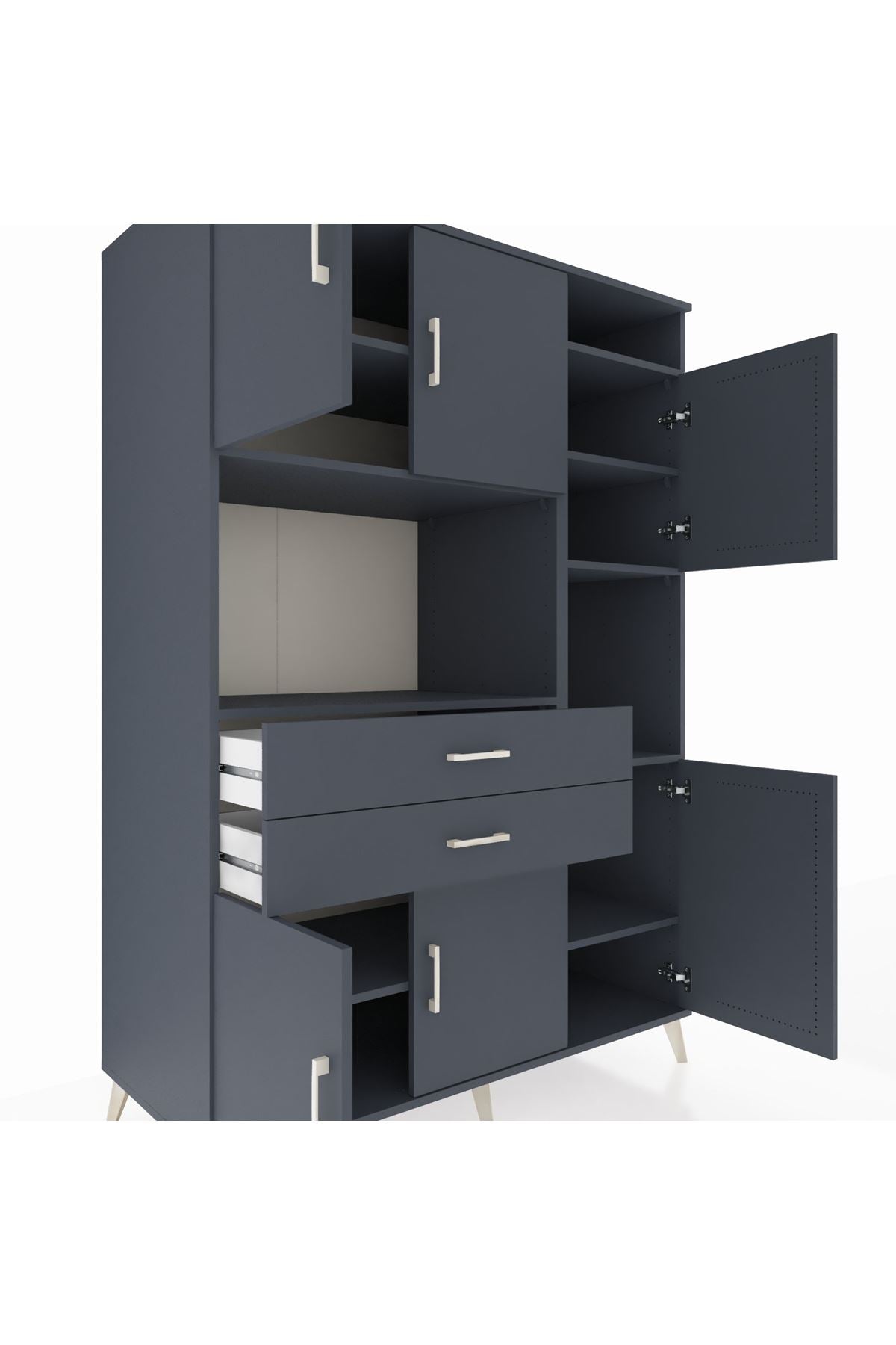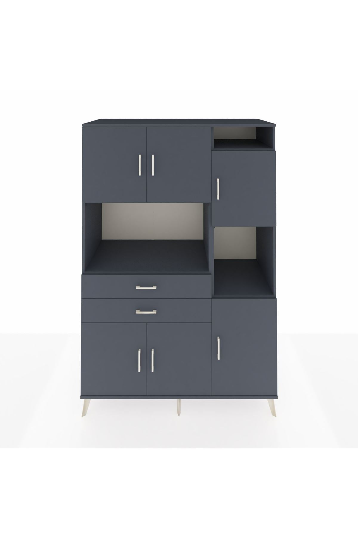 Modern ve zamansız antrasit tonlarının hakim olduğu bu özel tasarım, 132x59x195 cm ölçüsüyle maksimum depolama alanını şık bir zarafetle buluşturuyor.