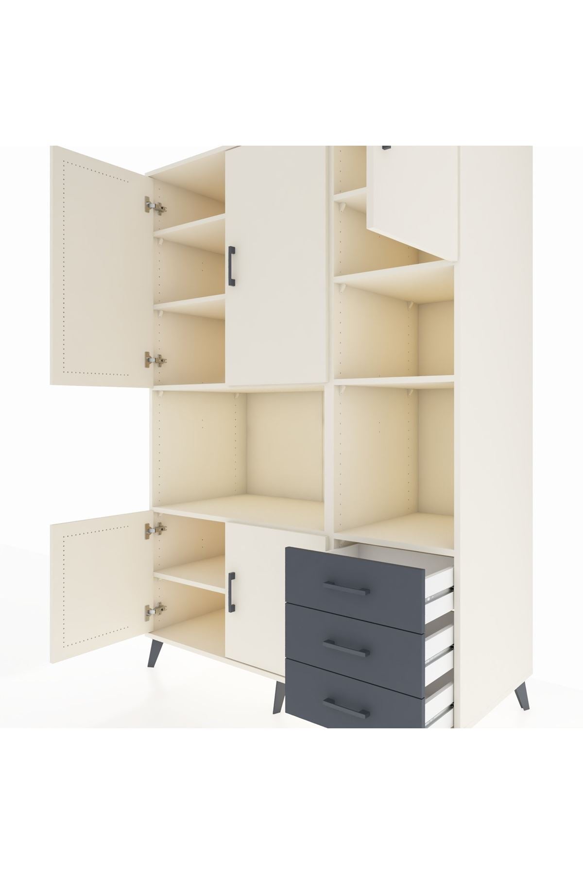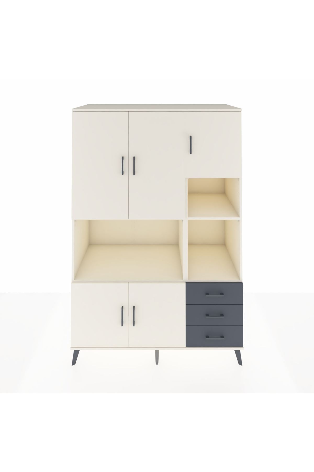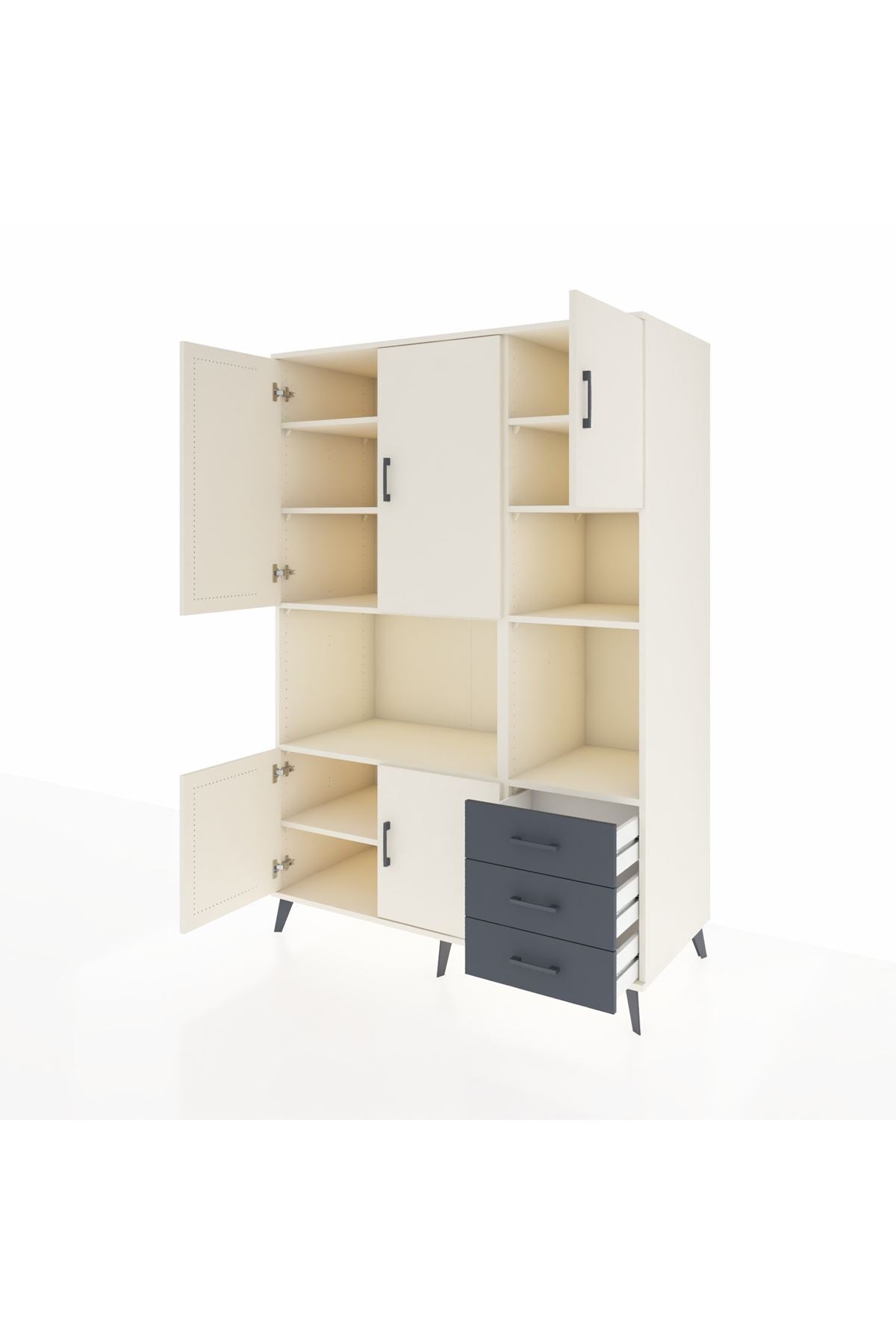 Aytaşı ve antrasit renklerin modern uyumu, 9 geniş raf, 3 kullanışlı çekmece ve 5 kapak ile her alanı düzenli ve şık tutar.