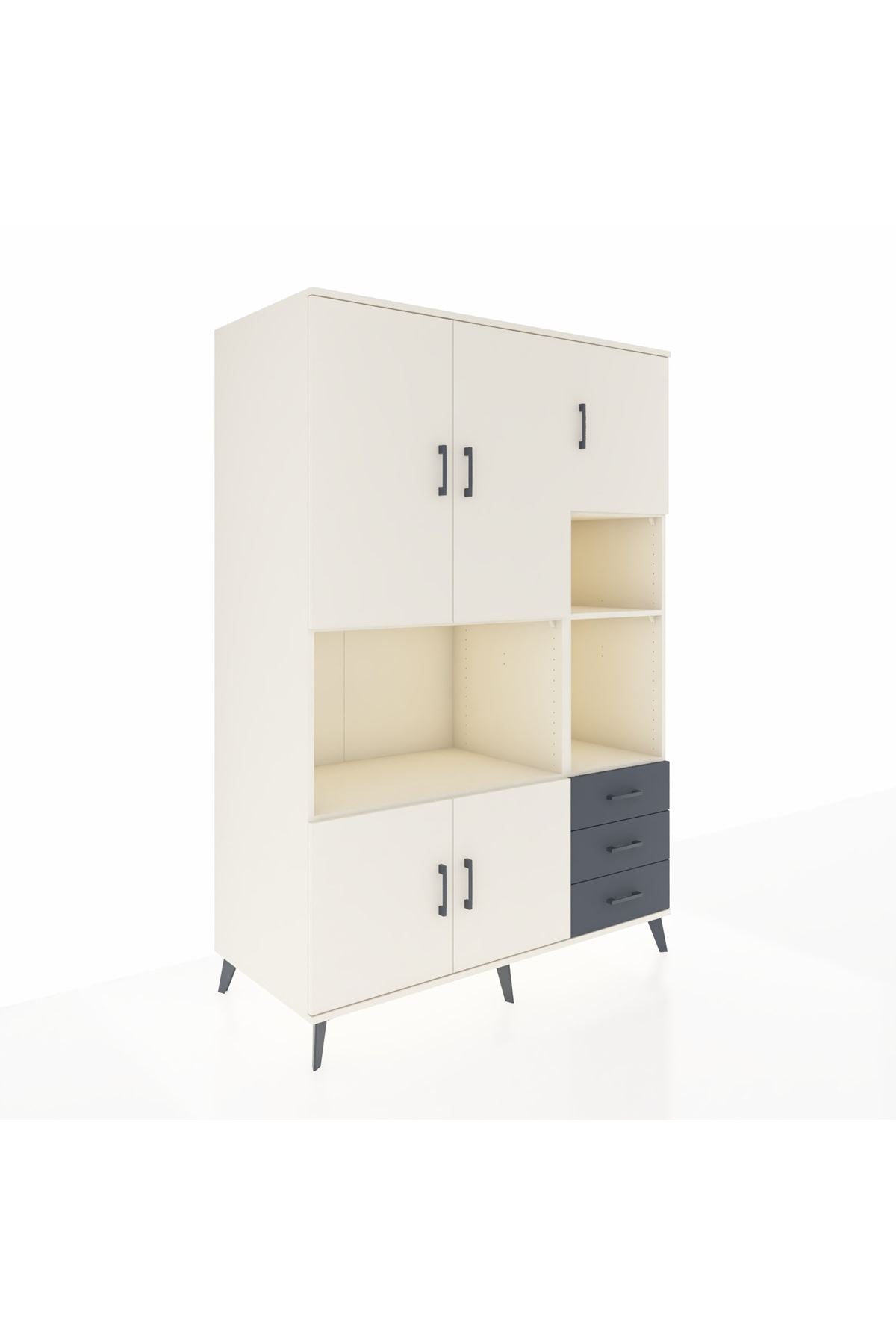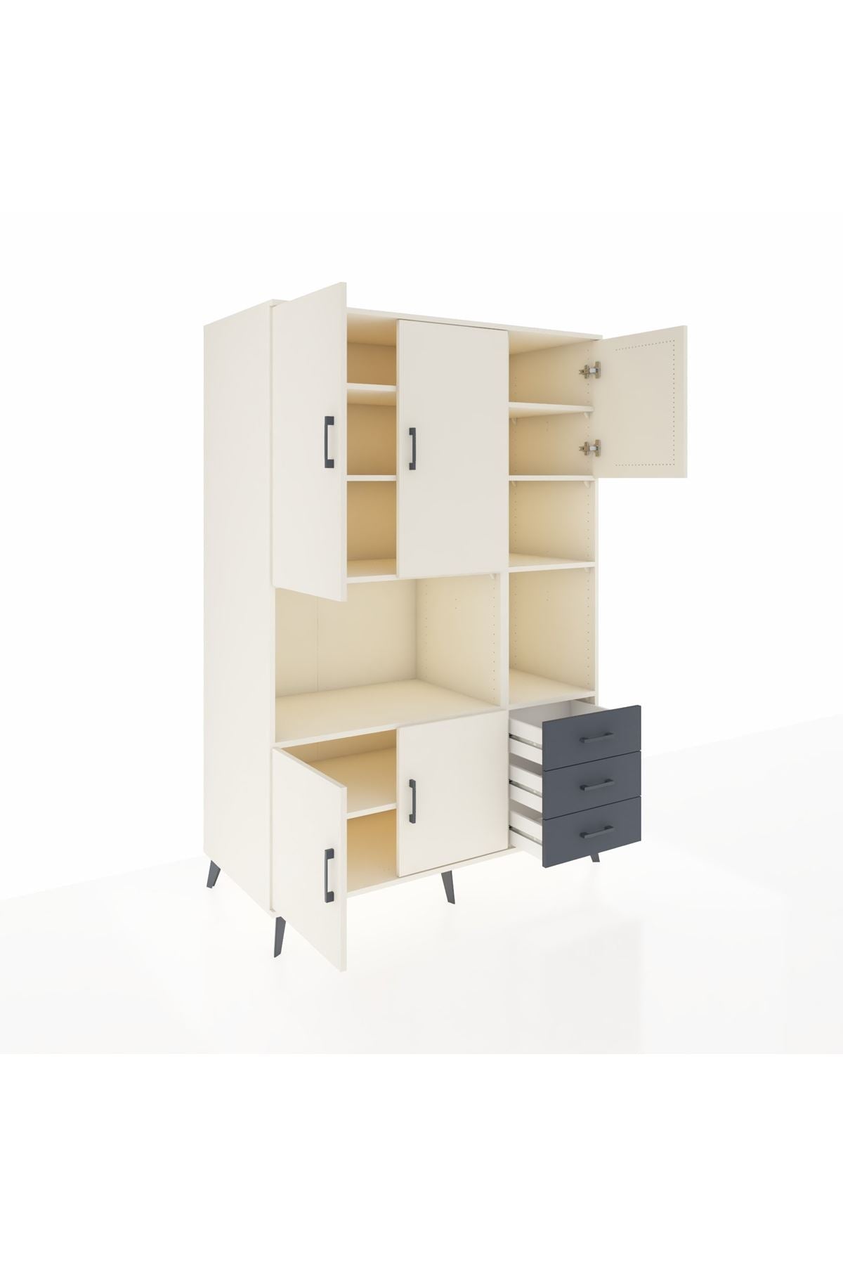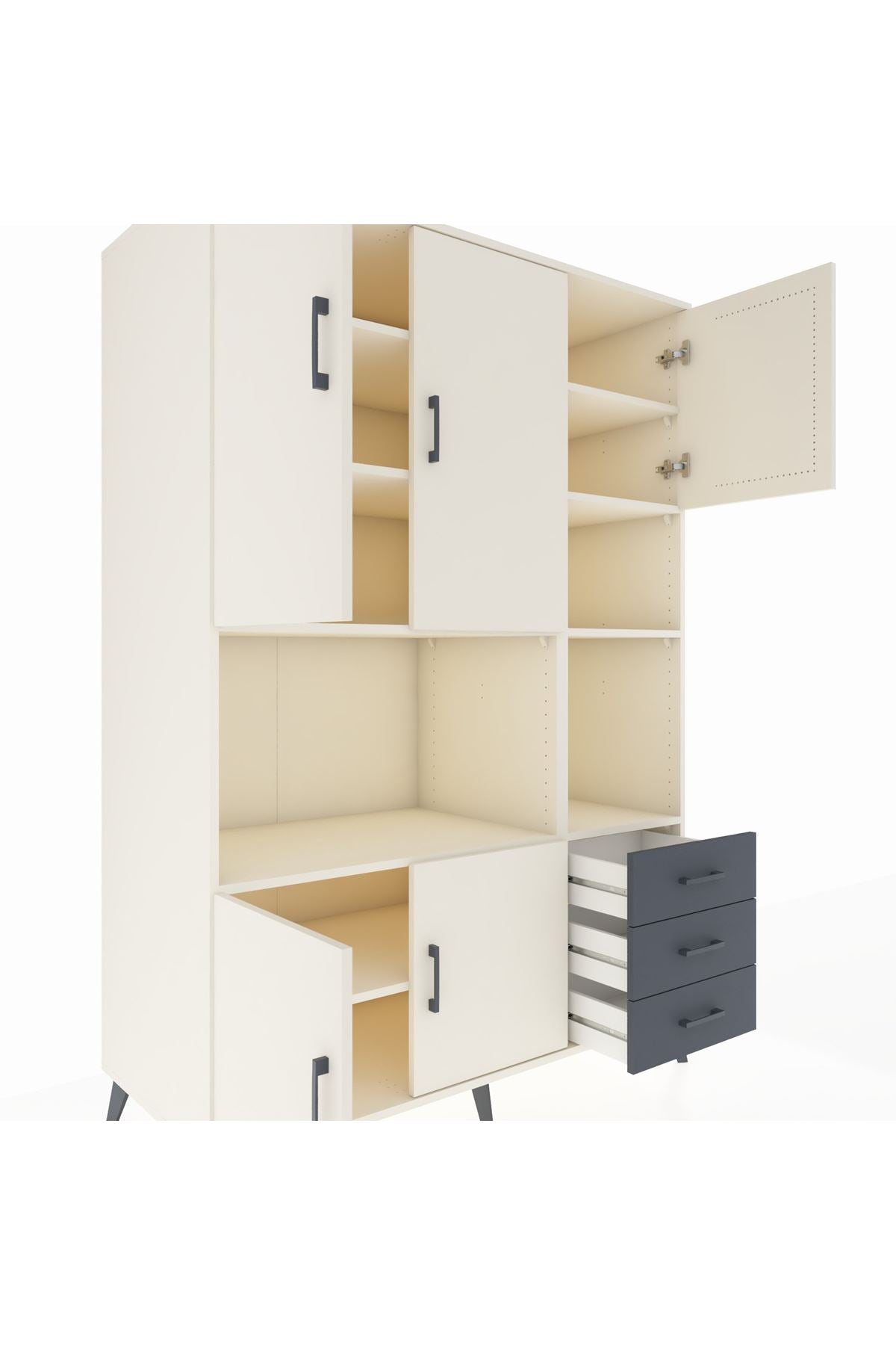 Aytaşı ve antrasit renklerin modern uyumu, 9 geniş raf, 3 kullanışlı çekmece ve 5 kapak ile her alanı düzenli ve şık tutar.
