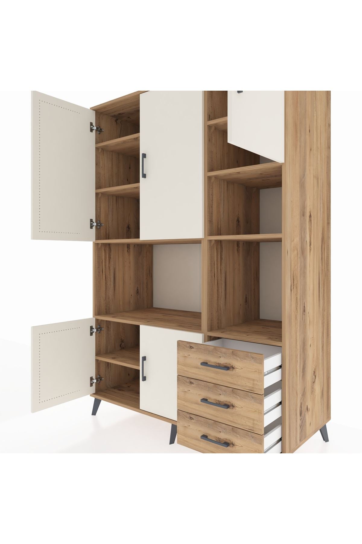🌟 Kronos Dolap 9 Raflı 3 Çekmeceli 5 Kapaklı 132x59x195 Çam-Aytaşı/Çam