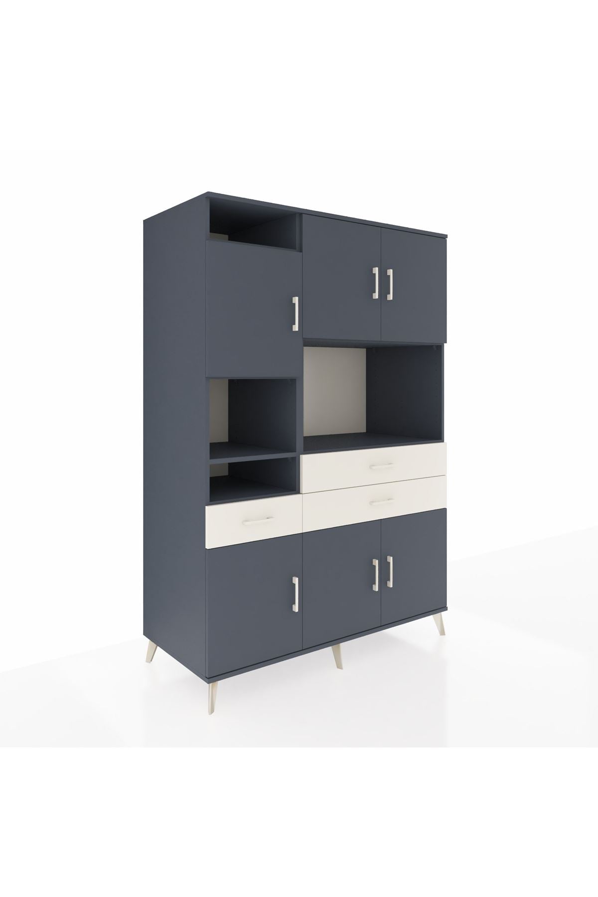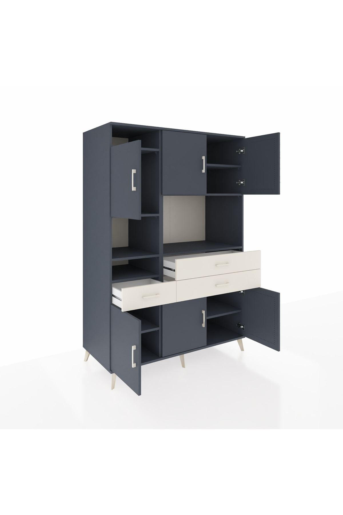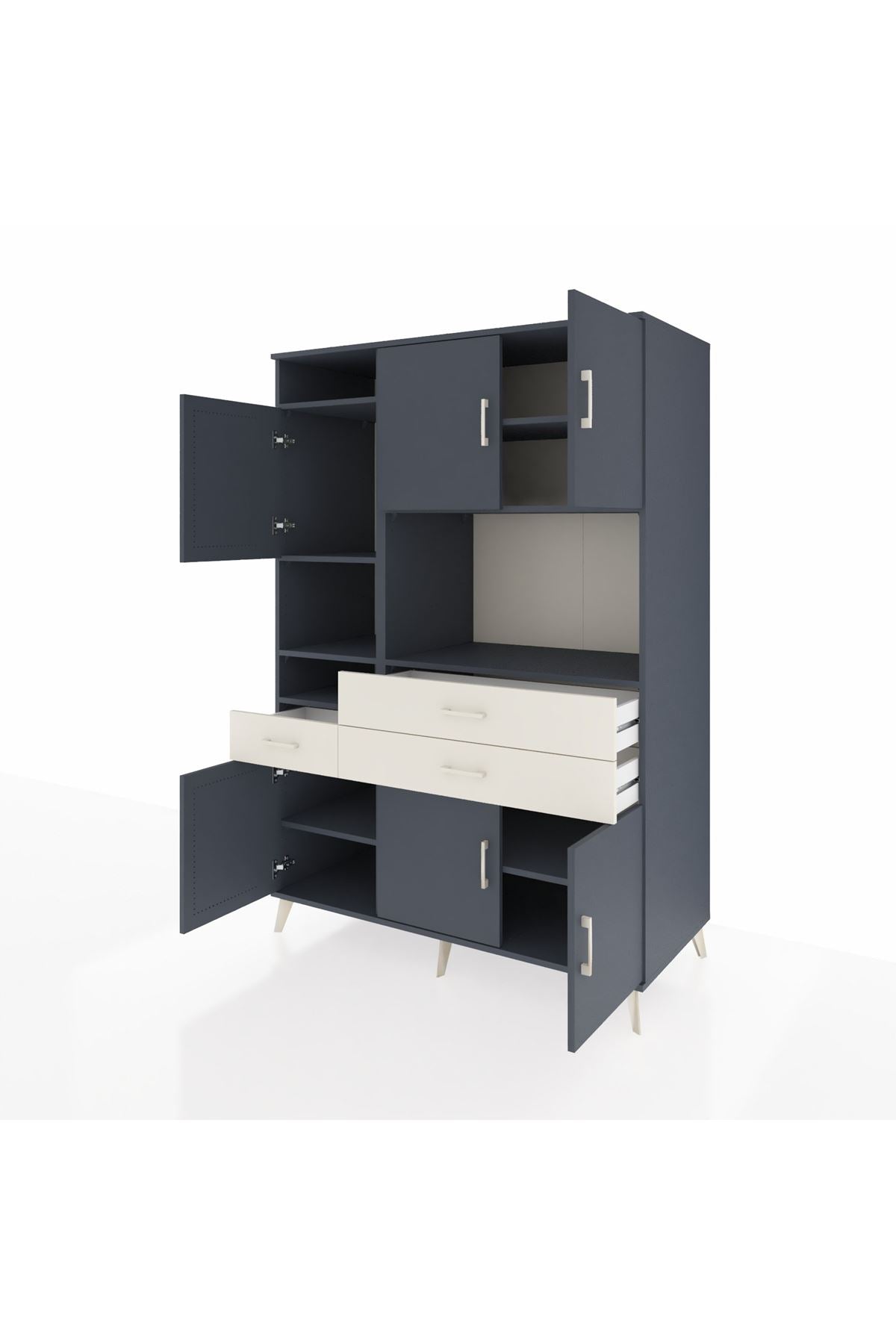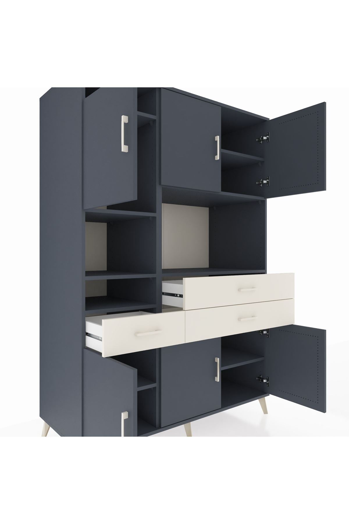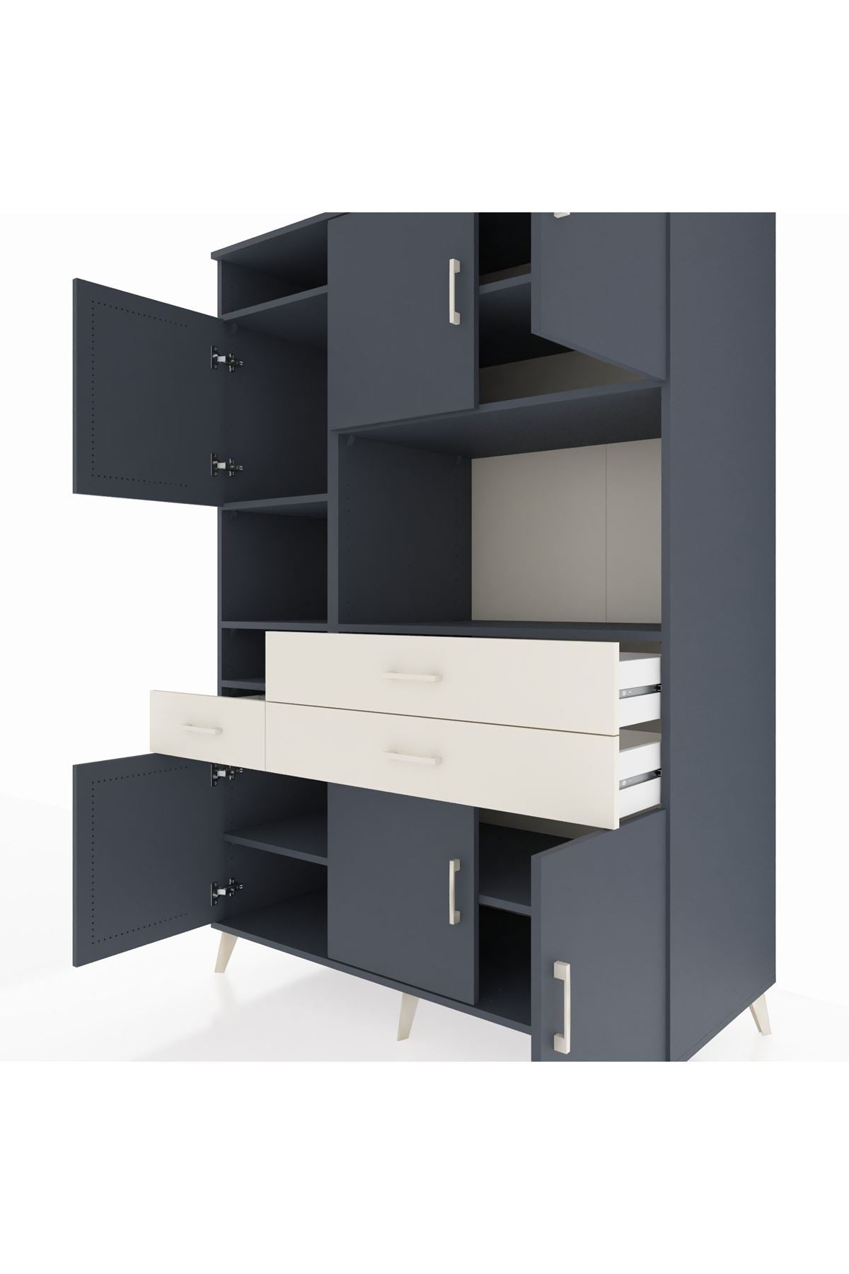 Dolabımızda 9 raf, 3 çekmece ve 6 kapak yer alır. Böylece geniş depolama alanı ve düzenli kullanım sunar. Metal ayak ve metal kulp detayları, dayanıklılığı ve modern görünümü bir arada taşır.