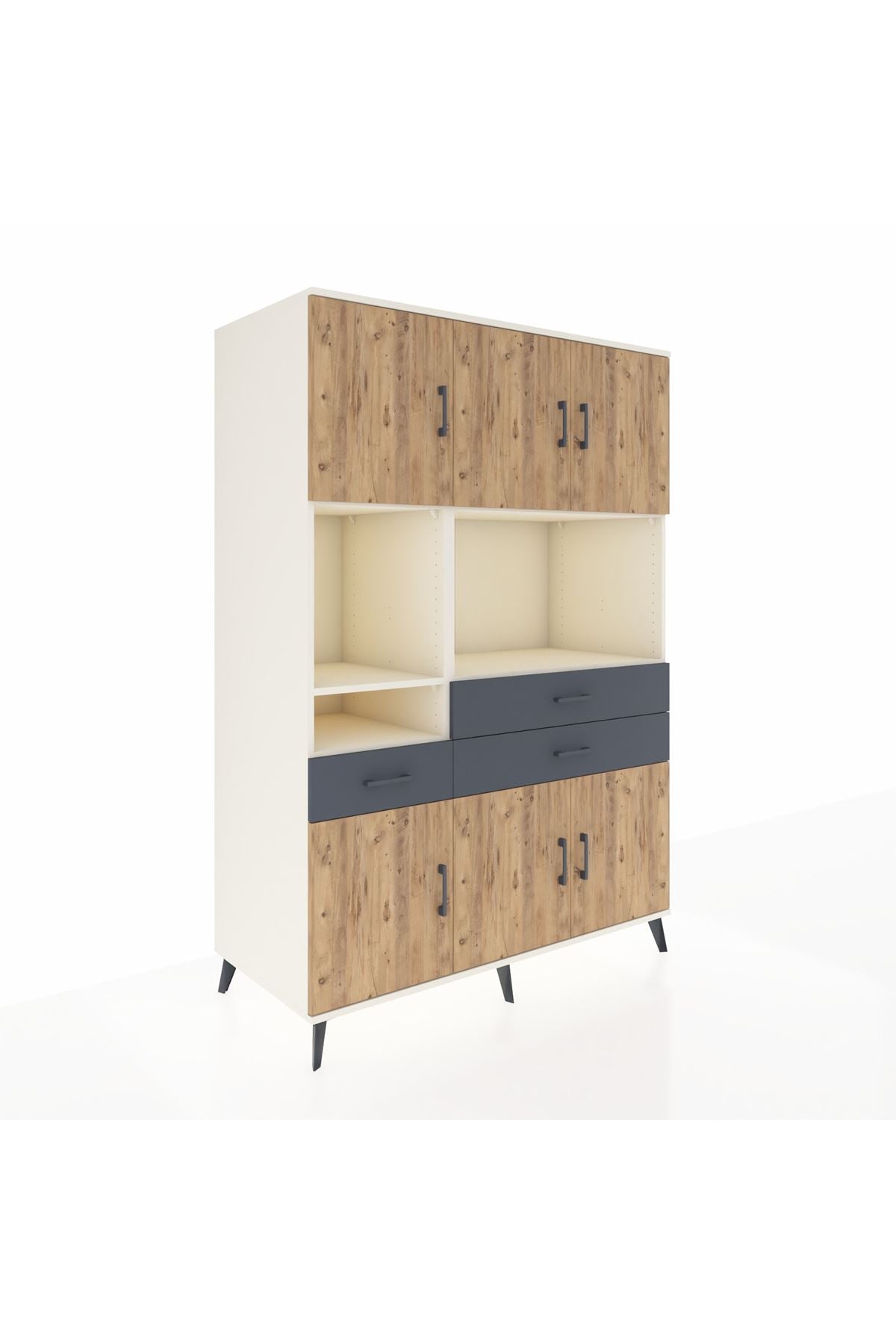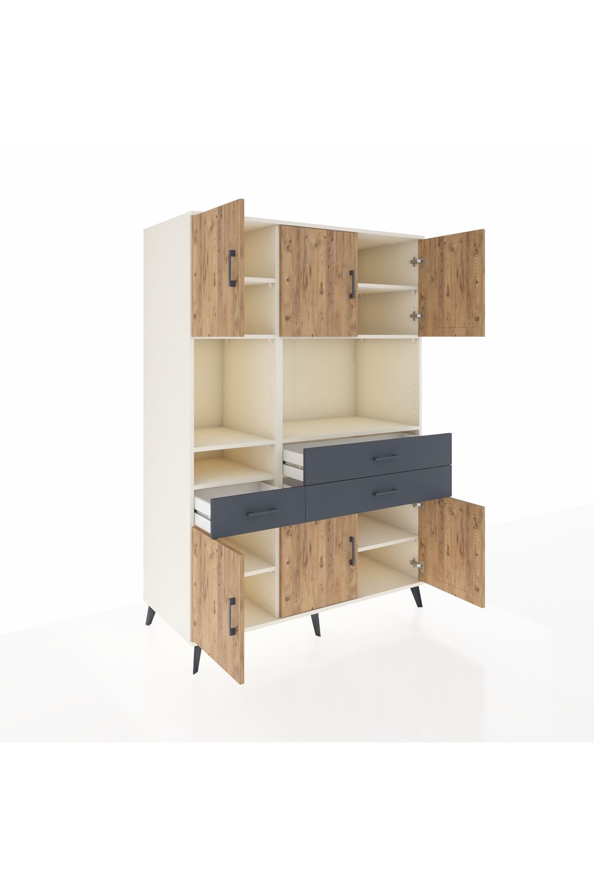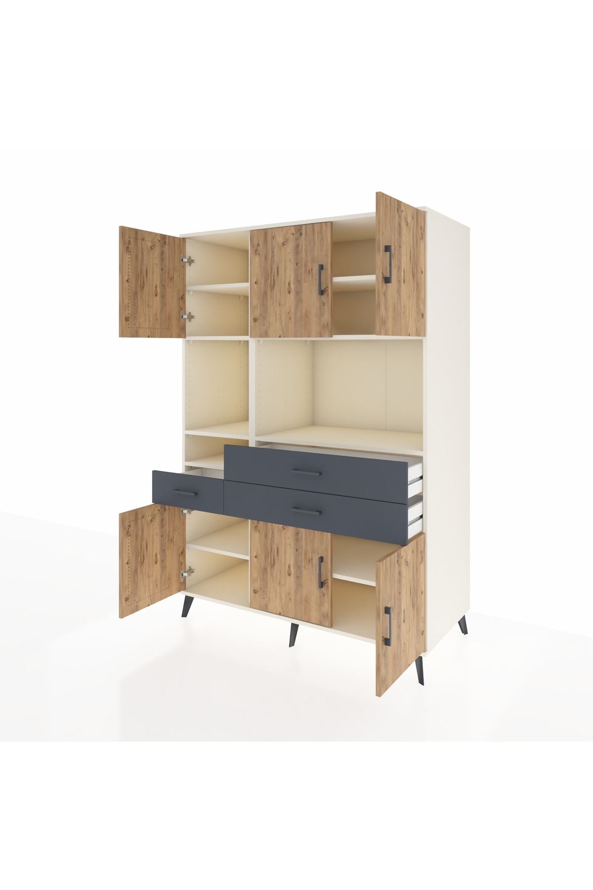 9 geniş raf, 3 kullanışlı çekmece ve 6 kapaklı bölmesiyle maksimum depolama sunar 🗄️ Aytaşı-Çam gövde ile Antrasit kapakların uyumu, modern dekorasyonlara mükemmel uyum sağlar 🌲🎨 132 cm genişlik, 59 cm derinlik ve 195 cm yükseklik ile büyük eşyalarınızı bile düzenli tutmanıza yardımcı olur.