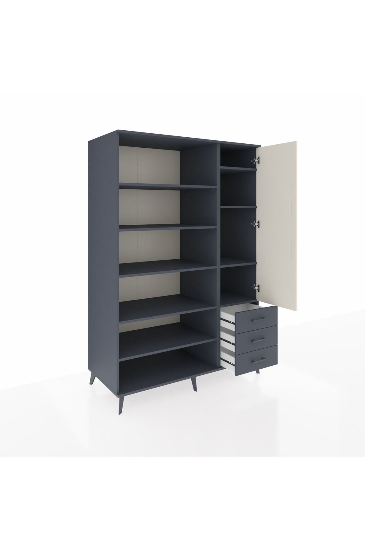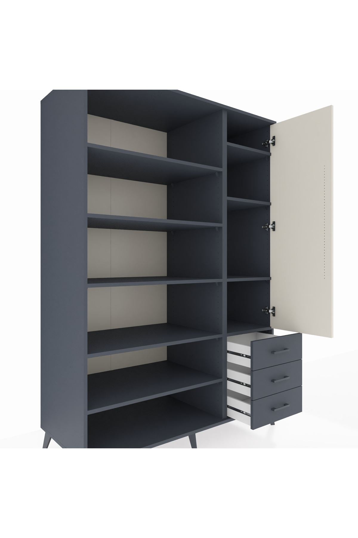 132 cm genişliği, 59 cm derinliği ve 195 cm yüksekliği ile geniş bir depolama alanı sunar. 9 adet rafı, 5 çekmecesi ve 3 kapaklı bölmesiyle kıyafetlerden evraklara, mutfak eşyalarından kitaplara kadar her şeyi düzenli bir şekilde saklayabilirsiniz. Metal ayak ve metal kulp detayları hem dayanıklılık hem de şıklık sunar.