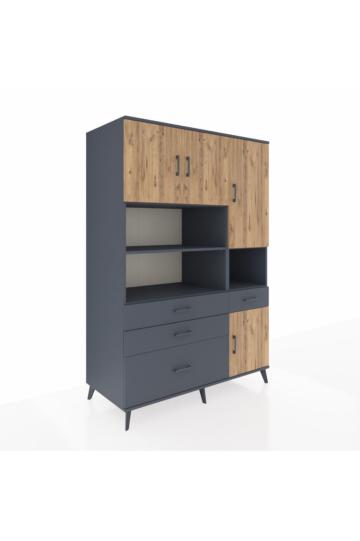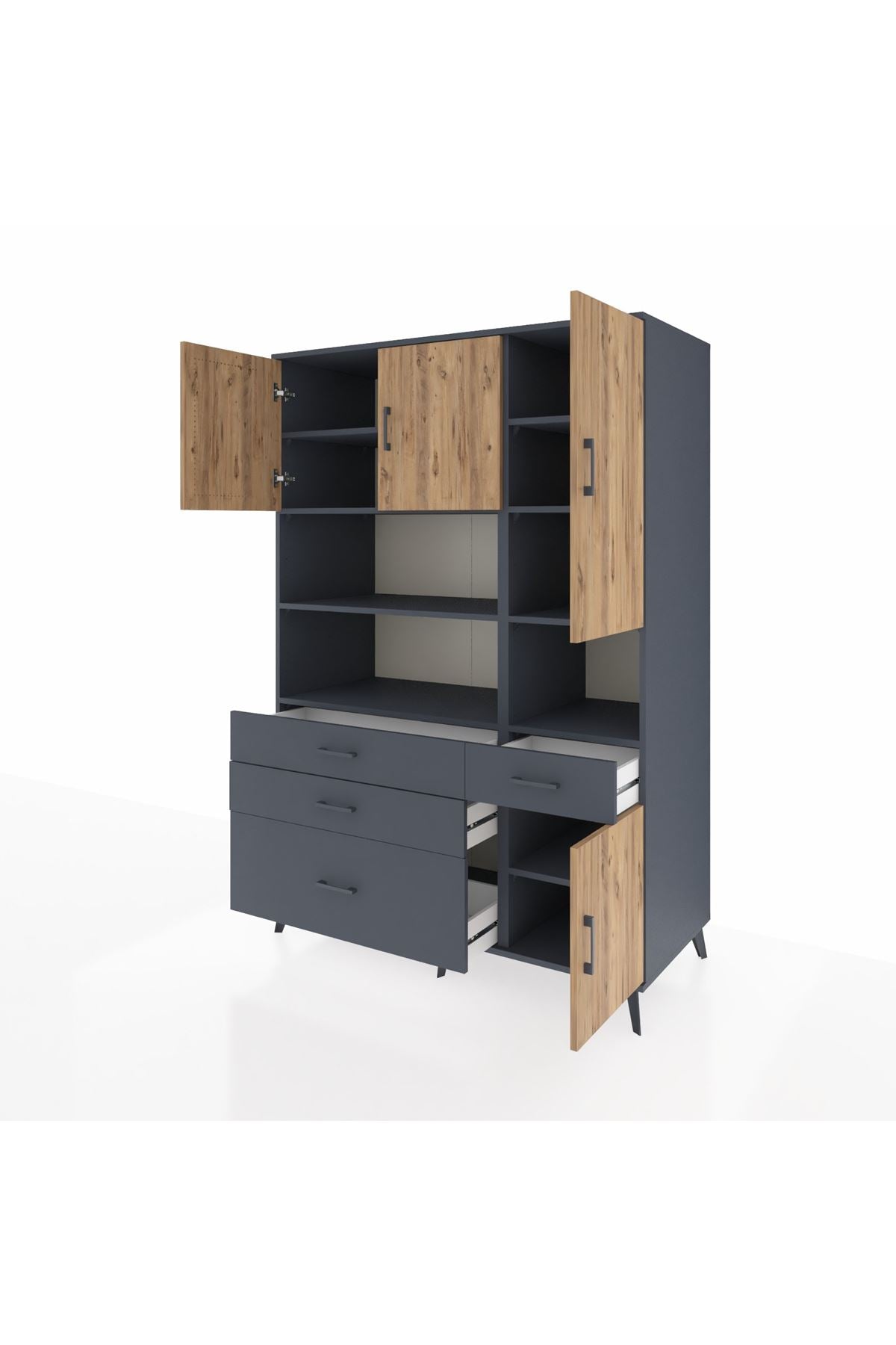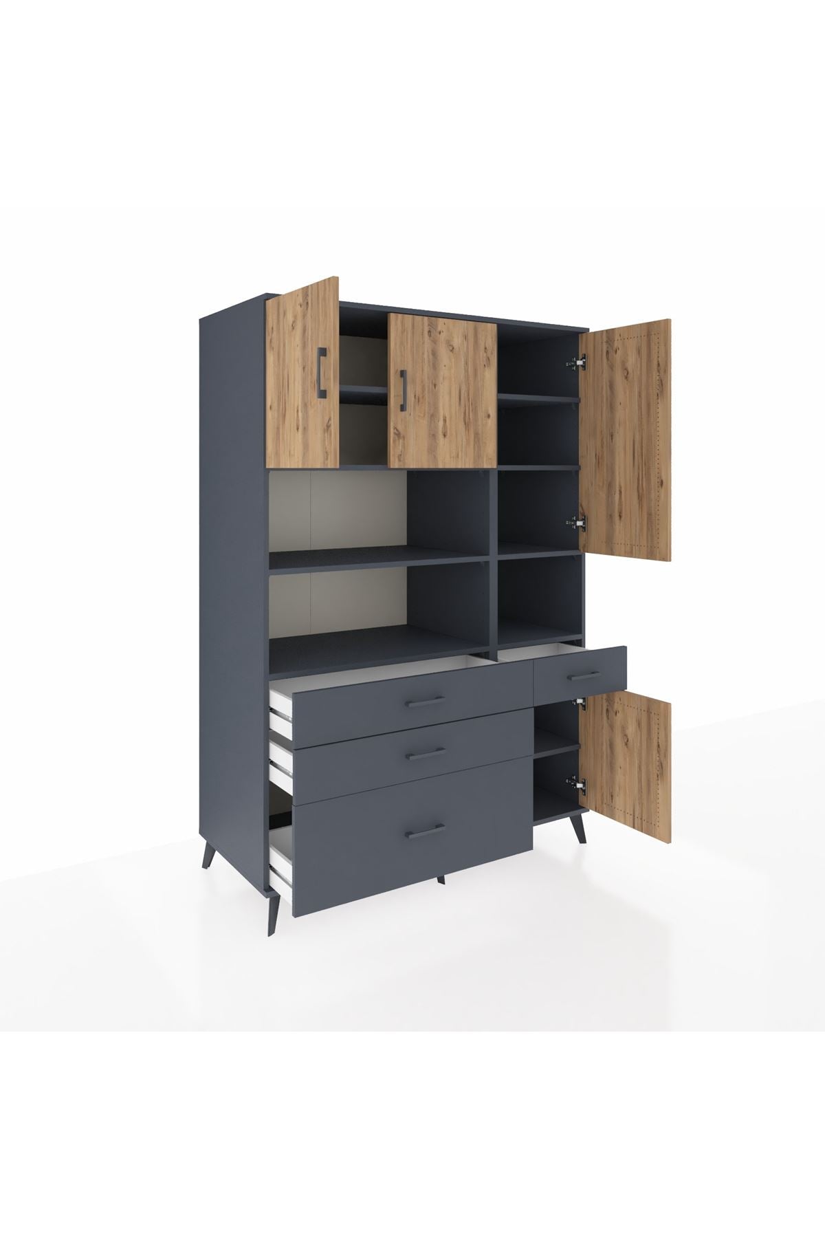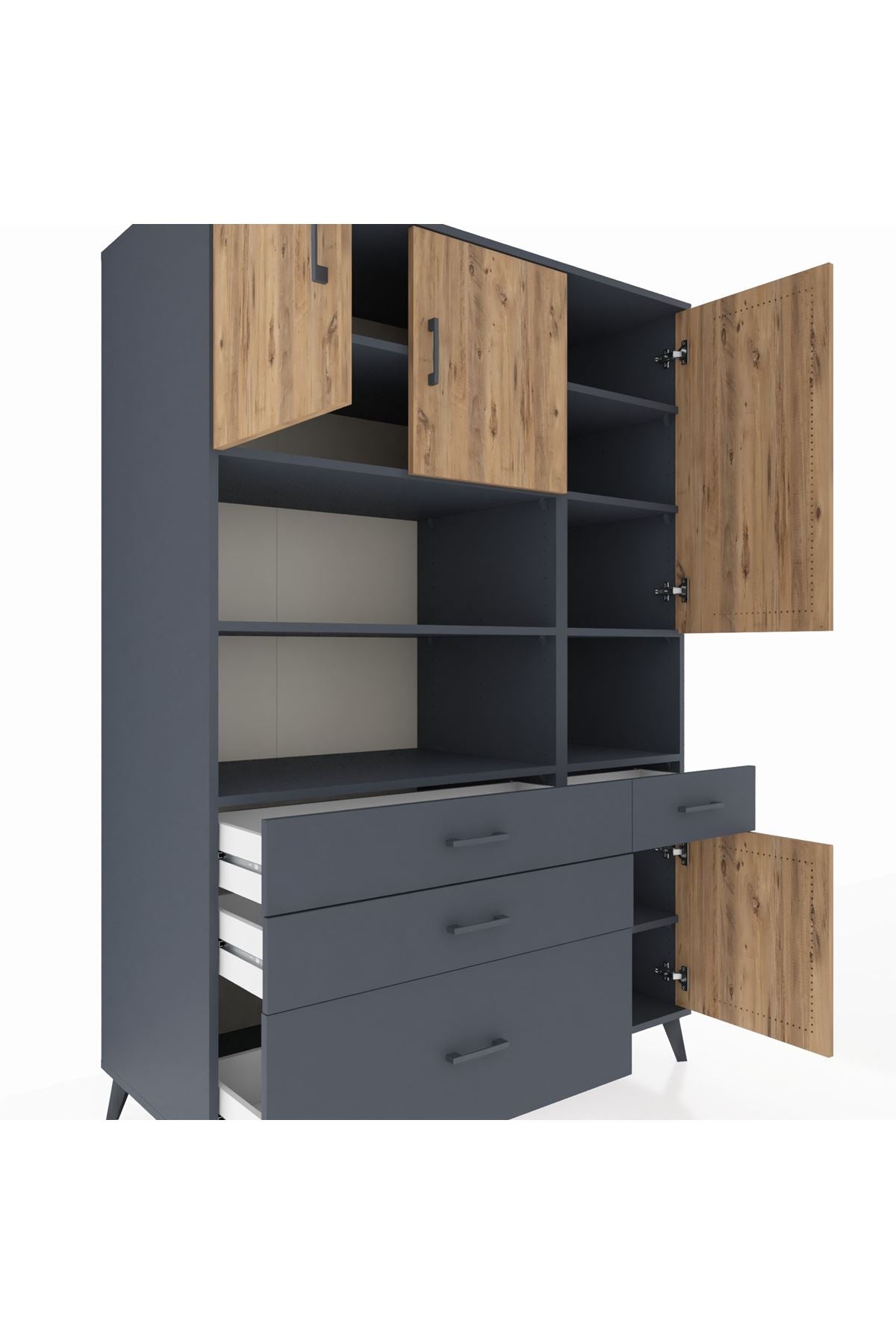 🗄️ Kronos Dolap 9 Raflı 4 Çekmeceli 4 Kapaklı 132x59x195 Antrasit-Çam/Antrasit ile yaşam alanınıza modern bir dokunuş ve maksimum depolama kazandırın! 🌟 Tam 132 cm genişlik, 59 cm derinlik ve 195 cm yükseklikle; hem odanıza şıklık katar hem de inanılmaz bir düzen sağlar. Antrasit ve atlas çamın göz alıcı uyumu, mekanınıza sofistike bir hava getirir. ✨