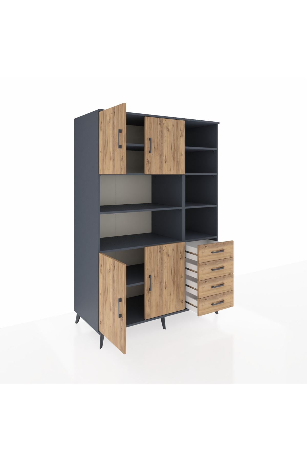 🪐 Kronos Dolap 9 Raflı 4 Çekmeceli 4 Kapaklı 132x59x195 Antrasit-Çam/Çam ile geniş depolama alanını ve modern şıklığı bir araya getirin!
