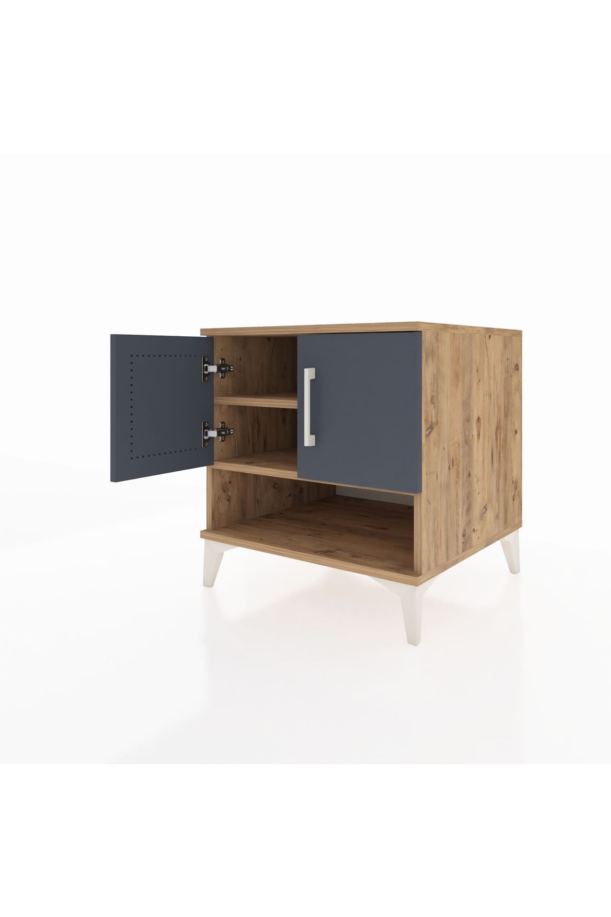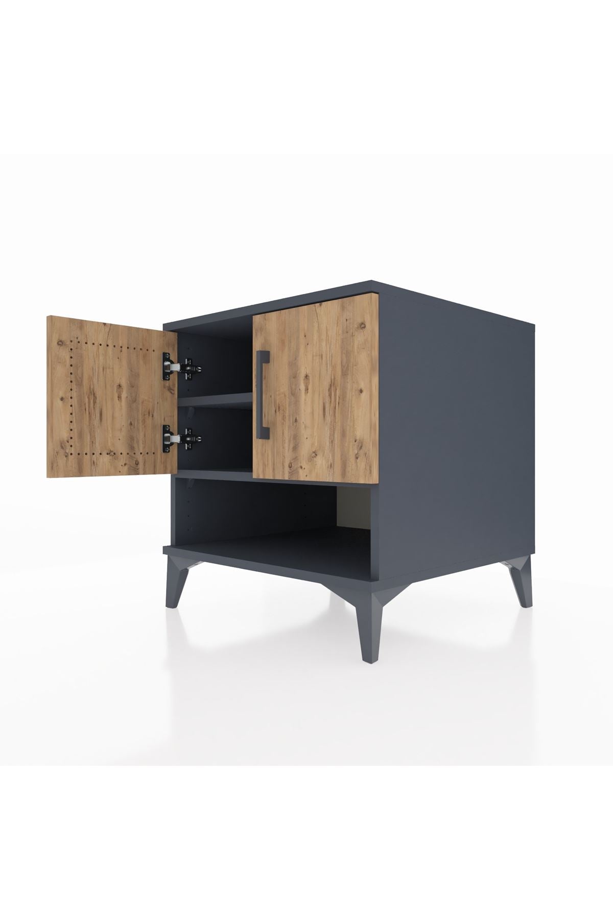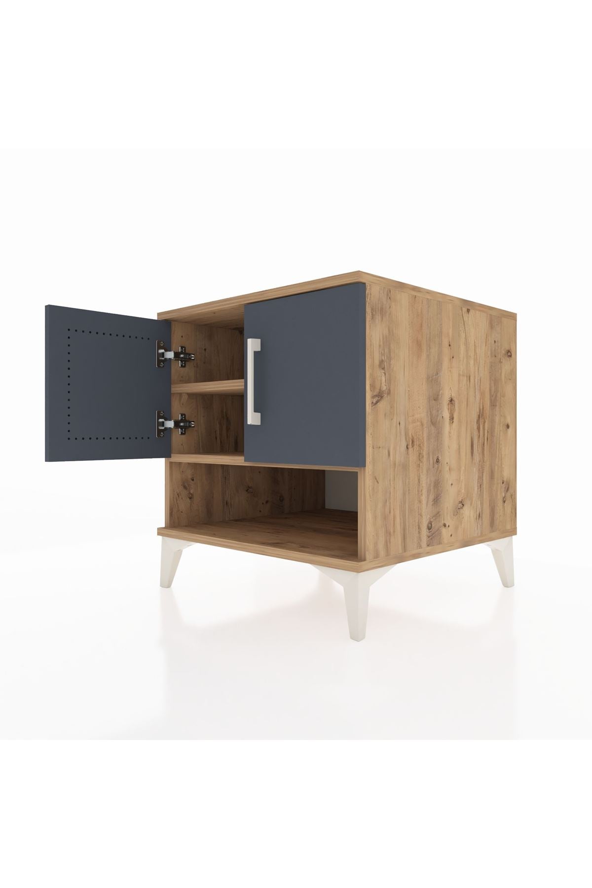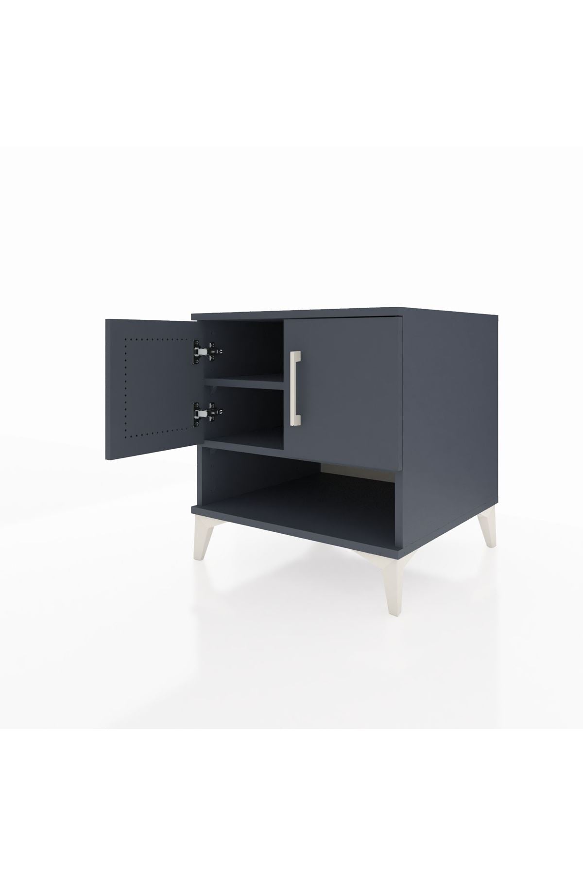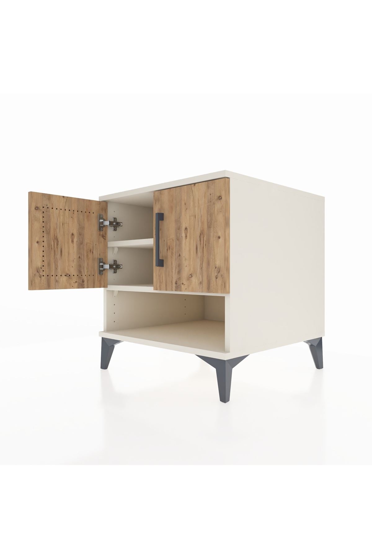 🦾 Komodinin şıklığını ve sağlamlığını destekleyen metal ayaklar, hem modern bir görünüm sunar hem de zemine sağlam bir şekilde oturmasını sağlar. Zarif metal kulplar ise kapakların kolayca açılmasını sağlarken, tasarıma sofistike bir dokunuş katar.