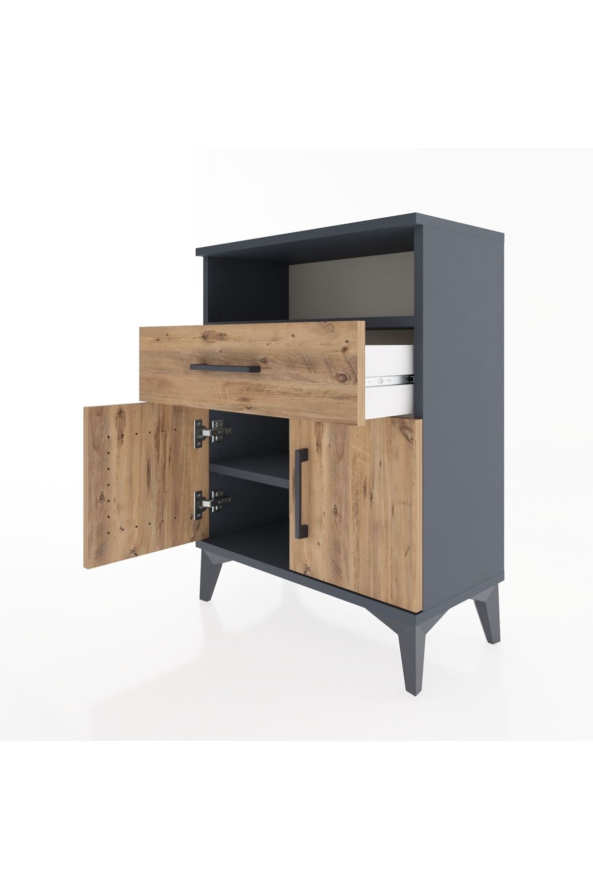 Bu komodin, evinizde düzen ve estetik bütünlüğü sağlar. Antrasit-Çam kombinasyonu modern ve sıcak bir duruş sunar; doğal ahşap dokusu ile koyu gri tonları dengeler. Metal ayaklar sağlamlık kazandırırken metal kulplar çekmece ve kapak kullanımında uzun ömürlü performans sunar. Tek raf, iki çekmece ve iki kapaklı alt bölme pratik saklama çözümleri getirir; raflar ayarlanabilir, çekmece sayısı konfigüre edilebilir.