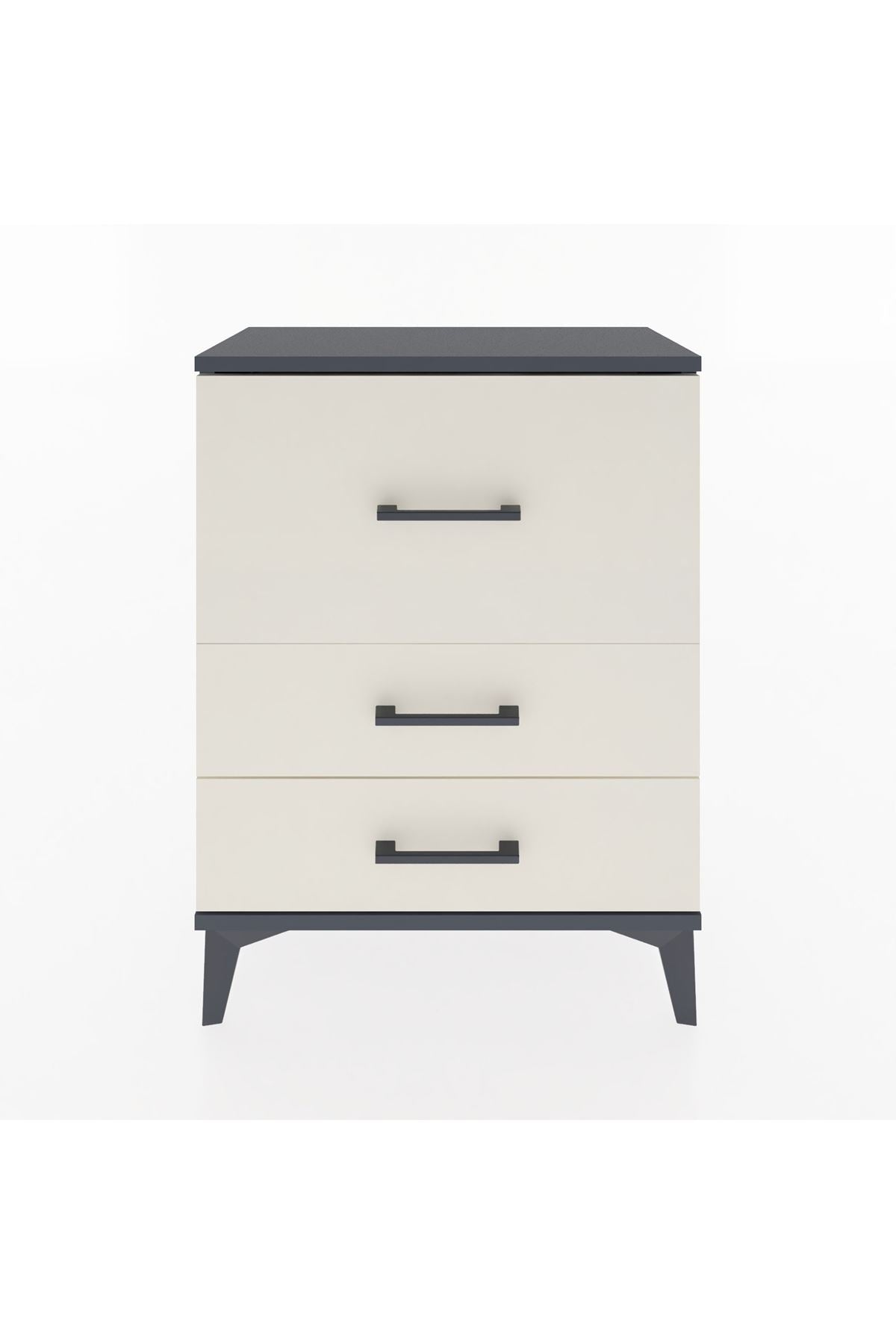 Bu komodin, evinizde düzen ve estetik uyumu bir araya getirir. Aytaşı ve antrasit kombinasyonu ile soft bir kontrast sunar; üst yüzeyin koyu antrasit rengi ile gövdenin aytaşı tonu modern ve sakin bir görünüm oluşturur. Metal ayaklar uzun ömürlü sağlamlık sağlar, metal kulplar ise sık kullanıma dayanacak şekilde tasarlanmıştır. Ürün tek raflı temel yapıdadır; raf konumu ihtiyaca göre ayarlanabilir ve çekmece sayısı konfigüre edilebilir, böylece depolama alanı kullanımınıza özel şekilde düzenlenebilir.
